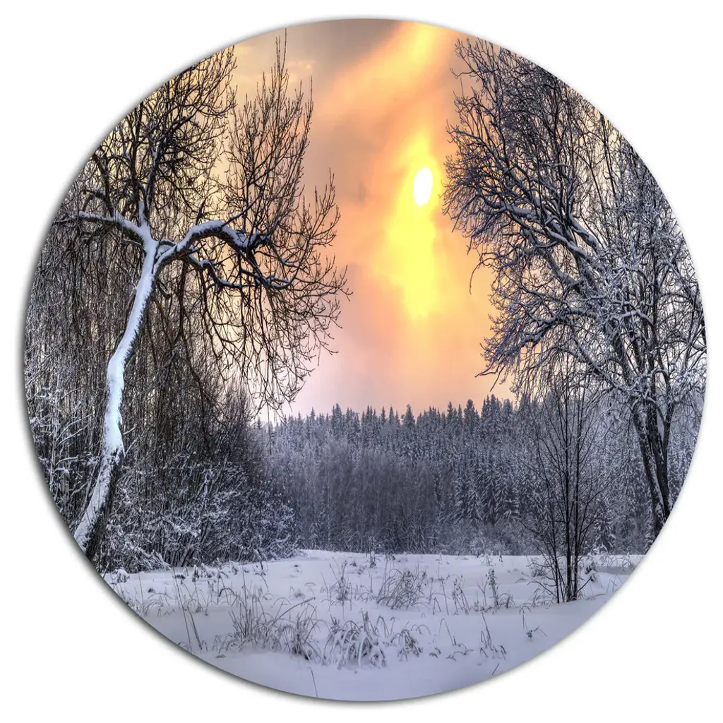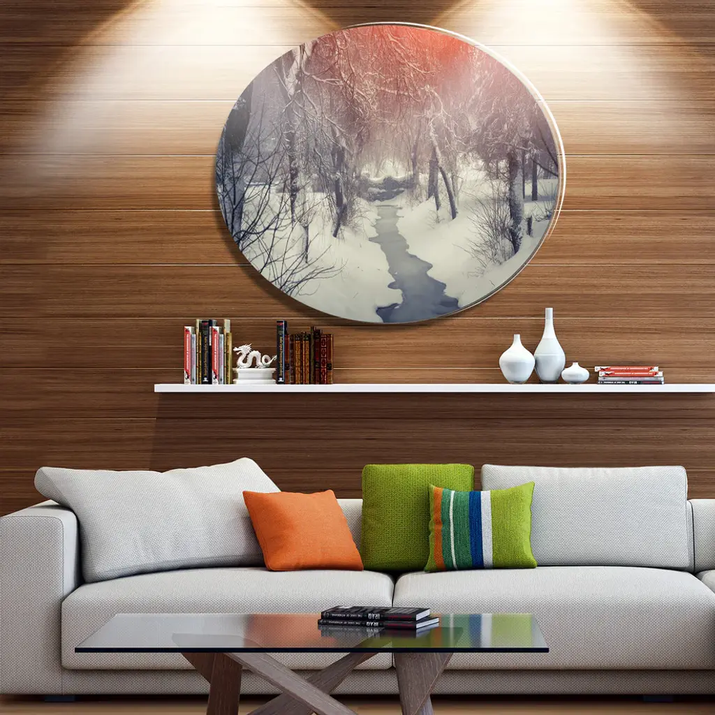 Bring Contemporary Abstraction to your home with this large Circle Metal wall art. This Beautiful Snowfall in City Park Metal Artwork makes it the focal point of any room or office. - White Gloss Coating ensures colors are extra vibrant with light reflection.- Aluminum grade Sheet Metal with 1 inch mounting frame on the back giving the illusion that the artwork is floating on the wall..- Mounting Brackets are included along with instructions.- High Quality Digital images are created directly into a glossy aluminum panel producing a stunning and captivating print into the glossy finish of the metal.- Water, Fire and Scratch resistant HD Aluminum panels.- Looks better than any photo paper and guaranteed to last at least 20 years- Easy to clean with a microfiber cloth. Colors are far superior to regular Canvas Art. - Easy to Hang