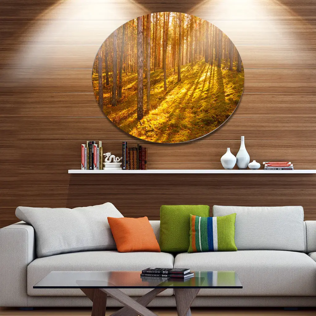 Bring Contemporary Abstraction to your home with this large Circle Metal wall art. This Beautiful Sunrays in Thick Forest Metal Artwork makes it the focal point of any room or office. - White Gloss Coating ensures colors are extra vibrant with light reflection.- Aluminum grade Sheet Metal with 1 inch mounting frame on the back giving the illusion that the artwork is floating on the wall..- Mounting Brackets are included along with instructions.- High Quality Digital images are created directly into a glossy aluminum panel producing a stunning and captivating print into the glossy finish of the metal.- Water, Fire and Scratch resistant HD Aluminum panels.- Looks better than any photo paper and guaranteed to last at least 20 years- Easy to clean with a microfiber cloth. Colors are far superior to regular Canvas Art. - Easy to Hang