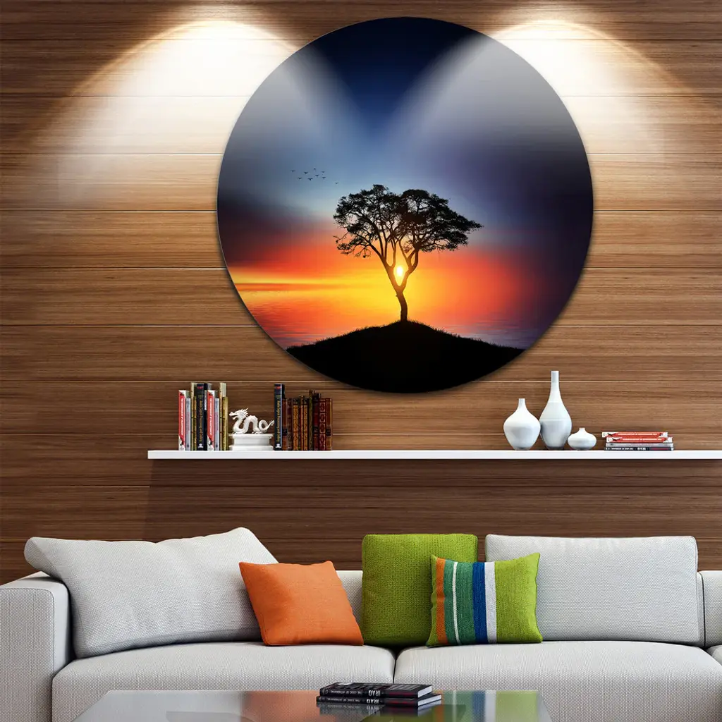 Beautiful Sunset Over Lonely Tree, Disc Metal Artwork Landscape, 36"