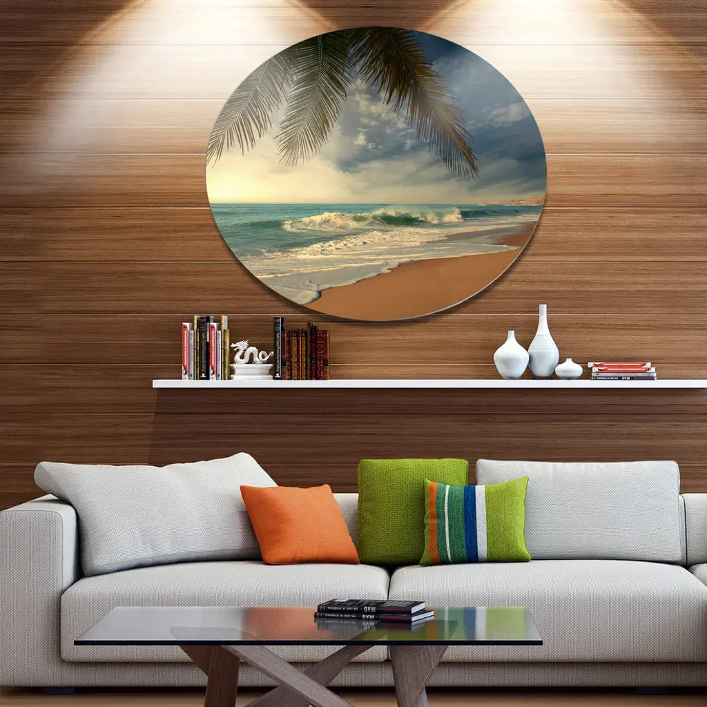 Bring Contemporary Abstraction to your home with this large Circle Metal wall art. This Beautiful Tropical Beach with Palms Metal Artwork makes it the focal point of any room or office. - White Gloss Coating ensures colors are extra vibrant with light reflection.- Aluminum grade Sheet Metal with 1 inch mounting frame on the back giving the illusion that the artwork is floating on the wall..- Mounting Brackets are included along with instructions.- High Quality Digital images are created directly into a glossy aluminum panel producing a stunning and captivating print into the glossy finish of the metal.- Water, Fire and Scratch resistant HD Aluminum panels.- Looks better than any photo paper and guaranteed to last at least 20 years- Easy to clean with a microfiber cloth. Colors are far superior to regular Canvas Art. - Easy to Hang