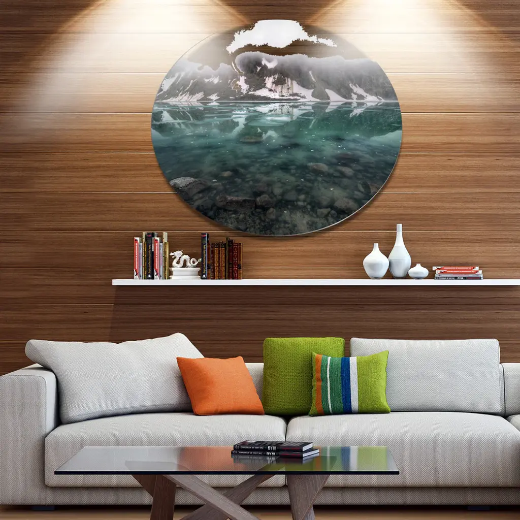 Bring Contemporary Abstraction to your home with this large Circle Metal wall art. This Beautiful Turquoise Mountain Lake Metal Artwork makes it the focal point of any room or office. - White Gloss Coating ensures colors are extra vibrant with light reflection.- Aluminum grade Sheet Metal with 1 inch mounting frame on the back giving the illusion that the artwork is floating on the wall..- Mounting Brackets are included along with instructions.- High Quality Digital images are created directly into a glossy aluminum panel producing a stunning and captivating print into the glossy finish of the metal.- Water, Fire and Scratch resistant HD Aluminum panels.- Looks better than any photo paper and guaranteed to last at least 20 years- Easy to clean with a microfiber cloth. Colors are far superior to regular Canvas Art. - Easy to Hang