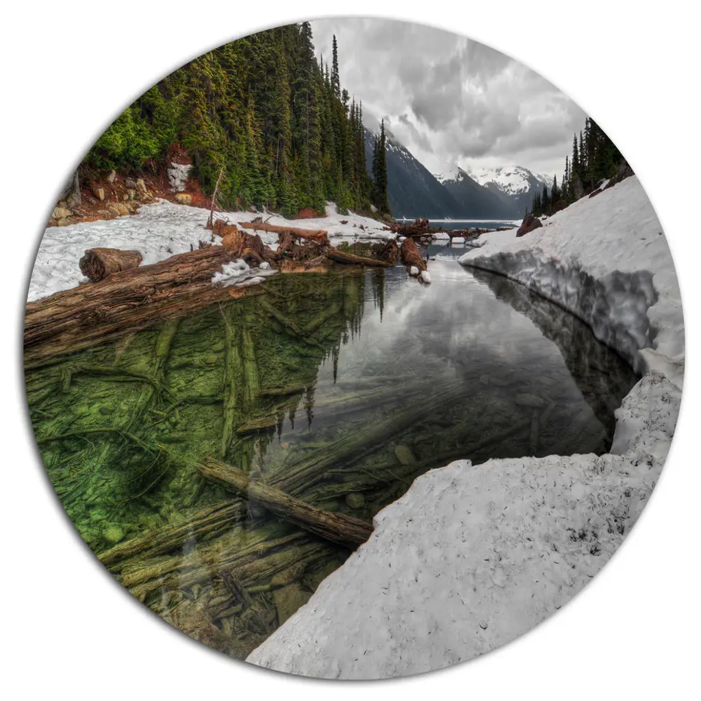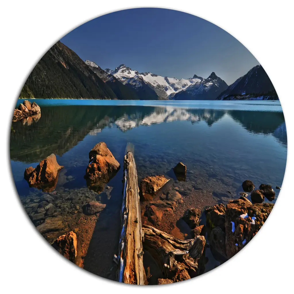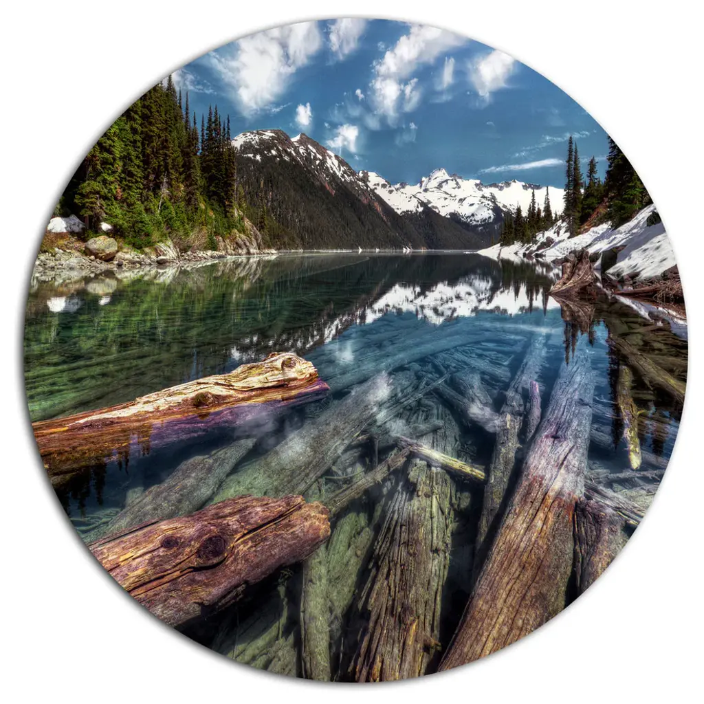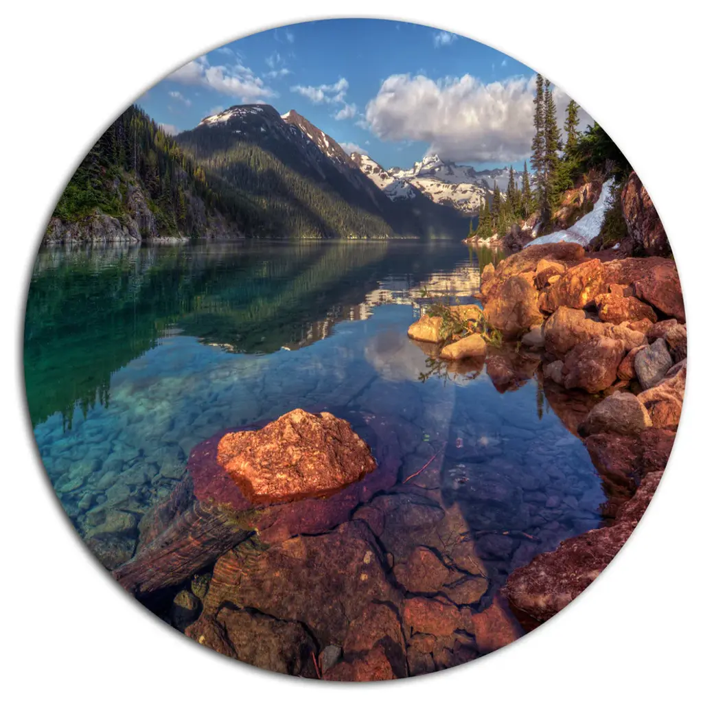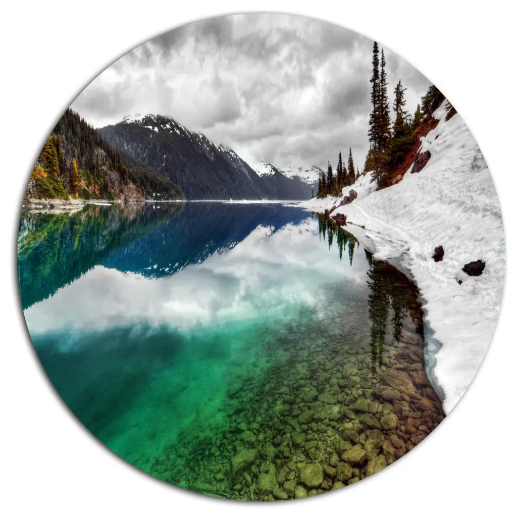 Bring Contemporary Abstraction to your home with this large Circle Metal wall art. This Beautiful View of Mountain Lake Metal Artwork makes it the focal point of any room or office. - White Gloss Coating ensures colors are extra vibrant with light reflection.- Aluminum grade Sheet Metal with 1 inch mounting frame on the back giving the illusion that the artwork is floating on the wall..- Mounting Brackets are included along with instructions.- High Quality Digital images are created directly into a glossy aluminum panel producing a stunning and captivating print into the glossy finish of the metal.- Water, Fire and Scratch resistant HD Aluminum panels.- Looks better than any photo paper and guaranteed to last at least 20 years- Easy to clean with a microfiber cloth. Colors are far superior to regular Canvas Art. - Easy to Hang