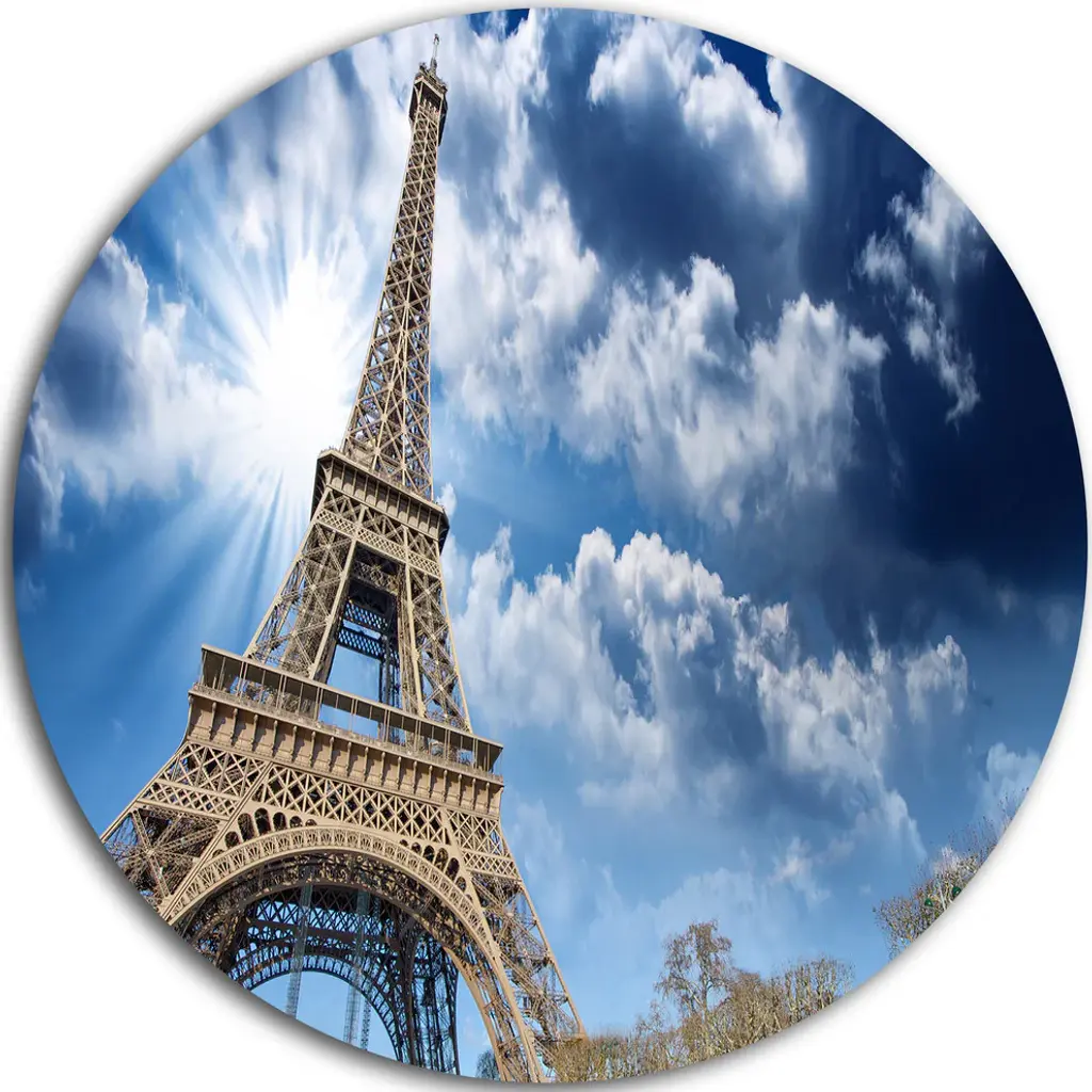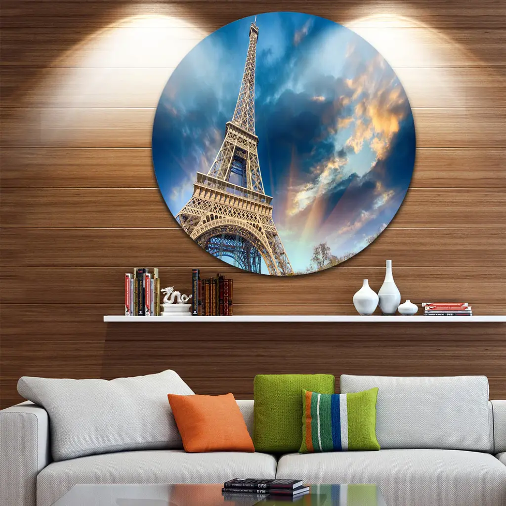 Bring Contemporary Abstraction to your home with this large Circle Metal wall art. This Beautiful View of Paris Eiffel Tower under Fiery Sky Metal Artwork makes it the focal point of any room or office. - White Gloss Coating ensures colors are extra vibrant with light reflection.- Aluminum grade Sheet Metal with 1 inch mounting frame on the back giving the illusion that the artwork is floating on the wall..- Mounting Brackets are included along with instructions.- High Quality Digital images are created directly into a glossy aluminum panel producing a stunning and captivating print into the glossy finish of the metal.- Water, Fire and Scratch resistant HD Aluminum panels.- Looks better than any photo paper and guaranteed to last at least 20 years- Easy to clean with a microfiber cloth. Colors are far superior to regular Canvas Art. - Easy to Hang