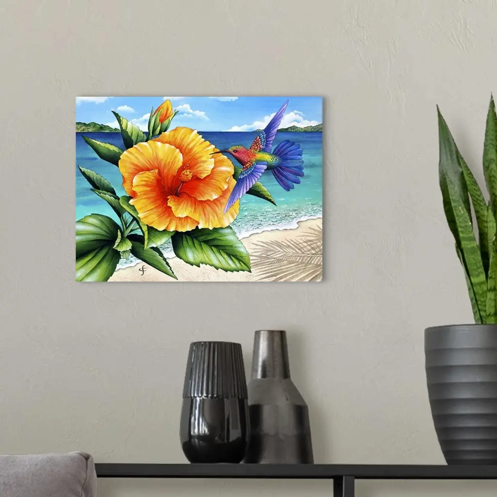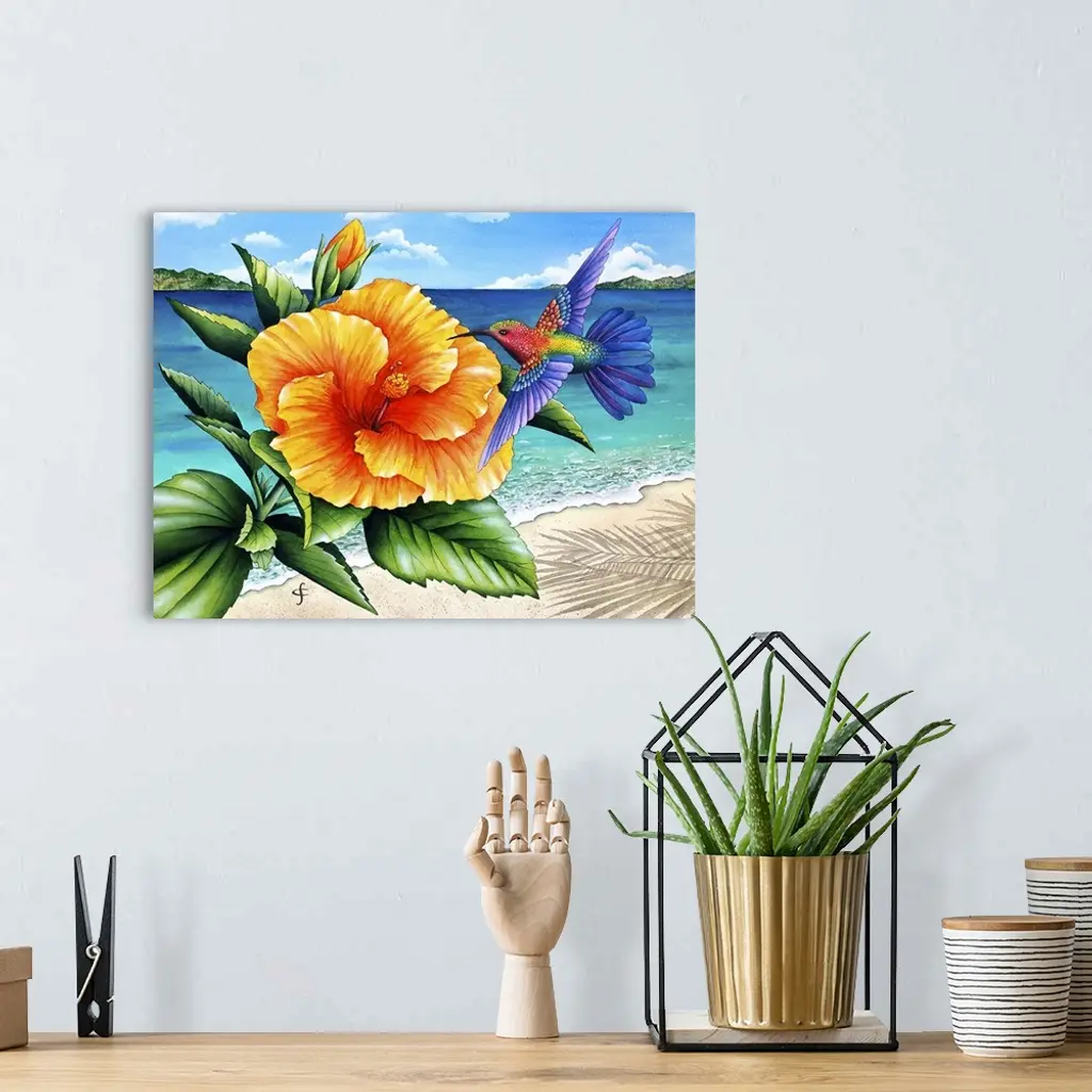 Artwork of colorful and vibrant yellow tropical flower, with a hummingbird hovering beside it.