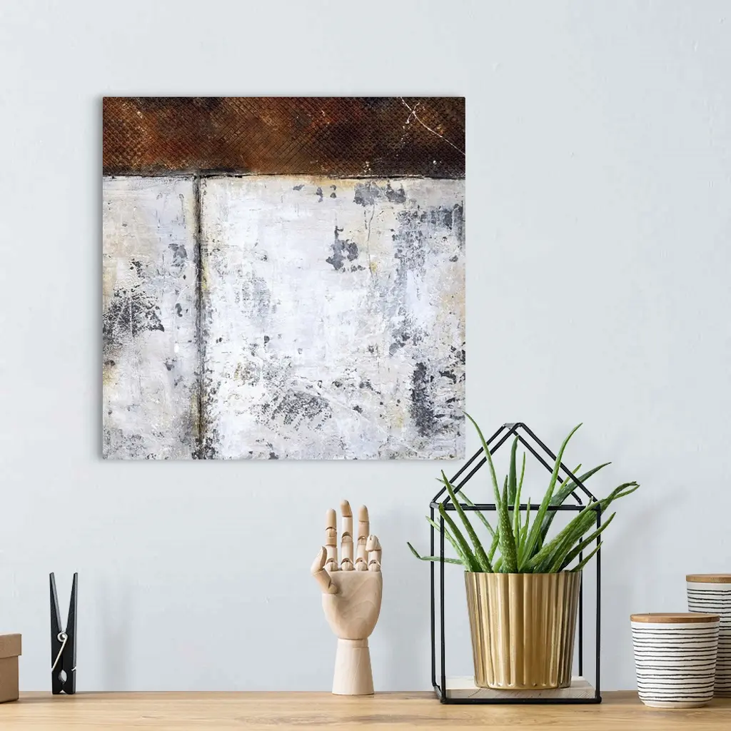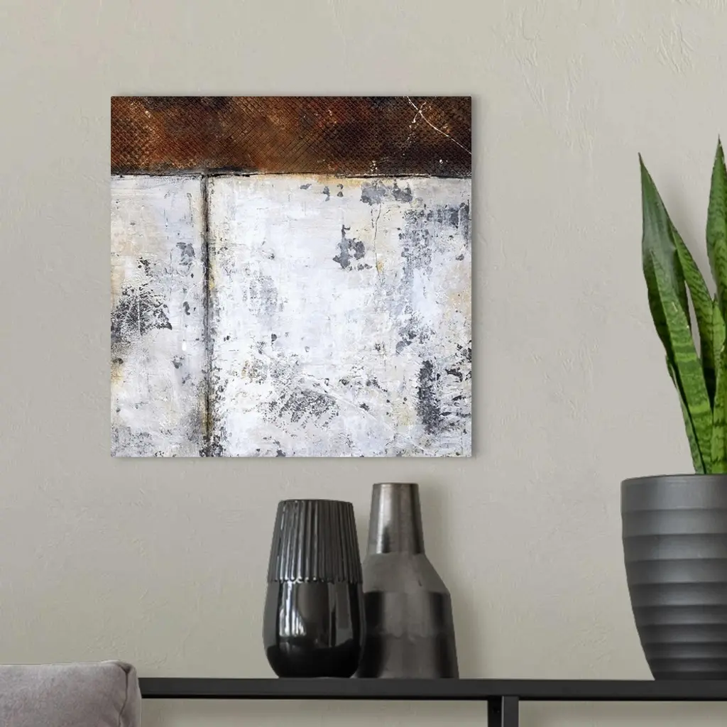 A contemporary abstract painting using geometric shapes and neutral tones.