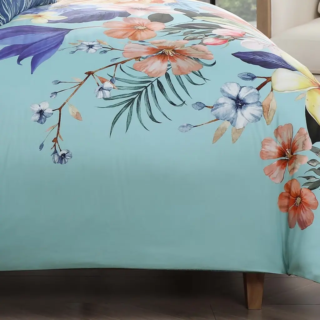 On a lovely, soft turquoise background, bouquets of colorful flowers, in peach and royal blue tones, bloom in the Bebejan Turquoise Reverie 5 piece reversible comforter set. The reverse pattern, in a subtle, darker teal sketch-like floral, picks up the color from the leaves of the front print. Embroidered lupine flowers in turquoise grace the dark teal oblong pillow while the square pillow in blush has rich looking mini-pleats. This 100% cotton sateen 5 piece set includes 2 zipper shams, an 18x18" pleated pillow, and a 22x12" embroidered pillow.