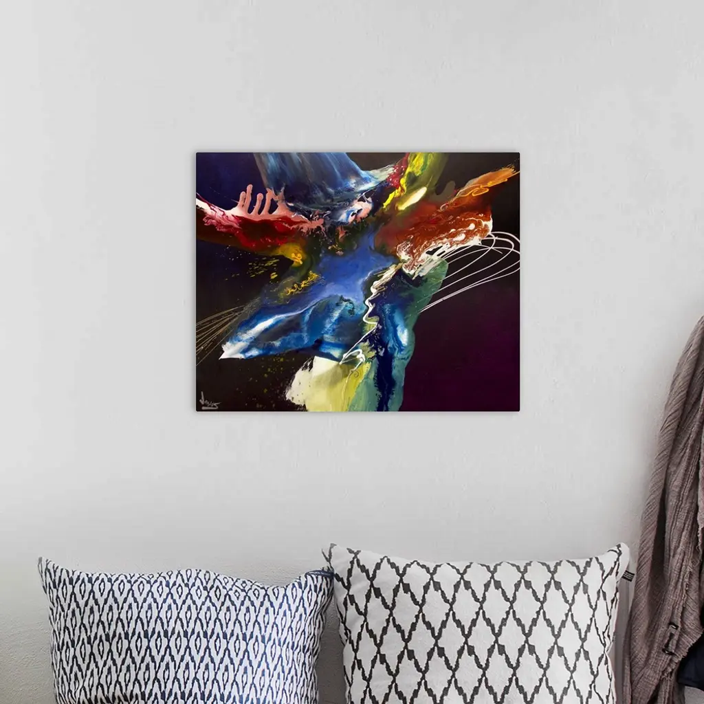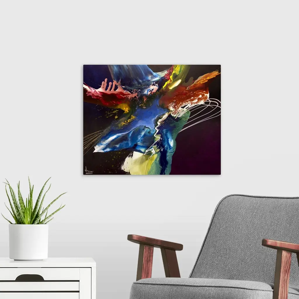 Contemporary abstract painting using wild and vivid colors to create movement and depth.