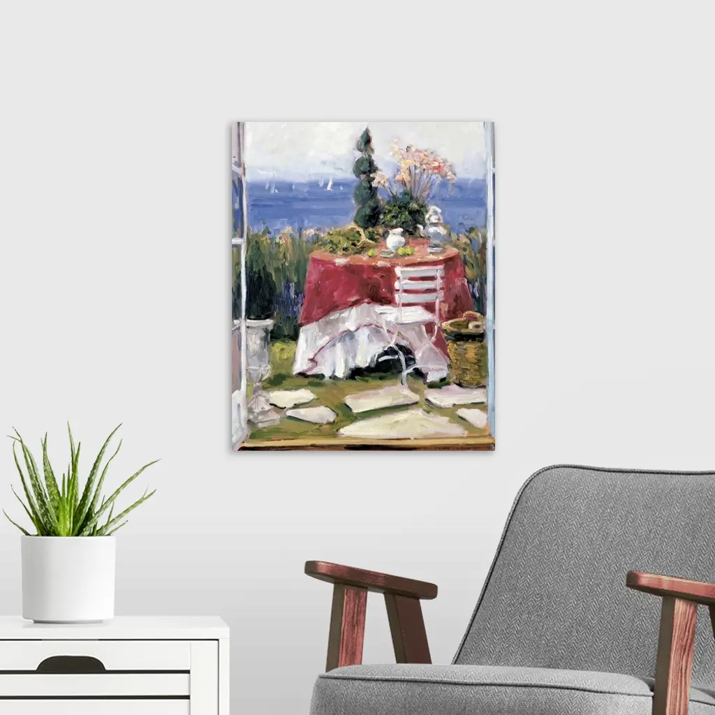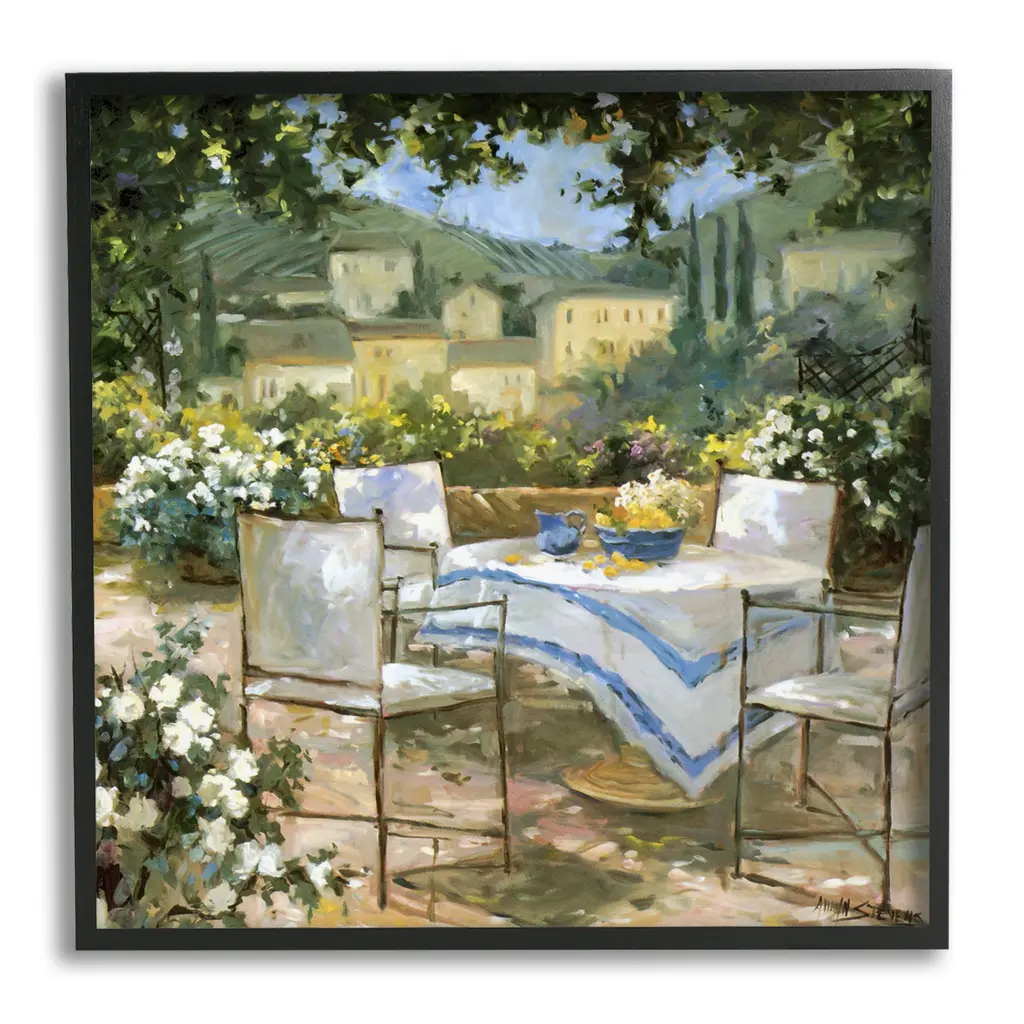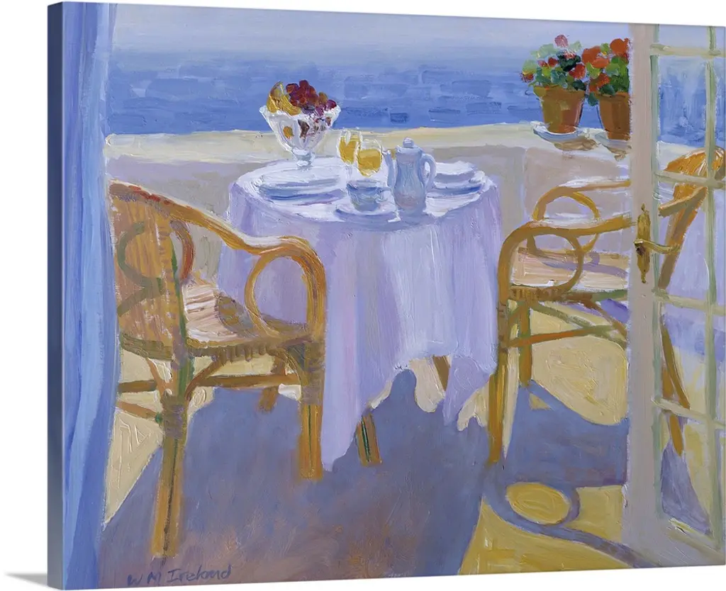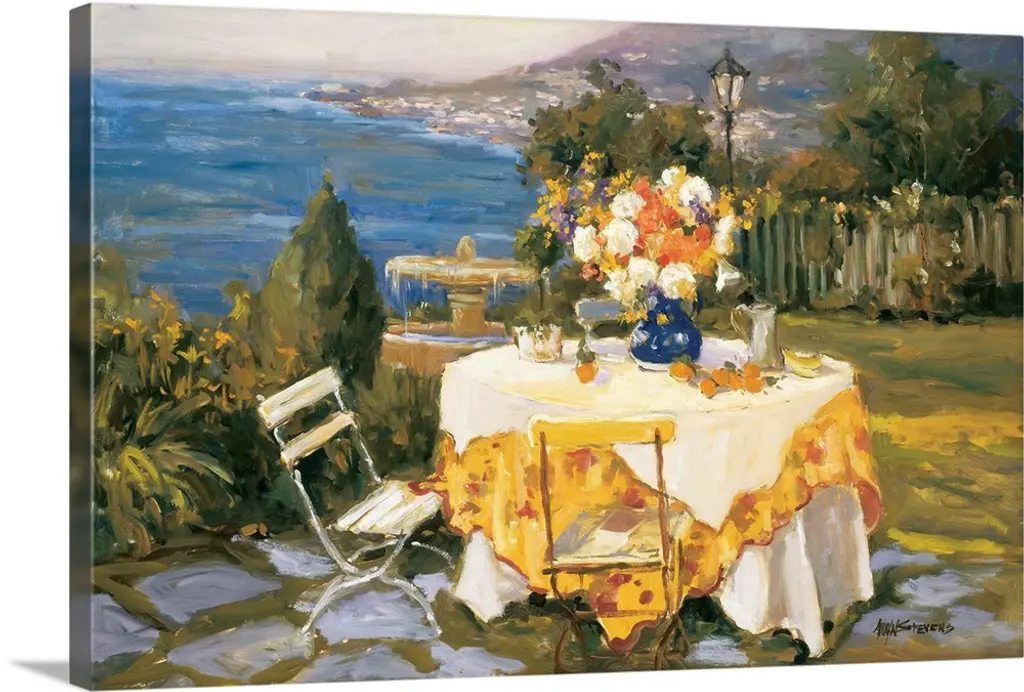 Fine art oil painting landscape of a seaside cottage with open French windows looking out over a table on a cobblestone terrace by Allayn Stevens.