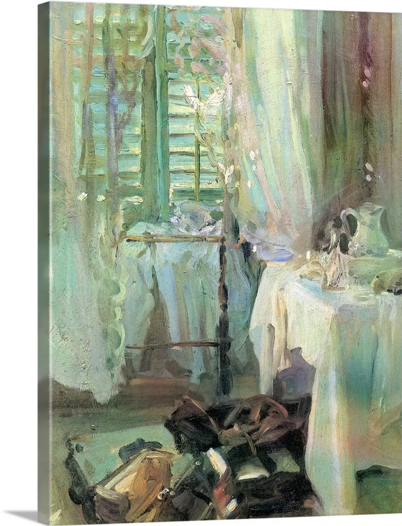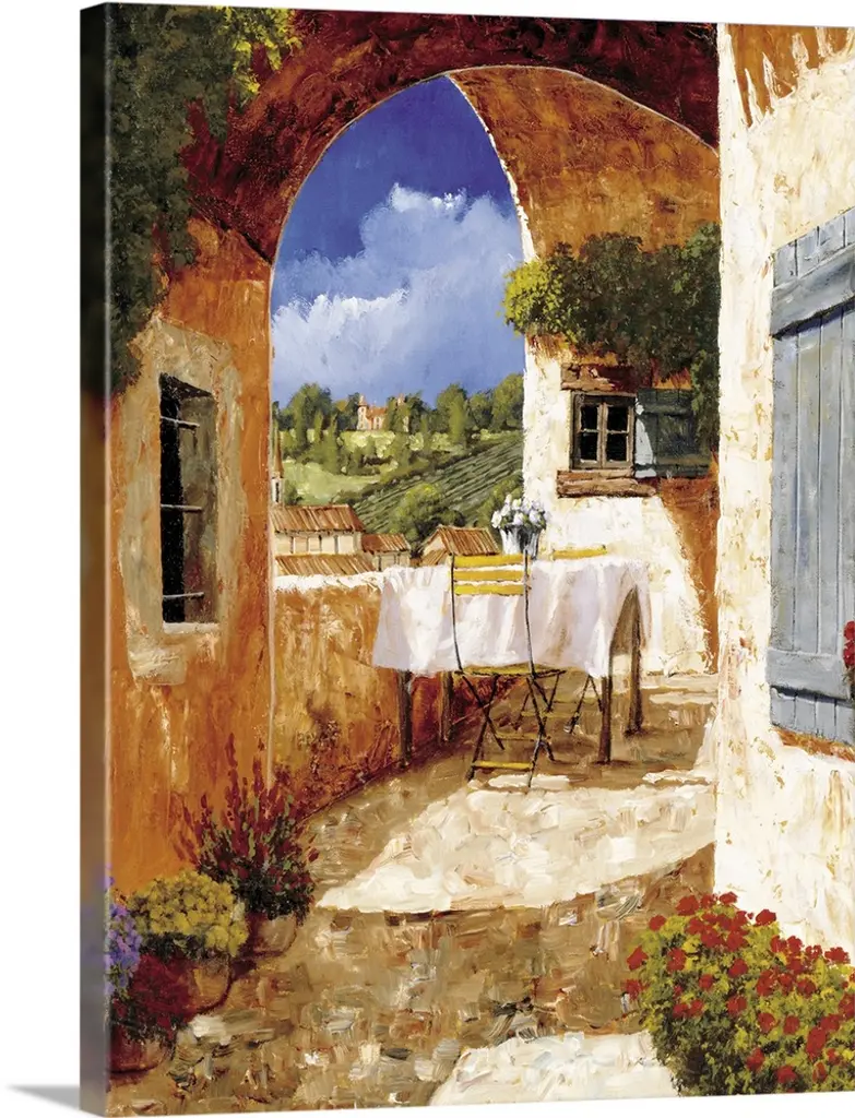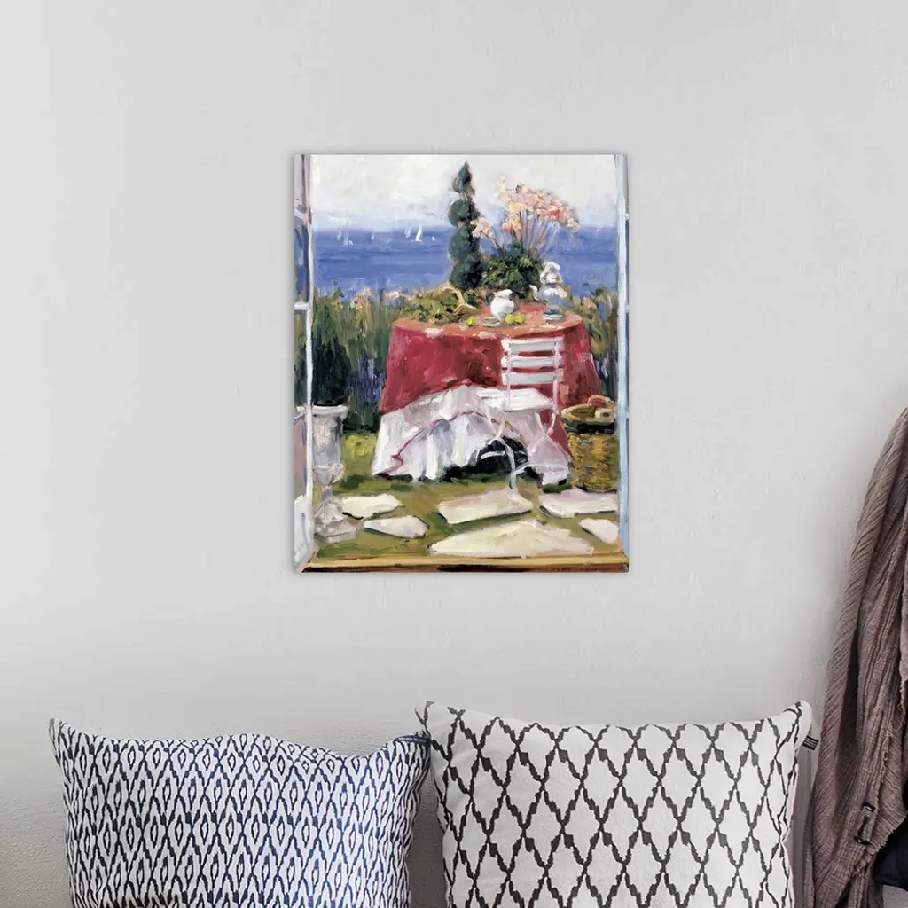 Fine art oil painting landscape of a seaside cottage with open French windows looking out over a table on a cobblestone terrace by Allayn Stevens.