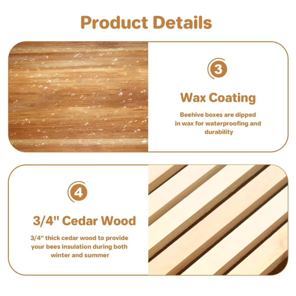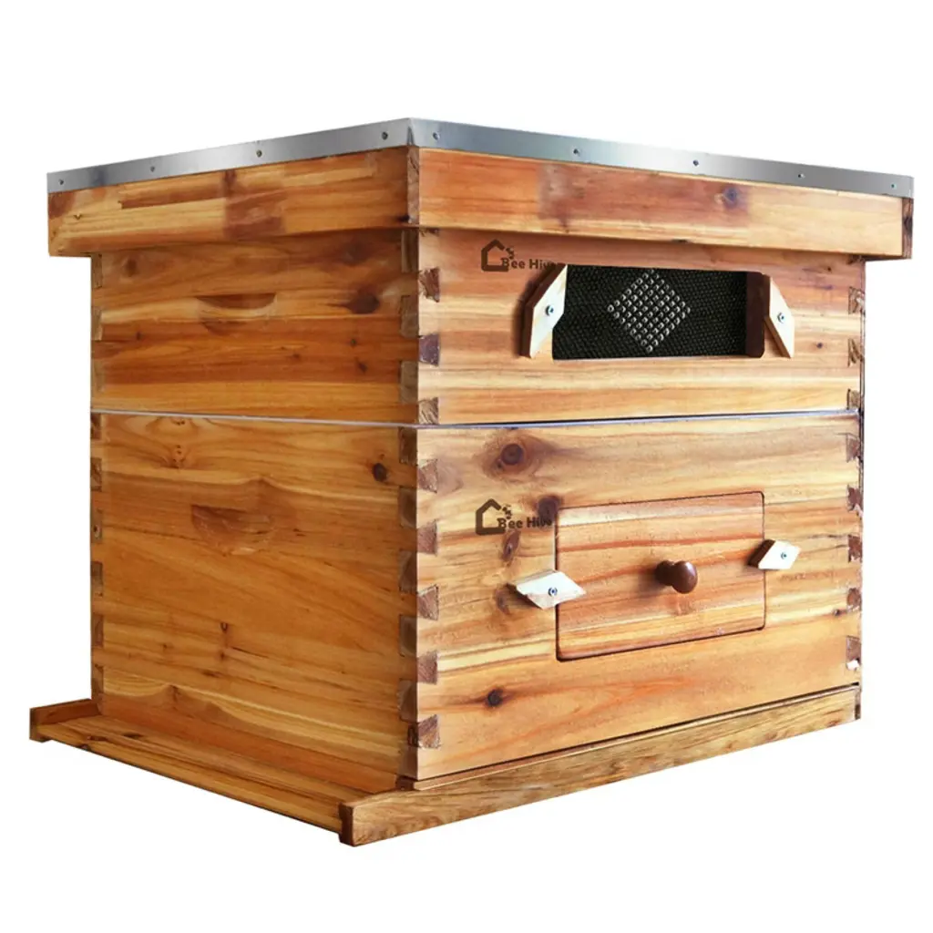 Bee Hive Starter Kit 10 Frame, Langstroth Beehive with Observation WindowProduct Description:Begin your beekeeping journey with this professional-grade 10-frame Langstroth hive starter kit, crafted from premium cedar wood and featuring a unique observation window for convenient colony monitoring. Each component undergoes complete beeswax immersion treatment, creating a natural waterproof barrier that eliminates painting requirements while enhancing swarm attraction. Designed for effortless tool-free assembly with precision dovetail joints, this hive offers superior durability and thermal regulation for optimal colony health. The complete kit includes all essential components, making it ideal for both beginners and experienced beekeepers seeking a reliable, ready-to-use hive system.Key Features:1. Complete Beeswax Immersion ProtectionAll wooden components are fully immersed in boiled natural beeswax, creating a thick waterproof coating that provides superior weather resistance, eliminates the need for painting, and naturally attracts swarms through pheromone retention.2. Thermal-Regulating Cedar ConstructionMade from premium cedar wood that naturally insulates during cold months and promotes heat dissipation in summer. The wood's natural properties help maintain stable internal temperatures for colony comfort and health.3. Integrated Observation WindowFeatures a durable transparent window panel that allows beekeepers to monitor hive activity, honey production, and colony health without disturbing the bees, making inspection and management more efficient.4. Tool-Free Precision Assembly DesignEngineered with pre-cut dovetail joints and pre-drilled holes for secure, tool-free assembly. The interlocking construction provides 30% greater compressive strength than conventional hives for enhanced durability.5. Complete Starter Kit with Ventilation SystemIncludes 1 deep brood box, 1 medium super, ventilated inner cover, galvanized metal roof, solid bottom board, entrance reducer, and 20 frames with beeswax foundation¡ªproviding everything needed for immediate beekeeping operation.Specifications:? Frame Capacity: 10-Frame Langstroth Standard? Material: Premium Cedar Wood? Coating: 100% Natural Beeswax Immersion? Dimensions: 59.99 x 46 x 50.5 cm? Special Features: Observation Window, Beeswax Coated, Ventilation System? Includes: 1 Deep Box, 1 Medium Box, 20 Frames, Metal Roof, Bottom Board, Entrance Reducer? Assembly: Tool-free with dovetail joints? Weight: 40.82 g (package weight may vary)? Color: Natural Cedar Brown? Use: Beekeeping for Beginners and Professionals