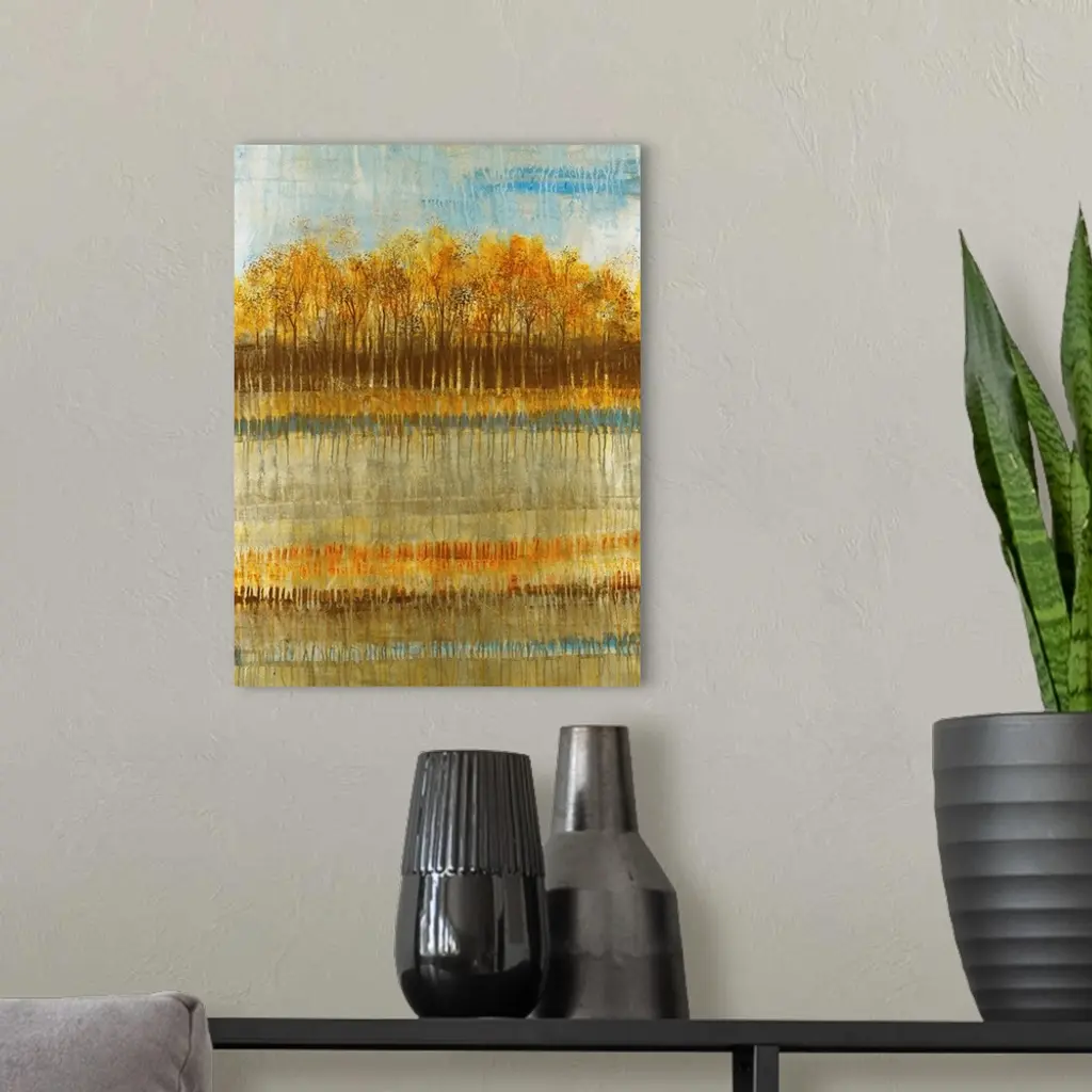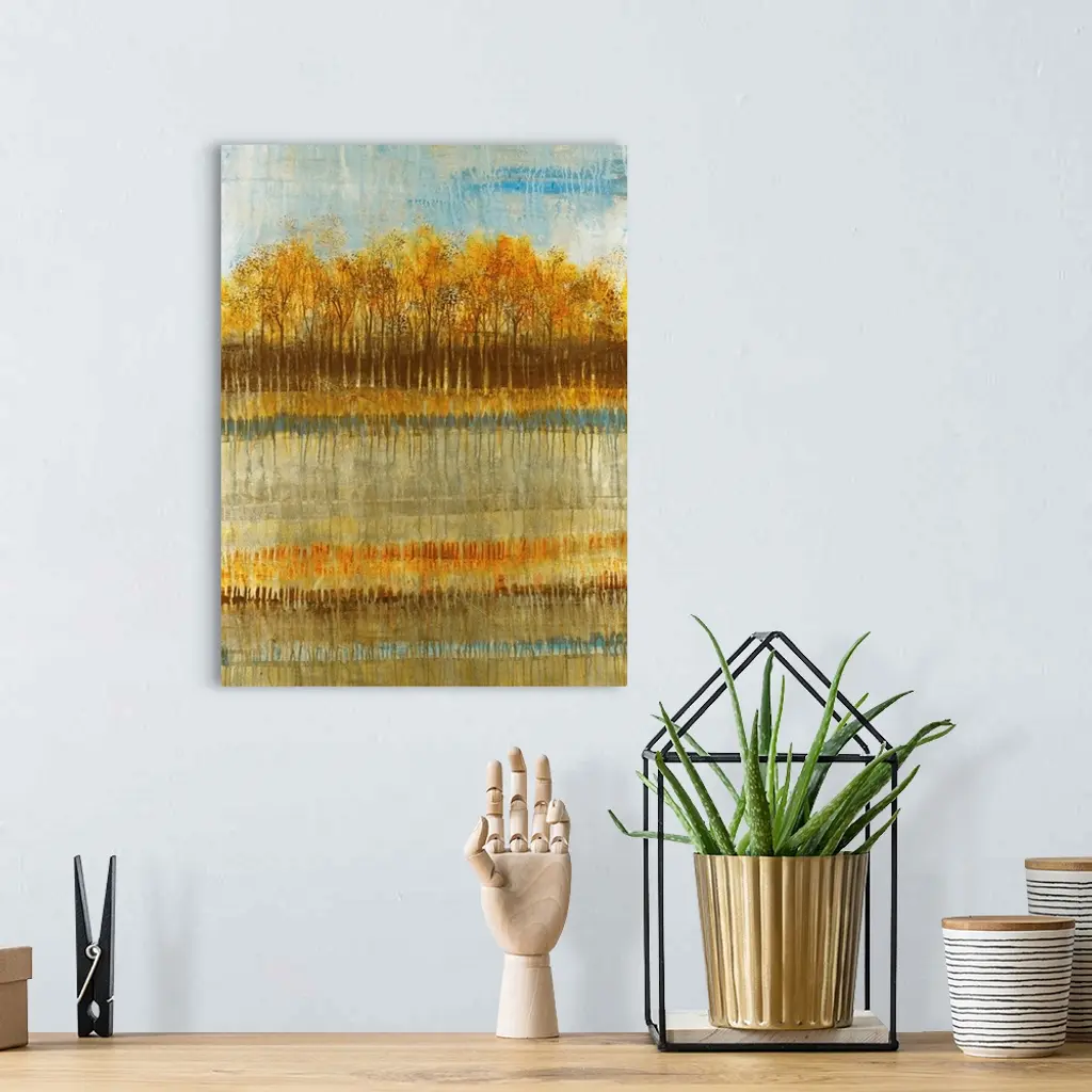 Abstract painting on canvas of a line of trees with gradient colors layered below.