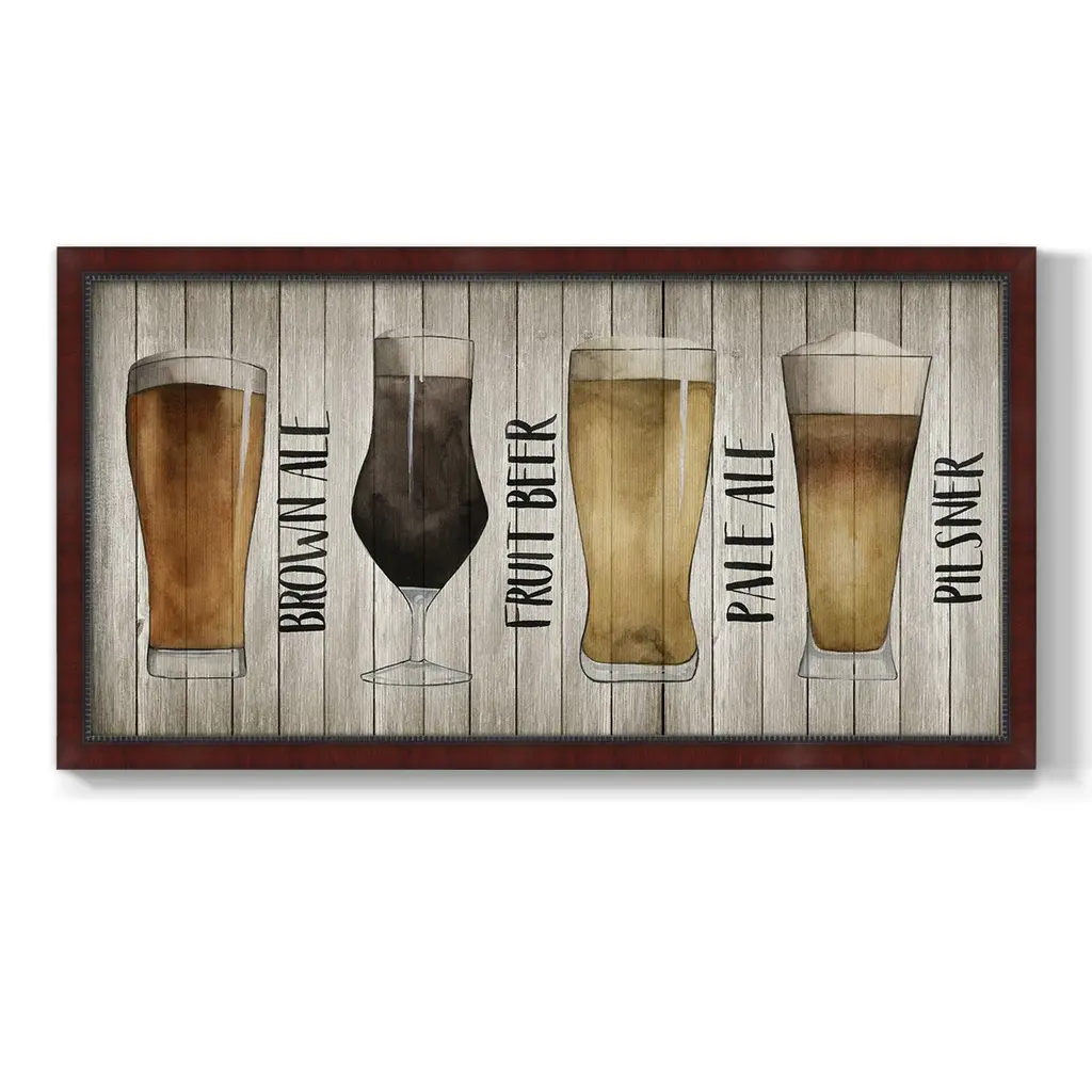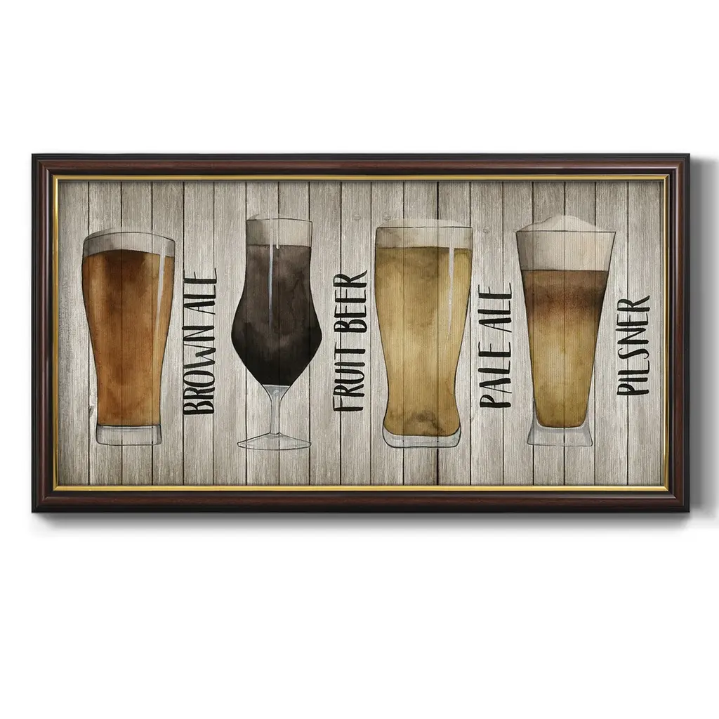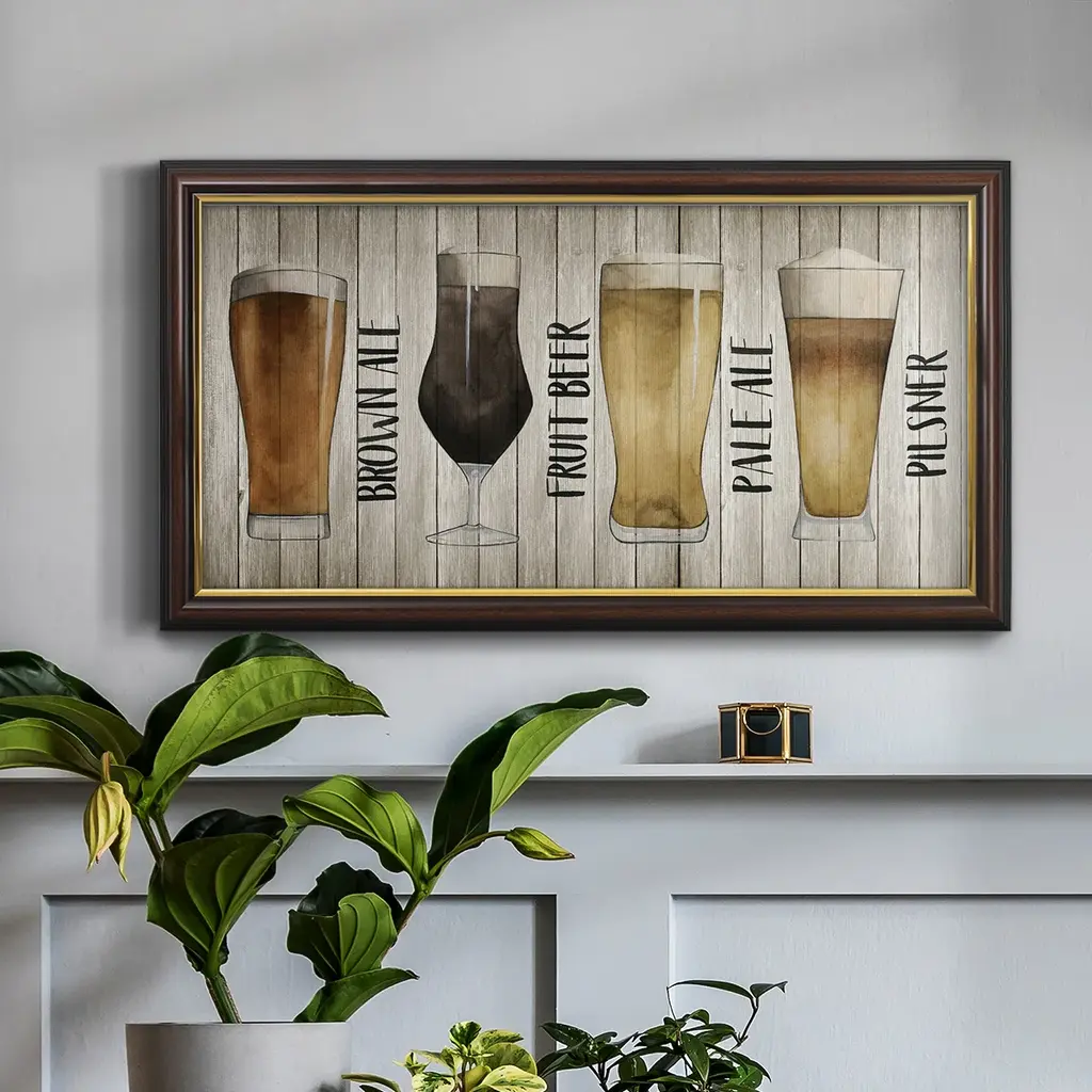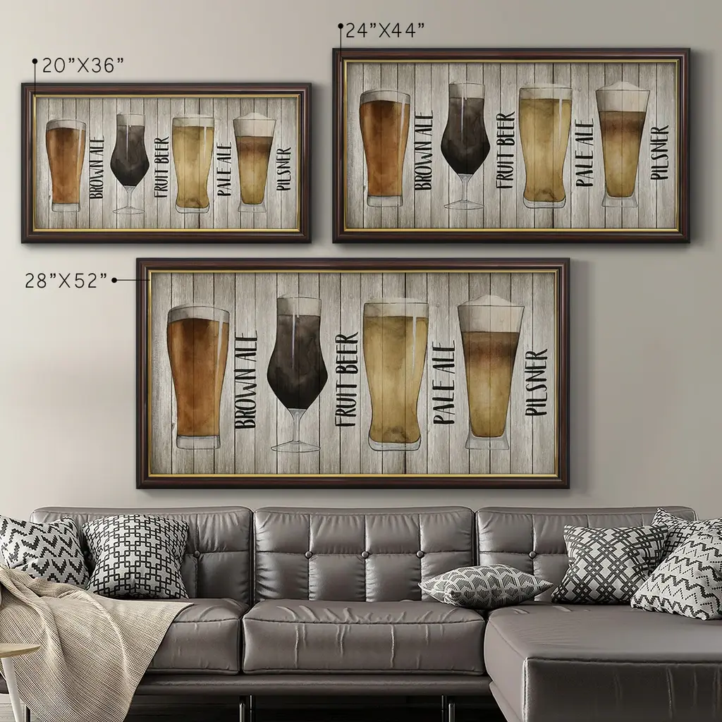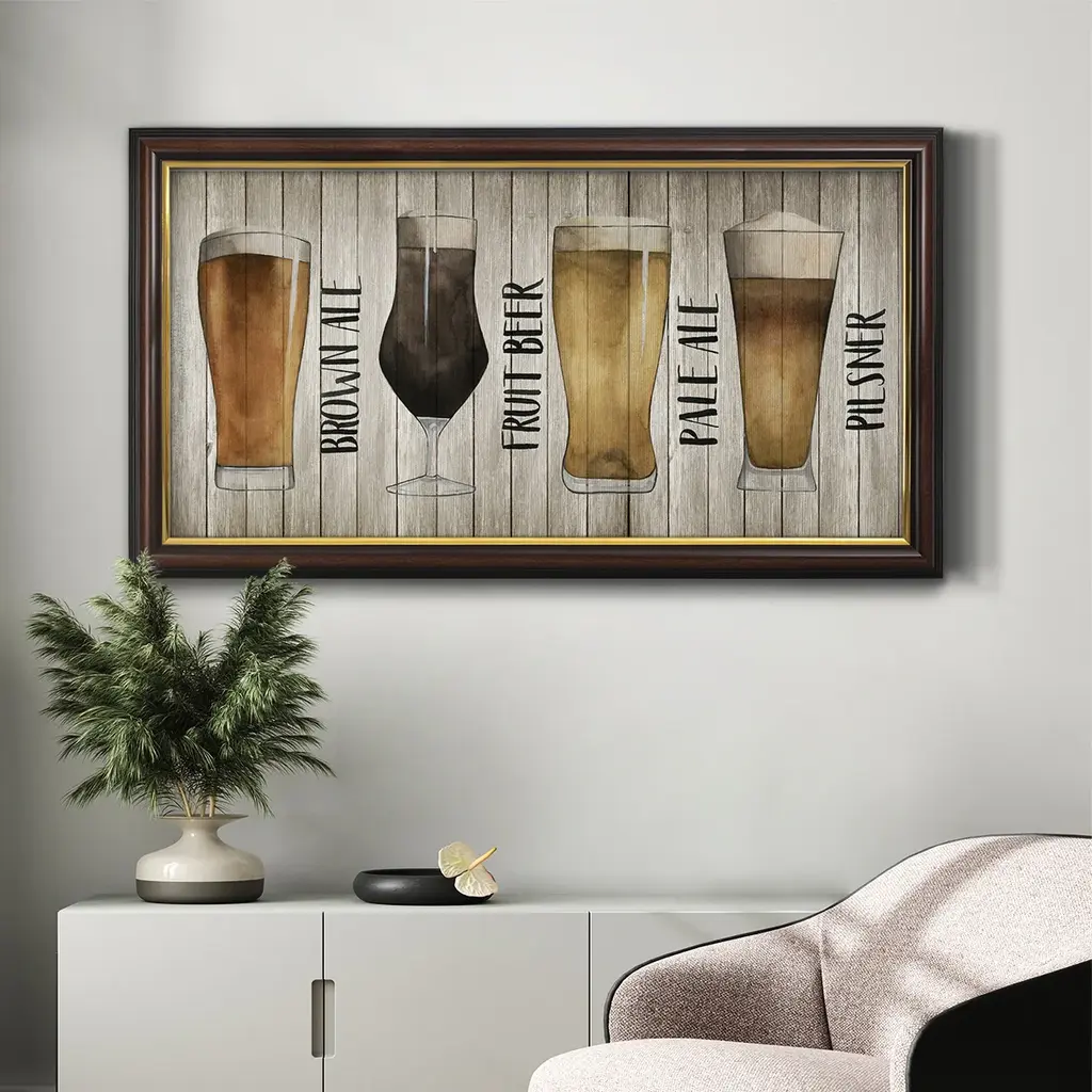 Beer Chart I Premium Framed Canvas- Ready to Hang A Premium Framed Canvas created to last. Framed in distressed wood and available in an array of sizes and colors Featuring a beveled a solid wood stretcher bar, each piece comes ready to hand 3 SIZES AVAILABLE 21''X37'' - Overall Size 25''X45'' - Overall Size 29''x53'' - Overall Size Each piece is made to order. Each piece comes with hanging hardware. Made in the USA Ready to Hang Giclee Paper Print Acrylic Glass Beveled Matt Board
