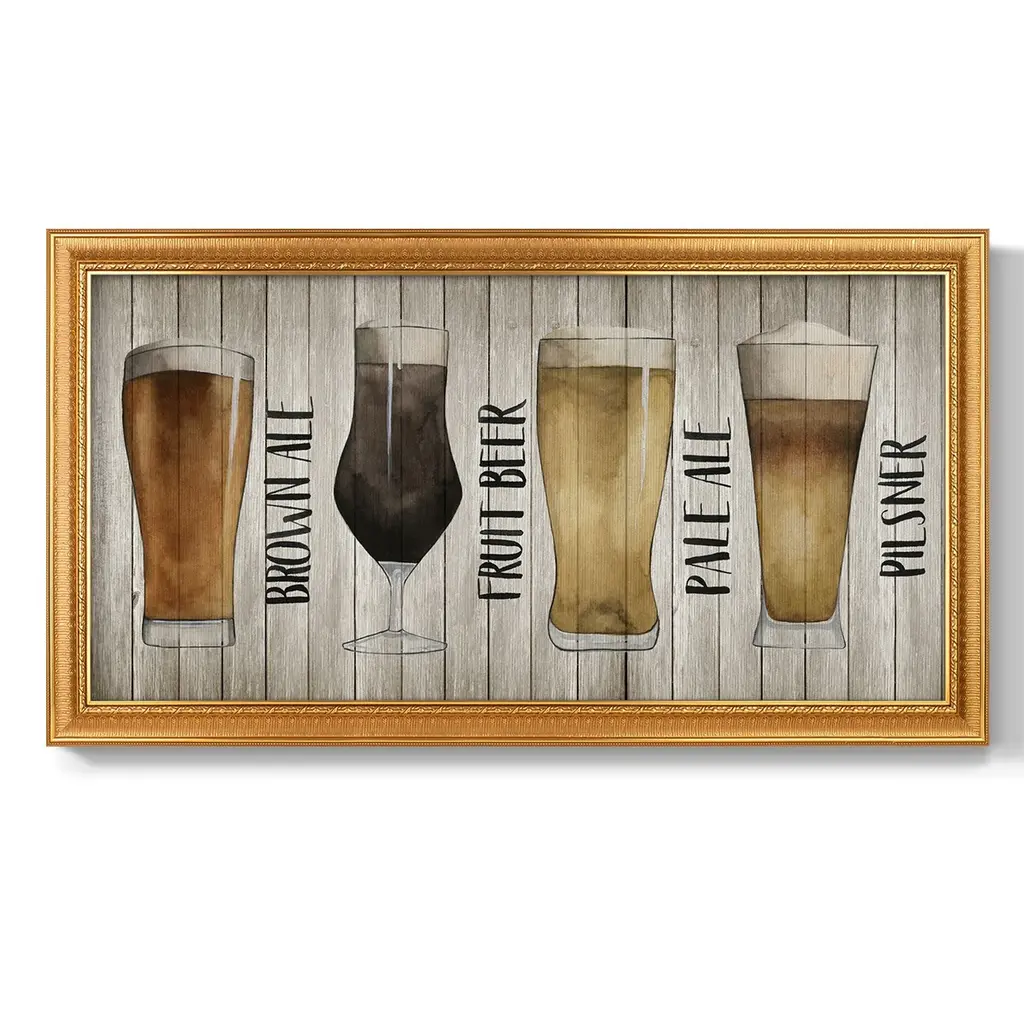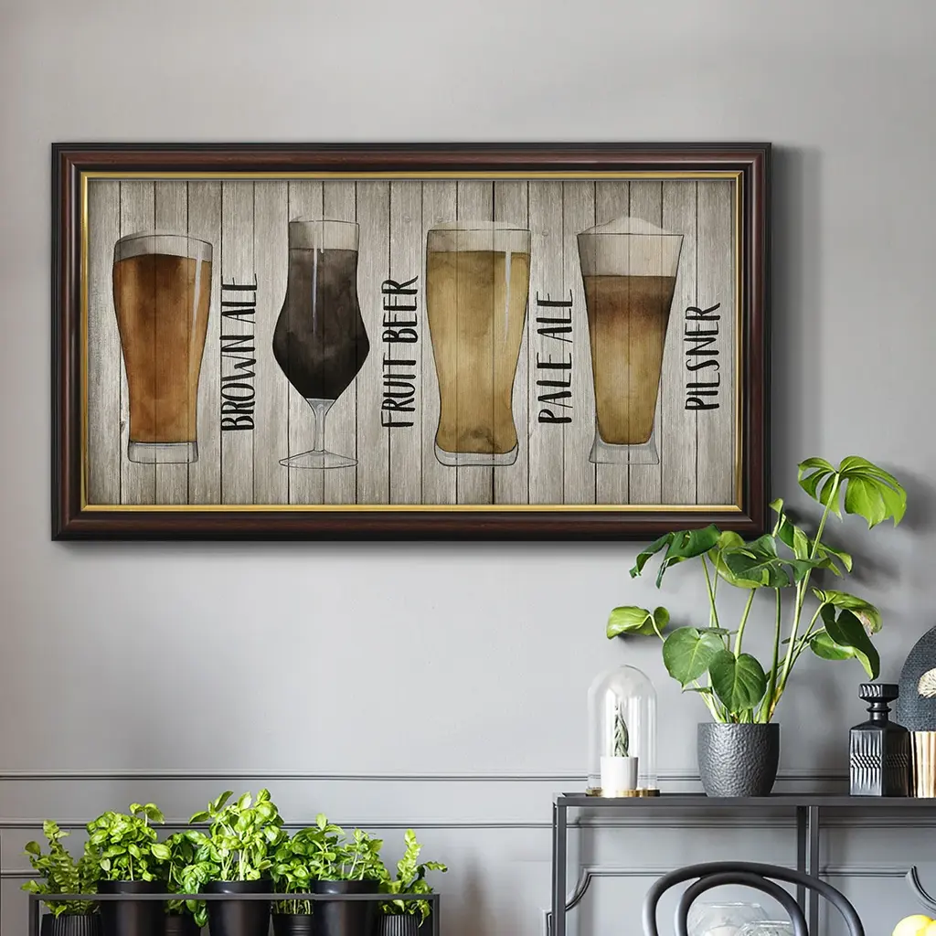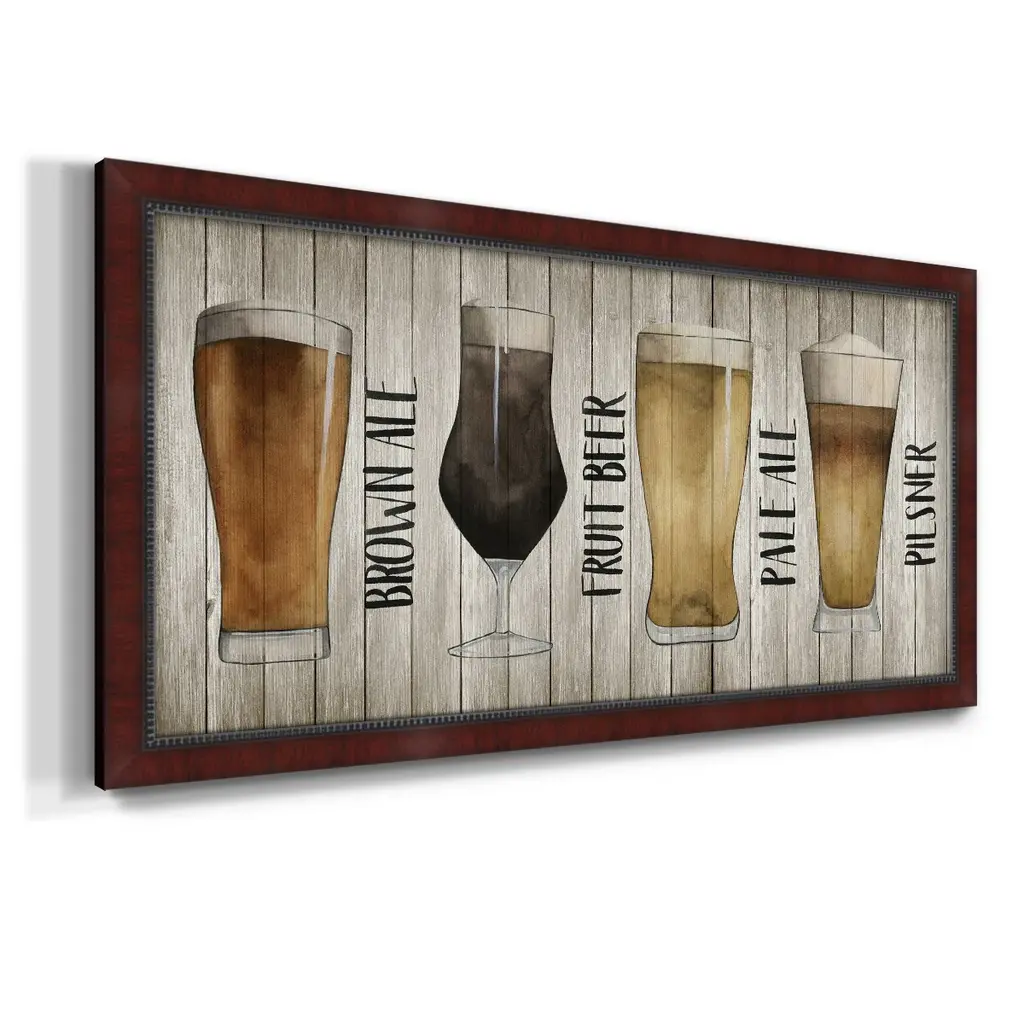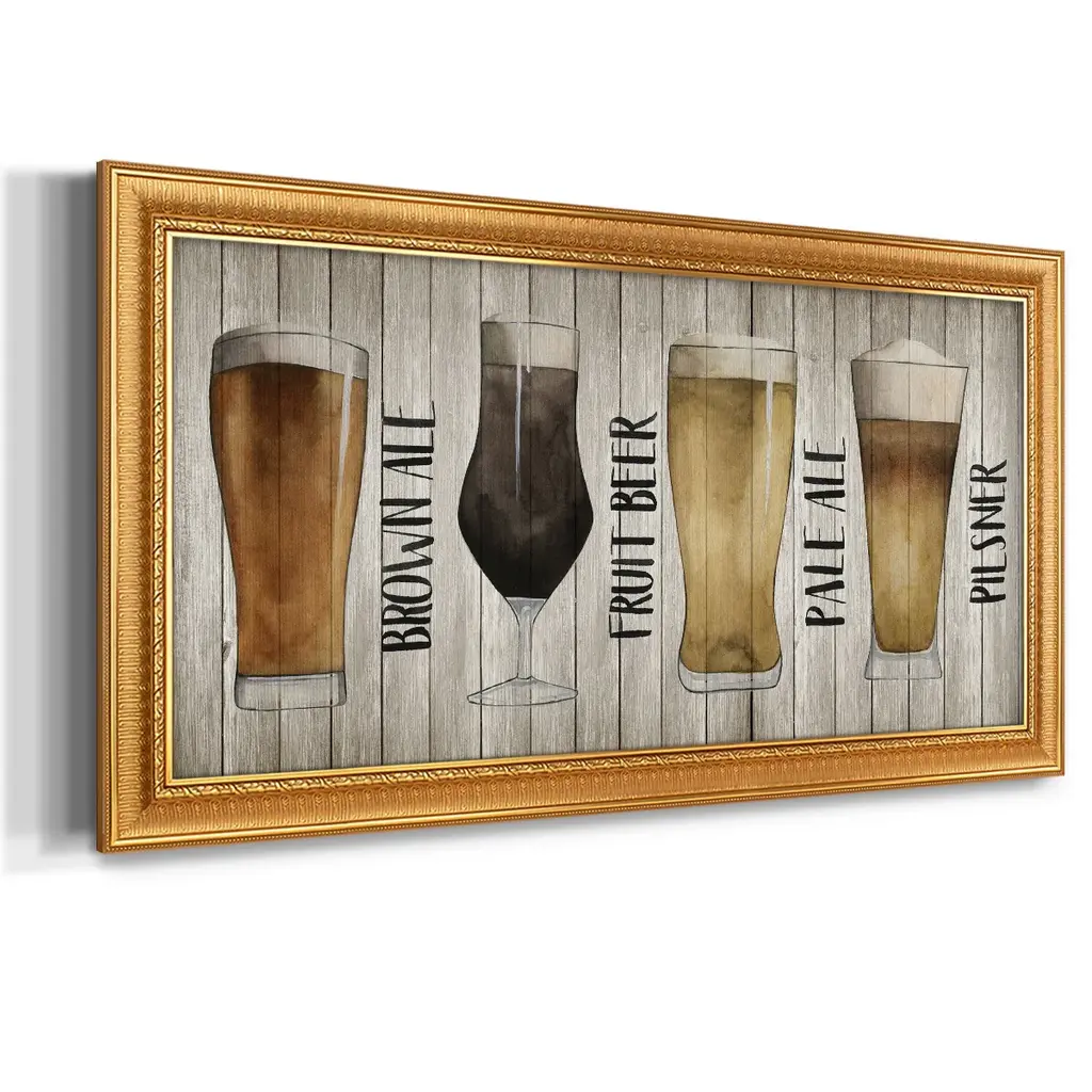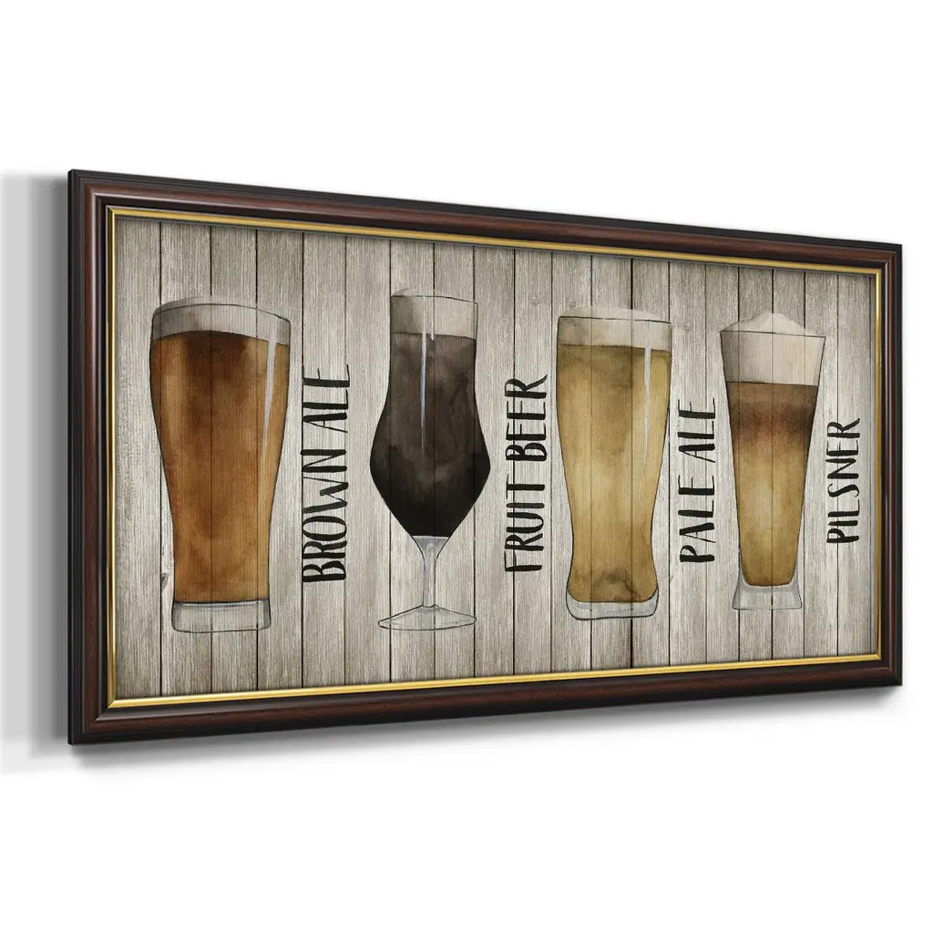 Beer Chart I Premium Framed Canvas- Ready to Hang A Premium Framed Canvas created to last. Framed in distressed wood and available in an array of sizes and colors Featuring a beveled a solid wood stretcher bar, each piece comes ready to hand 3 SIZES AVAILABLE 21''X37'' - Overall Size 25''X45'' - Overall Size 29''x53'' - Overall Size Each piece is made to order. Each piece comes with hanging hardware. Made in the USA Ready to Hang Giclee Paper Print Acrylic Glass Beveled Matt Board