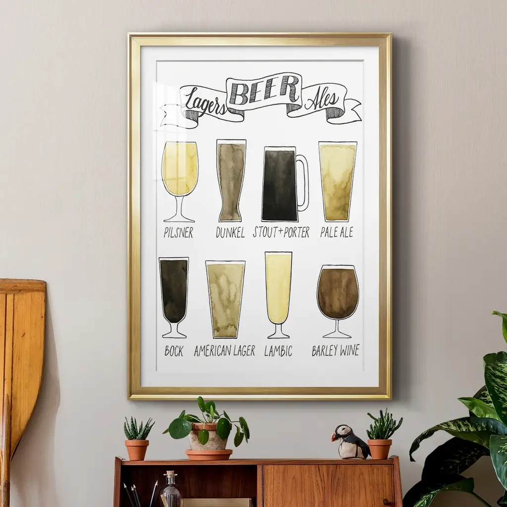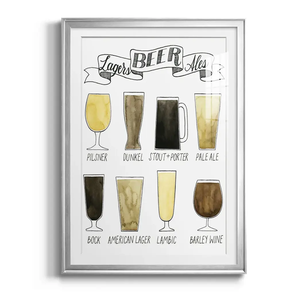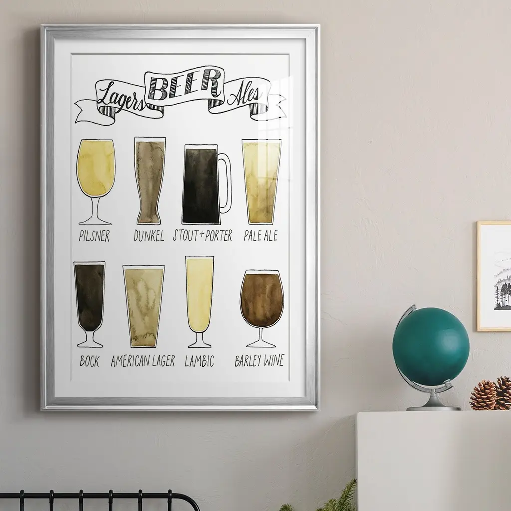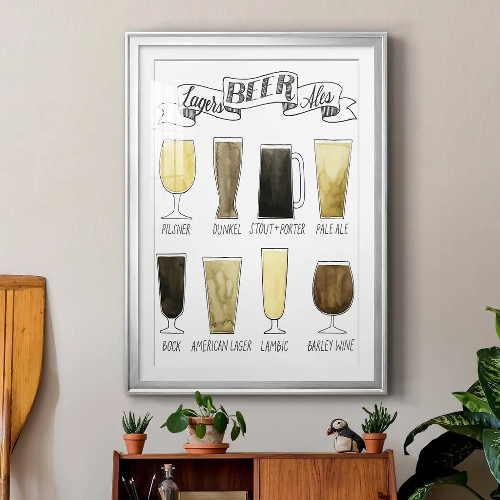 Beer Info Graphic Premium Framed Print - Ready to Hang A Premium Framed Print created to last. Framed in distressed wood and available in an array of sizes and colors Featuring a beveled a solid wood stretcher bar, each piece comes ready to hand 4 SIZES AVAILABLE 30.5''X42.5'' - Overall Size 26.5'X36.5'' - Overall Size 22.5''x30.5'' - Overall Size 18.5''x24.5'' - Overall Size Each piece is made to order. Each piece comes with hanging hardware. Made in the USA Ready to Hang Giclee Paper Print Acrylic Glass Beveled Matt Board