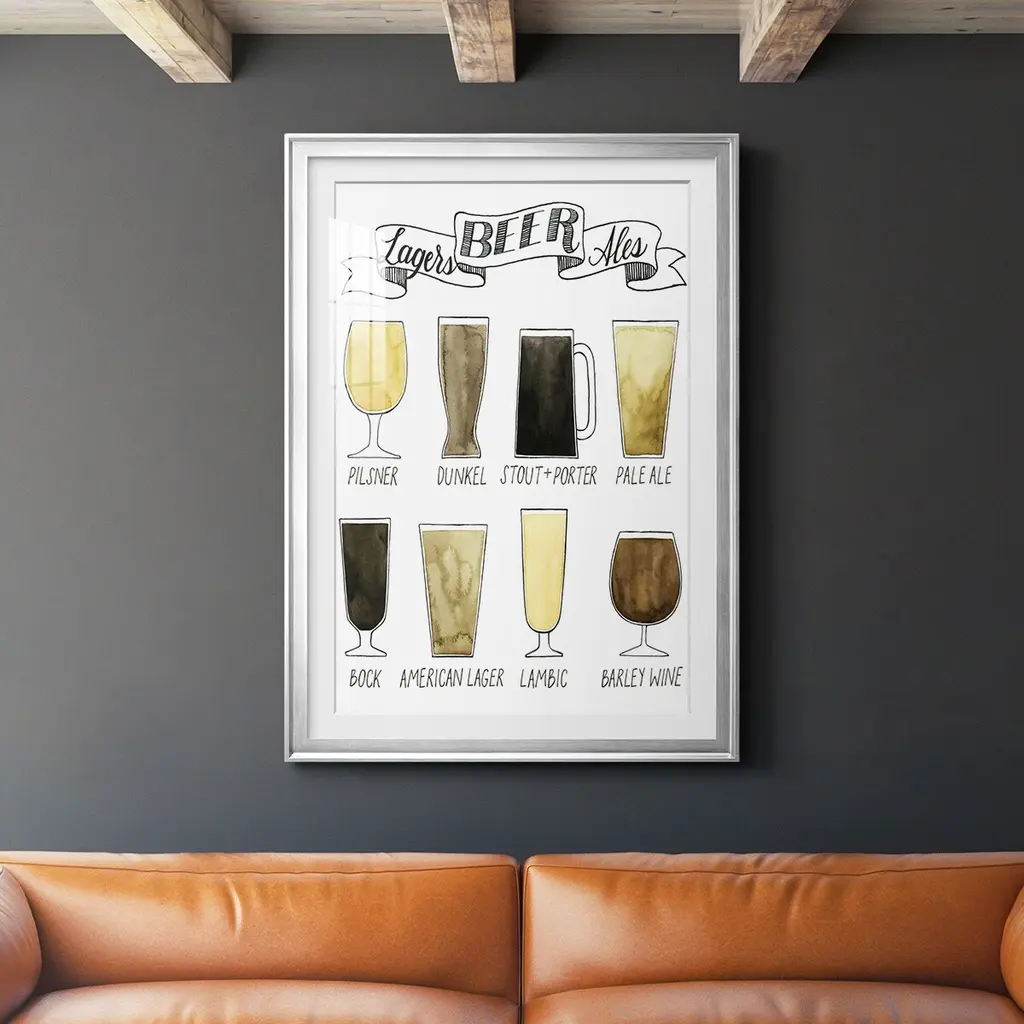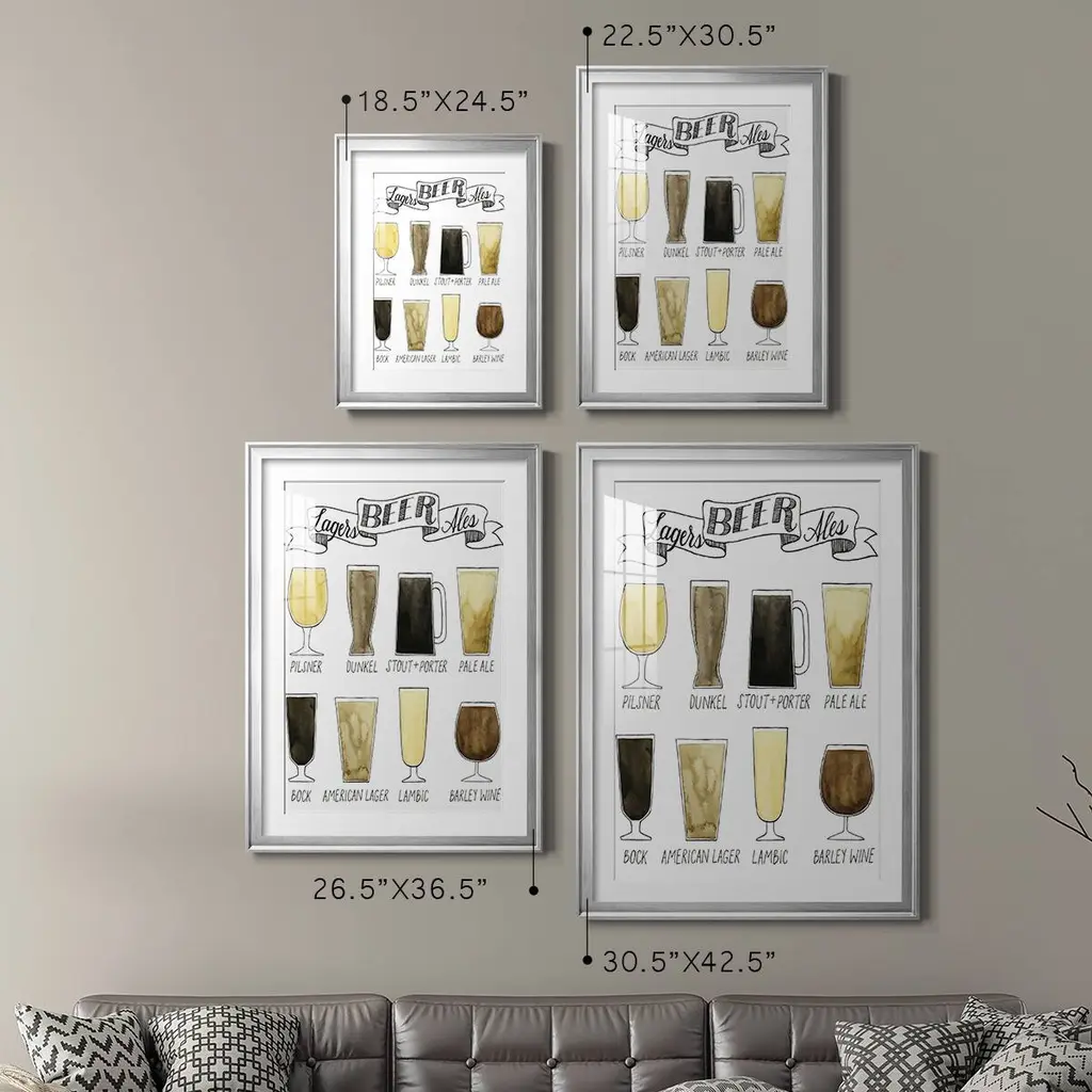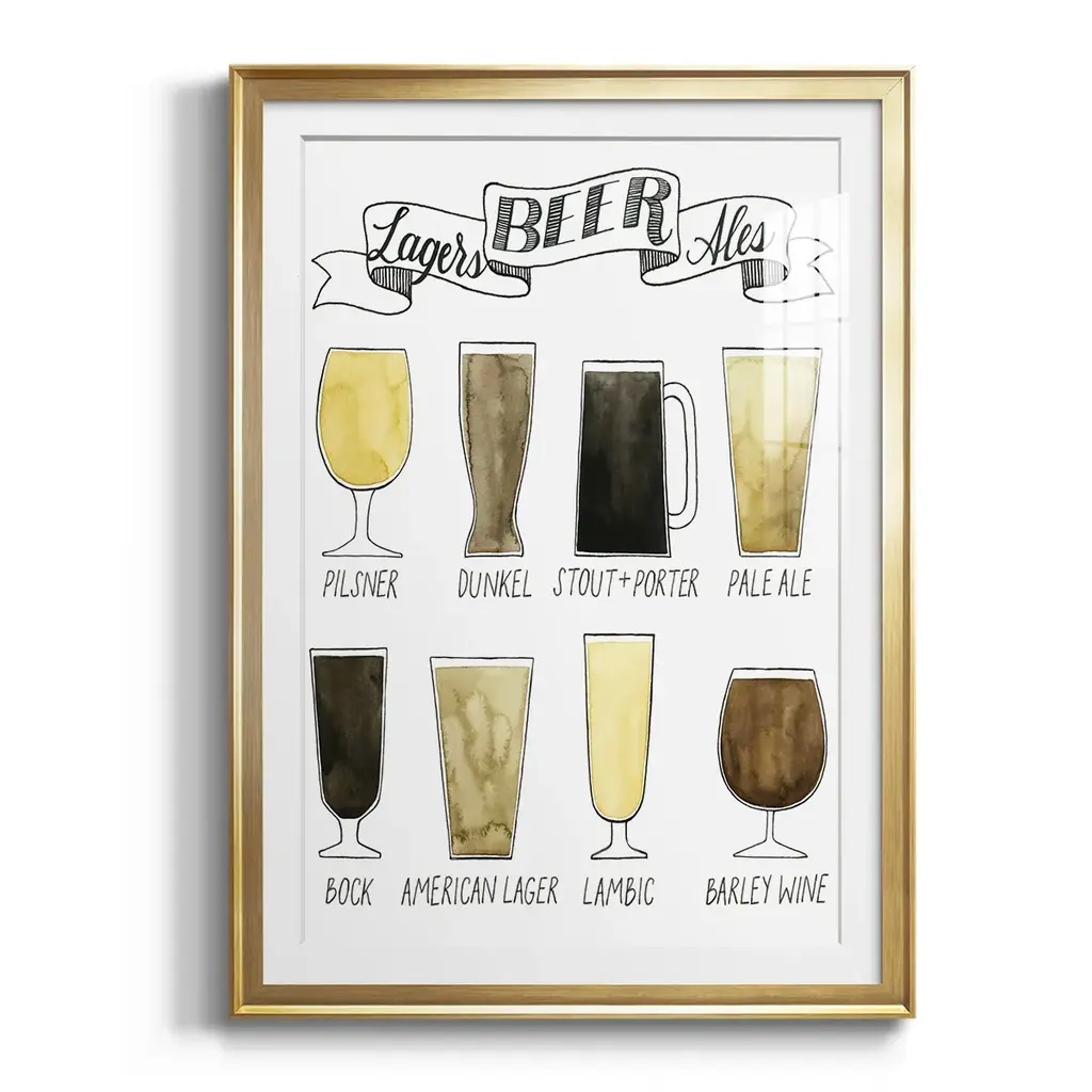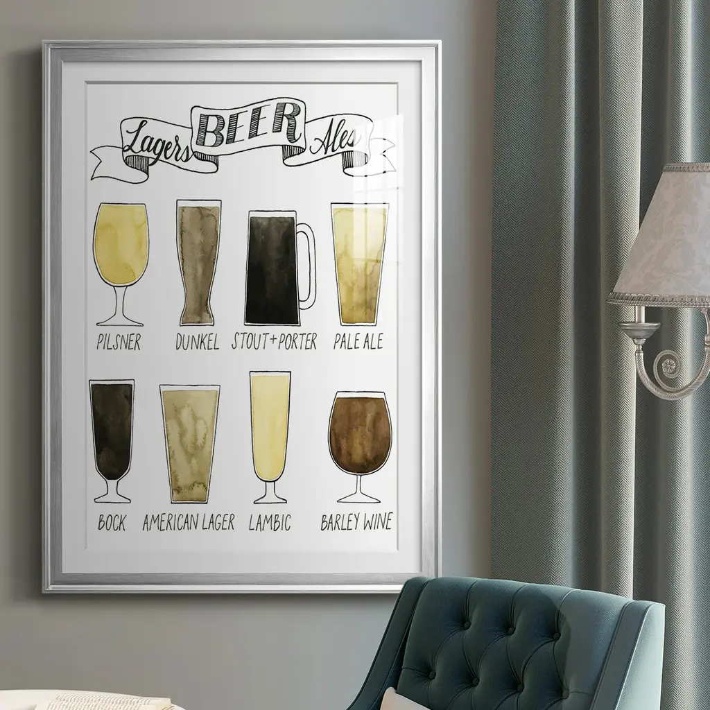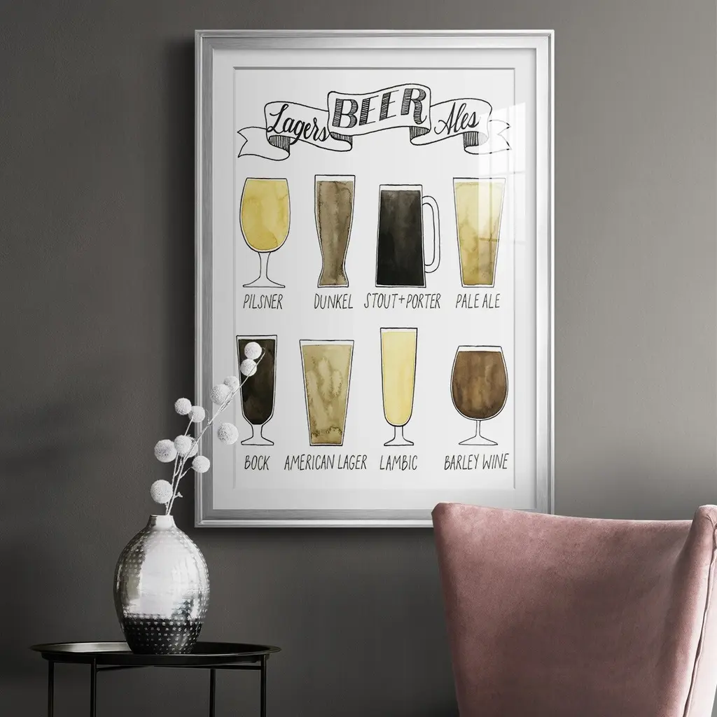 Beer Info Graphic Premium Framed Print - Ready to Hang A Premium Framed Print created to last. Framed in distressed wood and available in an array of sizes and colors Featuring a beveled a solid wood stretcher bar, each piece comes ready to hand 4 SIZES AVAILABLE 30.5''X42.5'' - Overall Size 26.5'X36.5'' - Overall Size 22.5''x30.5'' - Overall Size 18.5''x24.5'' - Overall Size Each piece is made to order. Each piece comes with hanging hardware. Made in the USA Ready to Hang Giclee Paper Print Acrylic Glass Beveled Matt Board
