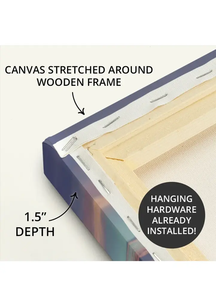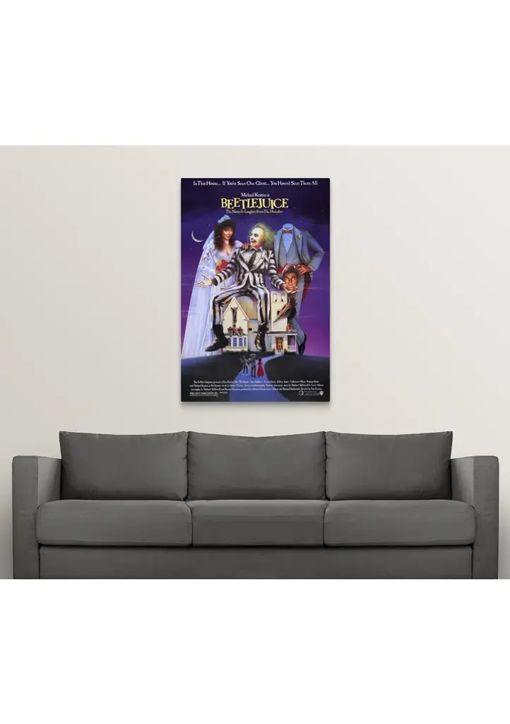 Gallery-Wrapped Canvas entitled 'Beetlejuice (1988)'. The after-life is confusing for a pair of ultra-nice novice ghosts Adam Maitland (Baldwin) and his wife Barbara (Davis), who are faced with chasing an obnoxious family of post-modern art lovers who move into their house. Then they hear of a poltergeist who promises to rid the house of all trespassers for a price. Things go from bad to impossible when the maniacal Keaton (as the demonic Betelgeuse) works his magic. The calypso scene is priceless. A cheesy, funny, surreal farce of life after death with inventive set designs popping continual surprises. Ryder is striking as the misunderstood teen with a death complex, while O''Hara is hilarious as the yuppie art poseur. Multiple sizes available. Primary colors within this image include: Light Yellow, Pale Blue, Royal Blue, Dark Navy Blue. Made in USA. Satisfaction guaranteed. Inks used are latex-based and designed to last. Canvas is a 65% polyester, 35% cotton base, with two acrylic latex primer basecoats and a semi-gloss inkjet receptive topcoat. Canvases are stretched across a 1.5 inch thick wooden frame with easy-to-mount hanging hardware.