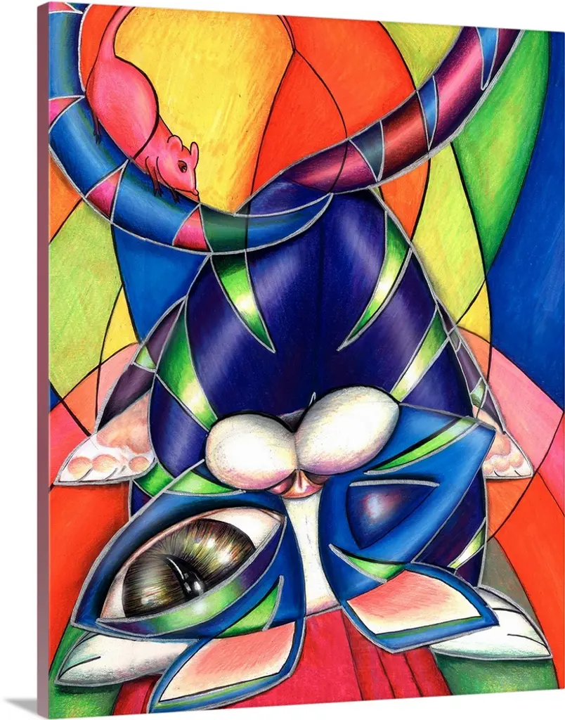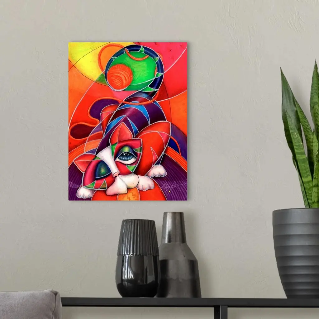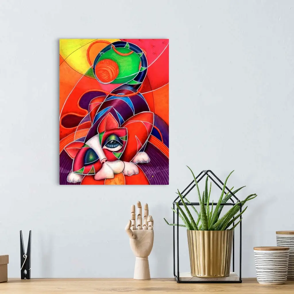 Contemporary artwork in the style of cubism of a stretching cat in bold colors.