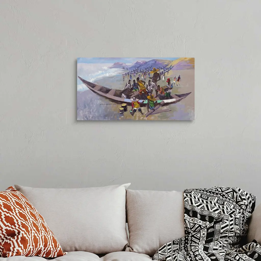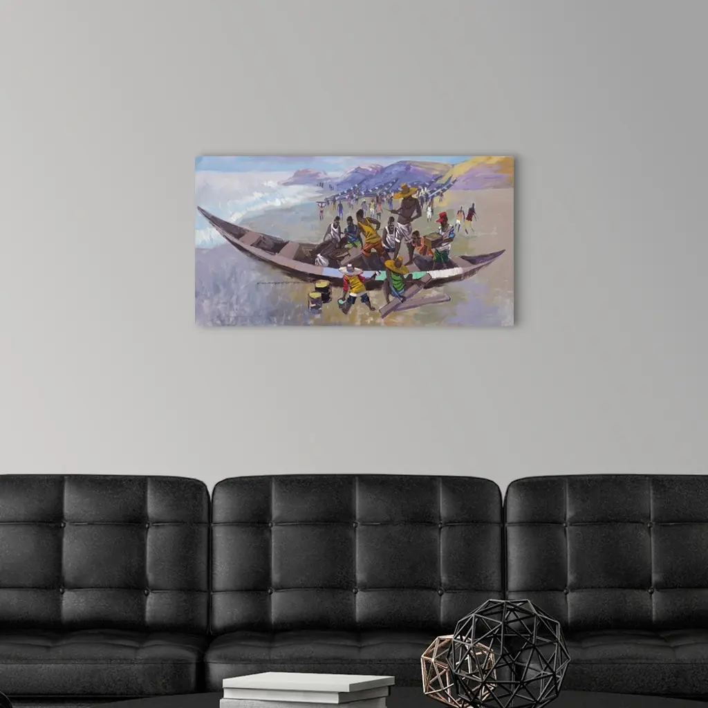 The afternoon is filled with activity on Jamestown Beach in Accra. Fishermen mend nets and fix up their canoes in this dynamic painting by Folusho Akomolede. Among the Ga Adangbe fishing community, Tuesdays are days considered sacred and thus no one is expected to go fishing. However they use this time to their advantage. Apply a solid foundation before you embark on any journey to avoid future calamities, the Ghanaian artist admonishes.