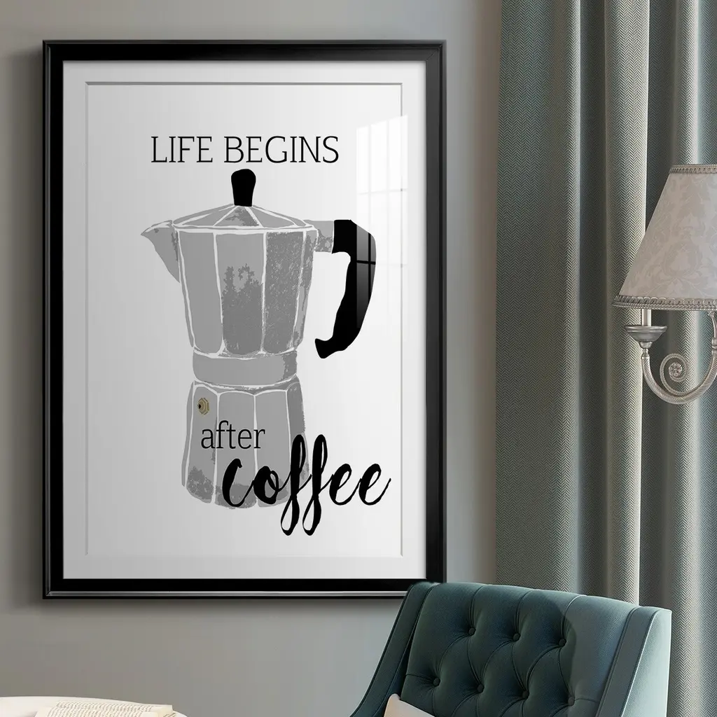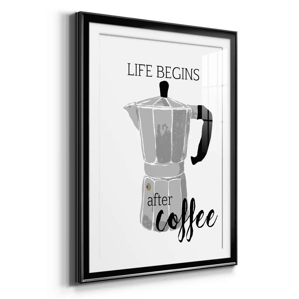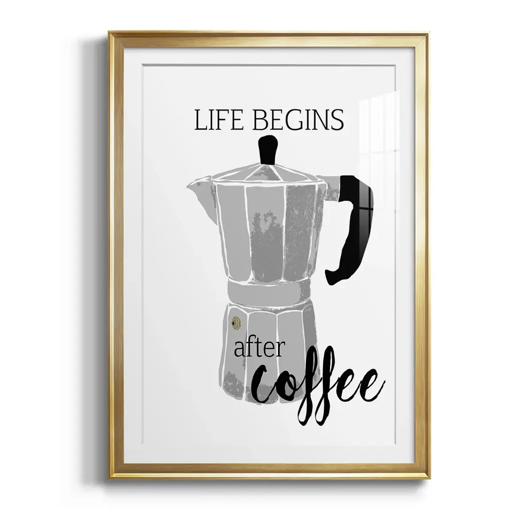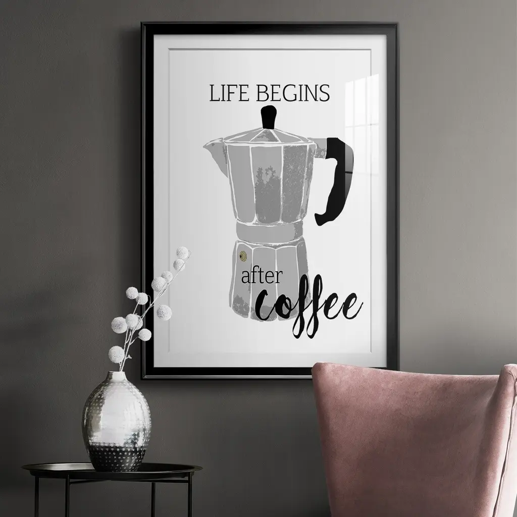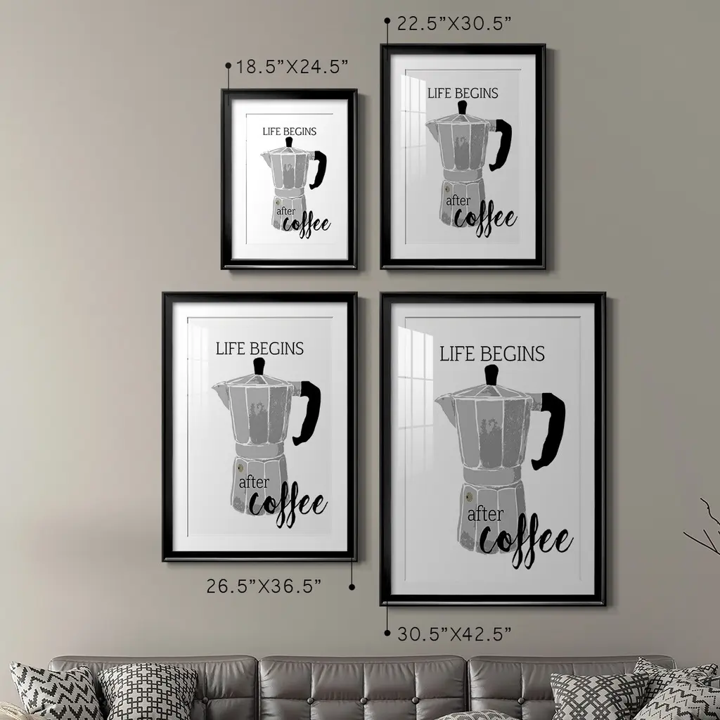 Begins After Coffee Premium Framed Print - Ready to Hang A Premium Framed Print created to last. Framed in distressed wood and available in an array of sizes and colors Featuring a beveled a solid wood stretcher bar, each piece comes ready to hand 4 SIZES AVAILABLE 30.5''X42.5'' - Overall Size 26.5'X36.5'' - Overall Size 22.5''x30.5'' - Overall Size 18.5''x24.5'' - Overall Size Each piece is made to order. Each piece comes with hanging hardware. Made in the USA Ready to Hang Giclee Paper Print Acrylic Glass Beveled Matt Board