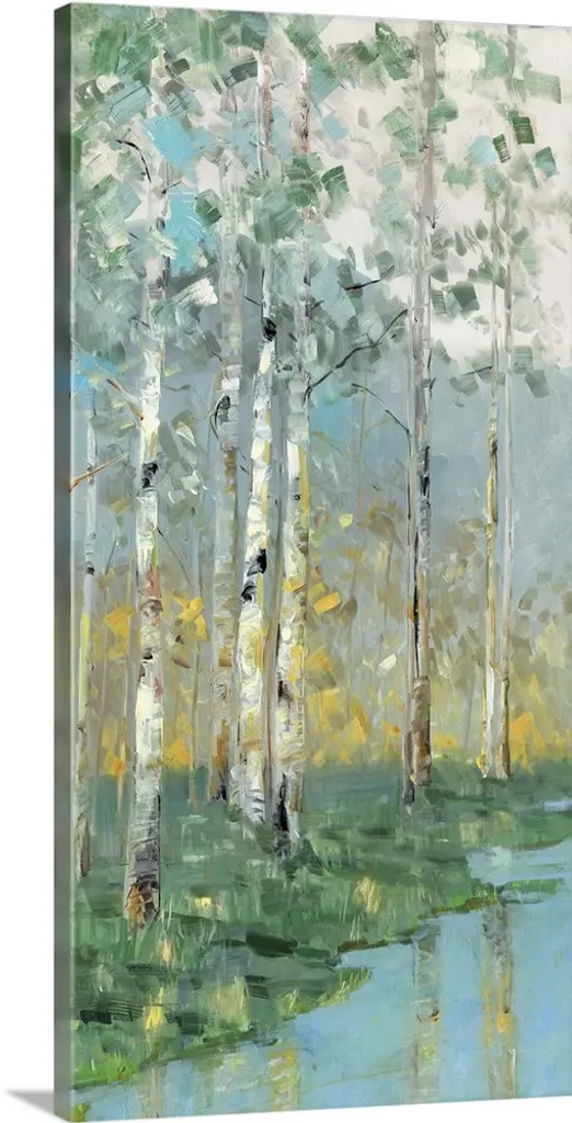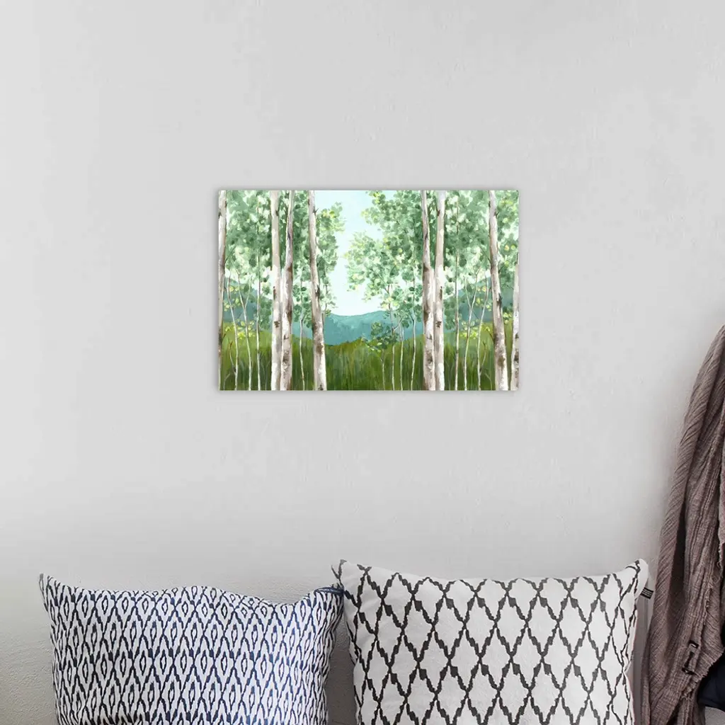 Contemporary painting of rows of trees with textured leaves in colors of green and yellow with mountains in the background.