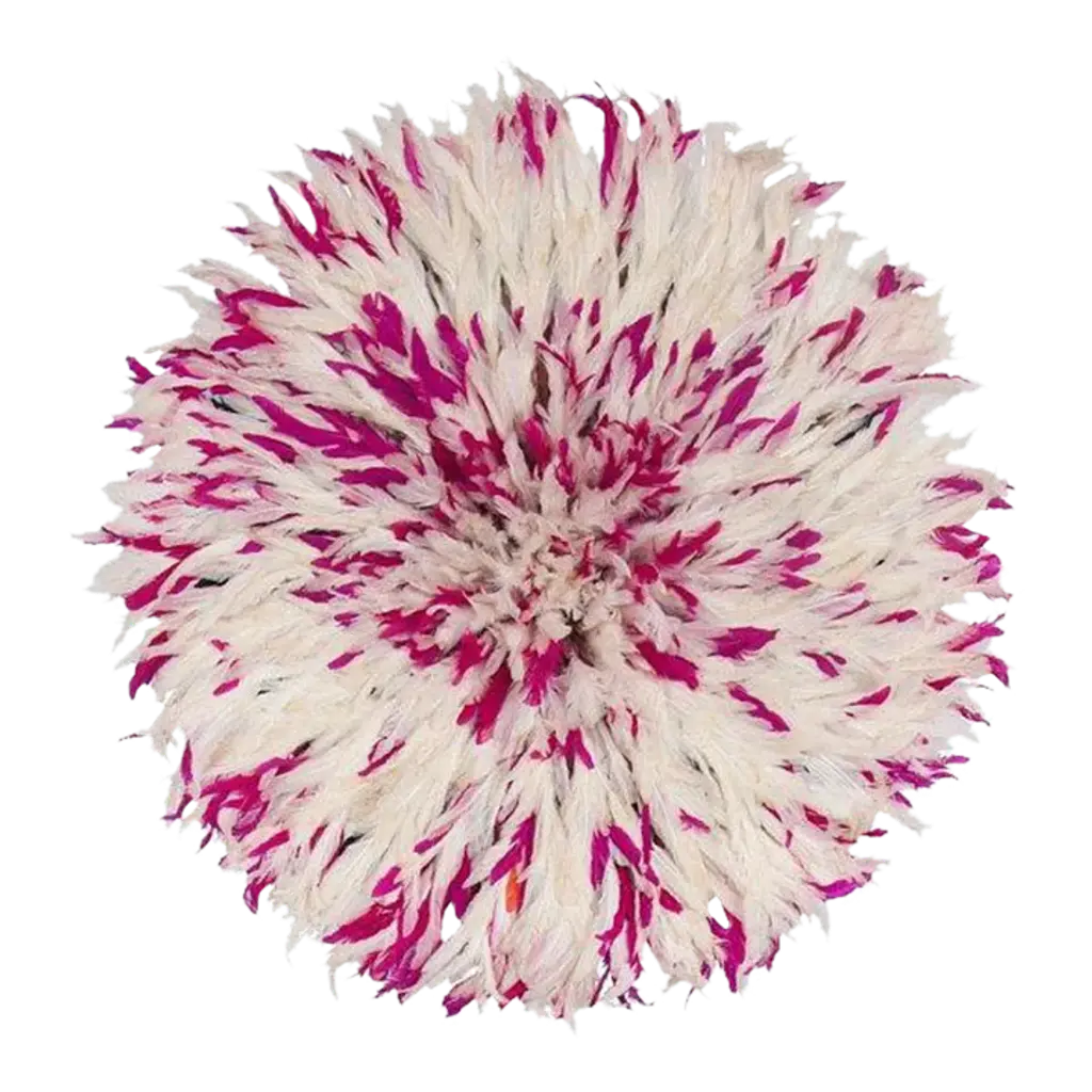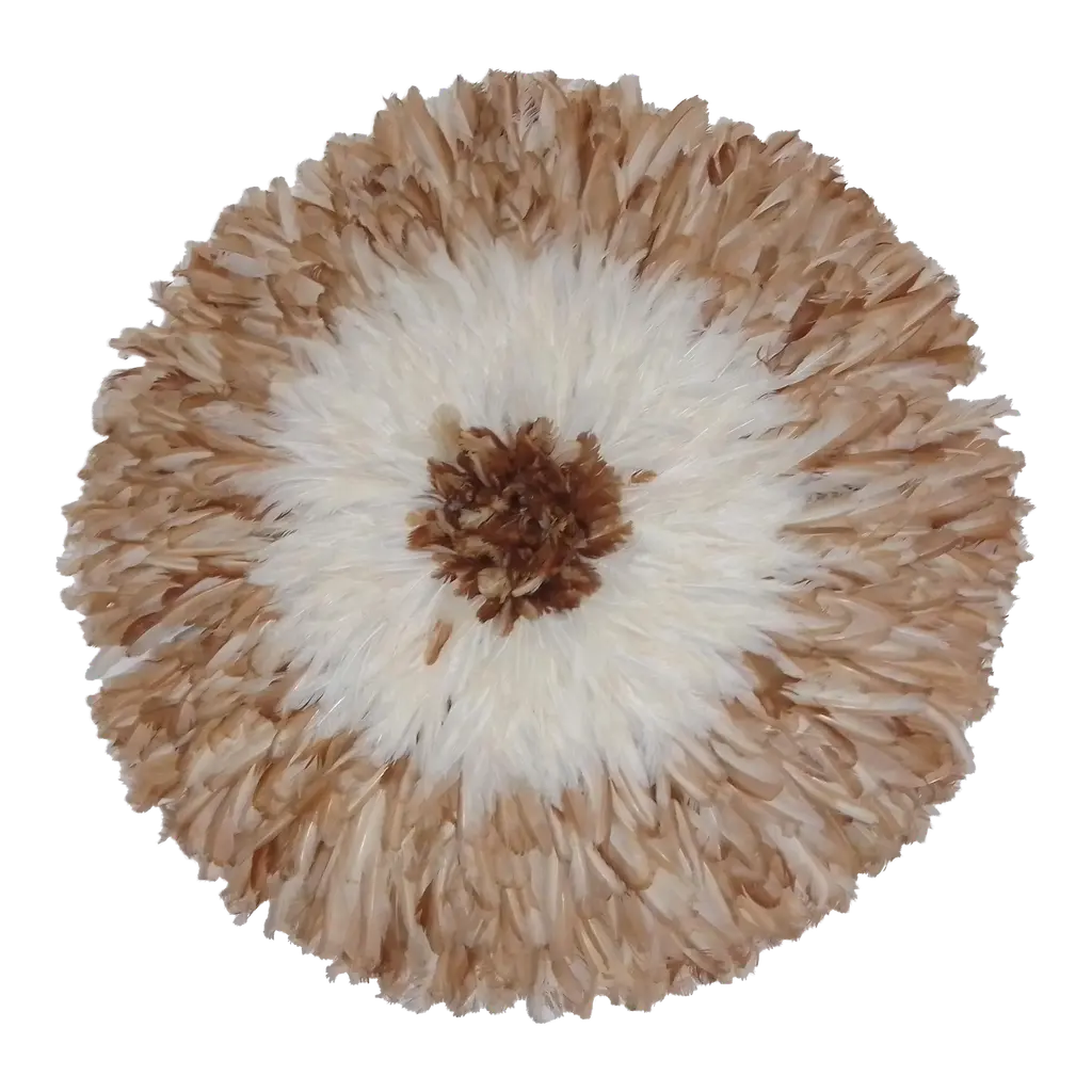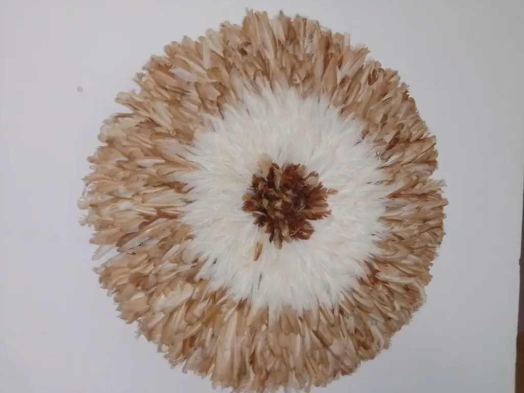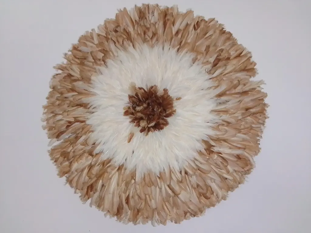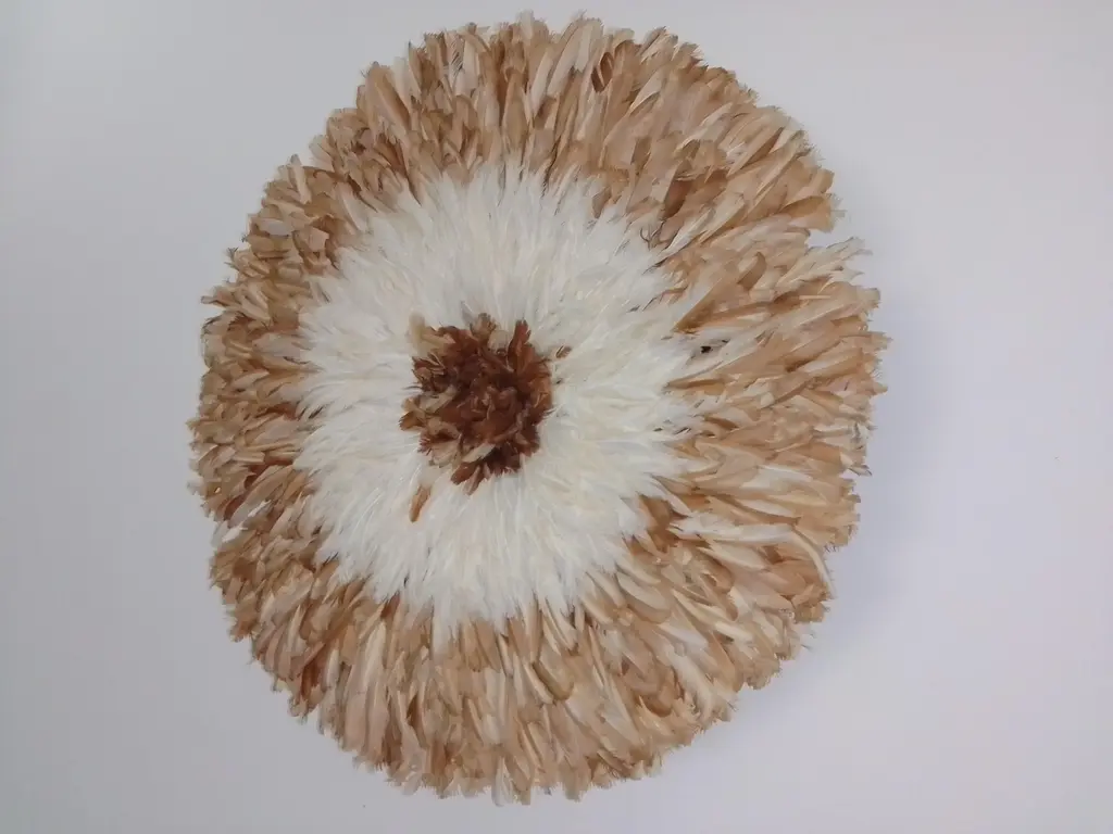 Juju hat beige and white of 31" (80 cm). Juju hat made with natural feathers and rattan. Juju hat woven and handcrafted. Beautiful wall decoration object that will enhance your interior. You can hang it on the wall of your living room, your dining room, your bedrooms, your hallways, your entrance, the wall of your stairs.