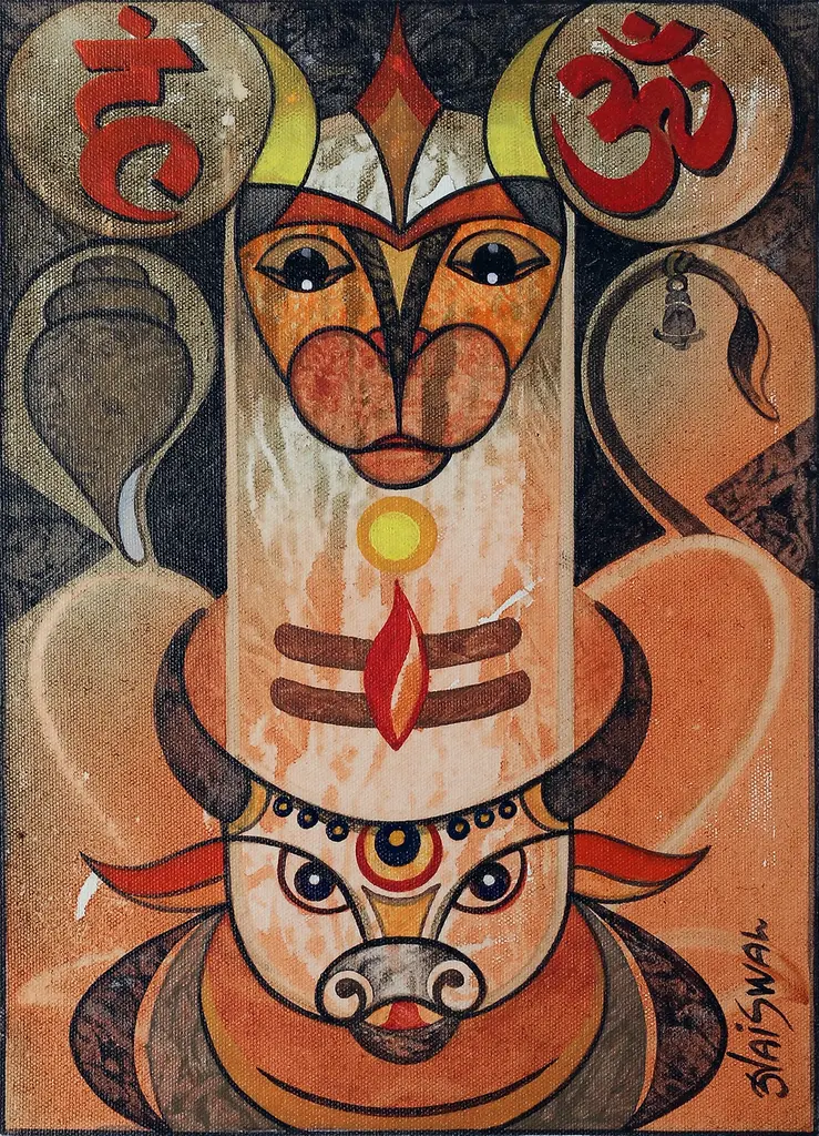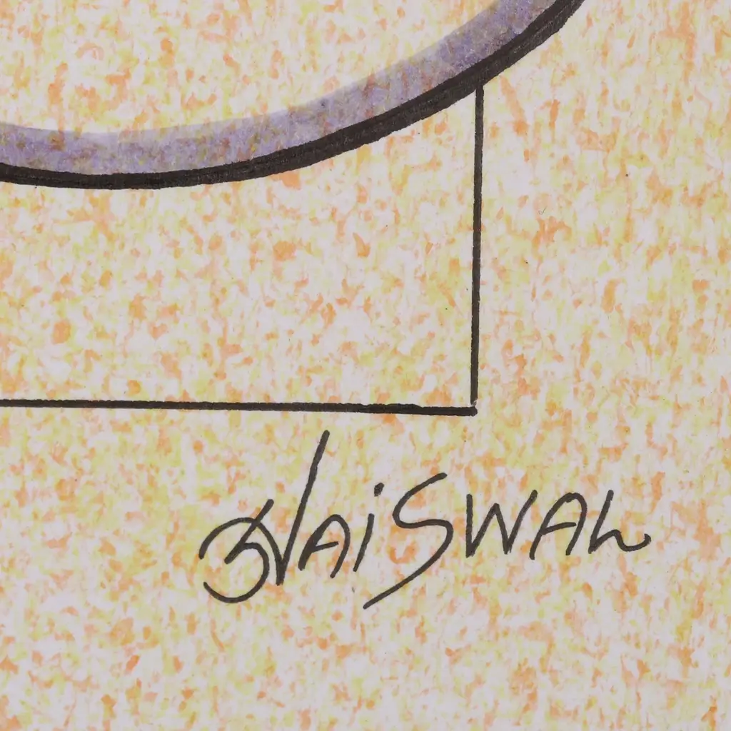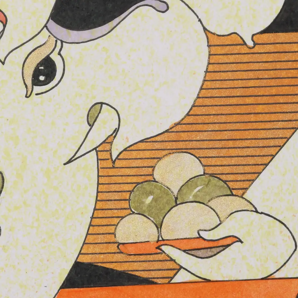 Working in an expressionist style that evokes Indian folk art techniques, Sunil Jaiswal paints this multimedia composition. He uses watercolor, acrylic, and ink on handmade paper to create this auspicious depiction of the Hindu god Ganesha. Sitting behind an orange triangle with intricate motifs, the Hindu god is depicted with two heads, holding one hand in a symbol of peace with a bowl of his favorite dessert, laddu, in the other hand. His mouse companion munches on a snack in the foreground. This depiction is known as Dvimukha Ganapati, or "two-faced Ganesha."