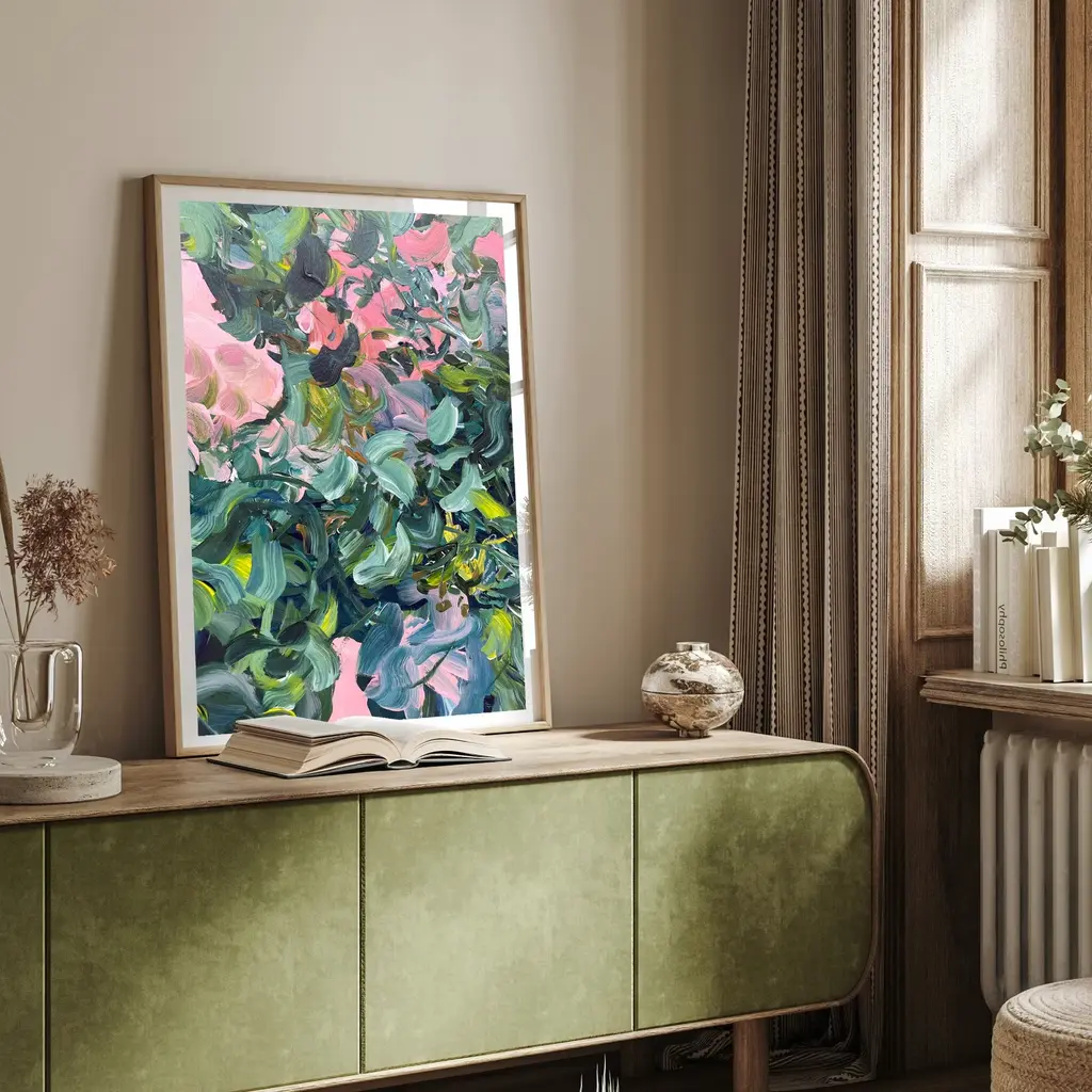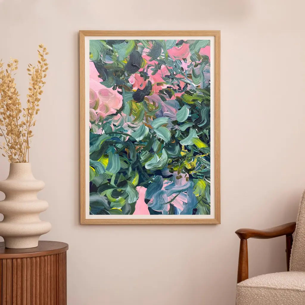 Inspired by the first blossom of spring, this abstract floral print captures the jewel-like beauty of flowers in morning dew. Tonal sages and evergreens combined with coral pinks, deep forest greens and splashes of blue provide a beautiful addition to interiors where a calm and mindful atmosphere is sought.Printed on heavyweight 316gsm cotton rag textured paper using archival-quality inks, this A3 giclée print will maintain its beautiful vibrancy for many years to come. Each print has a white border so it can easily fit into a standard size frame. Print is sold unframed.