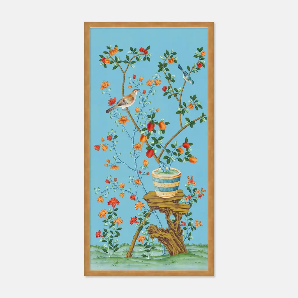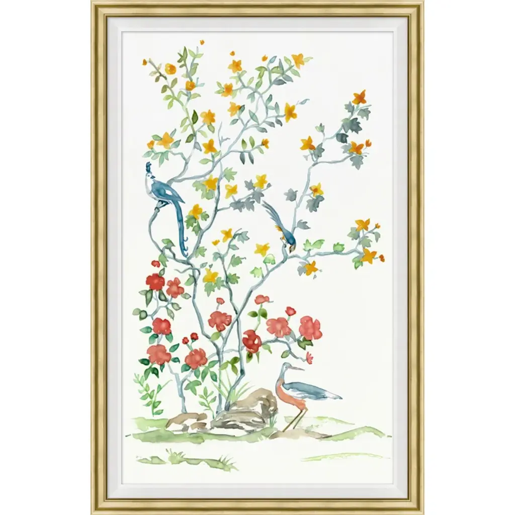 DESCRIPTION: BelAire by Paul Montgomery in Gold Frame, Large Art Print SPECIFICATIONS: Type: Framed Paper. Framed Size (in): 20x40. Orientation: Vertical. Flush/Float/Matted: Flush. Frame Color: Gold. Hanging Hardware: Picture Perfect. FRAMING: Each art work arrives framed and ready to hang. We use handmade frames with a plexiglass glazing front, because it offers less glare than standard glass. At this time, we only offer framed prints. ARTIST BIO: Paul Montgomery has been an artist his entire life, and has proven to be versatile and engaging in a broad range of mediums, styles and genres. Early paintings were copies of beloved old masters and the European schools. Still life studies and landscape painting were his favorite themes, and helped found his abilities at detail and realism. Chinoiserie was an inspiration after a visit to the Freer Gallery in Washington in his late teen years. This sparked a life-long love of the unique perspective of the sensitive interpretation of nature as seen in Asian paintings and screens.