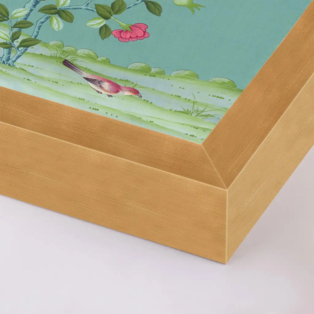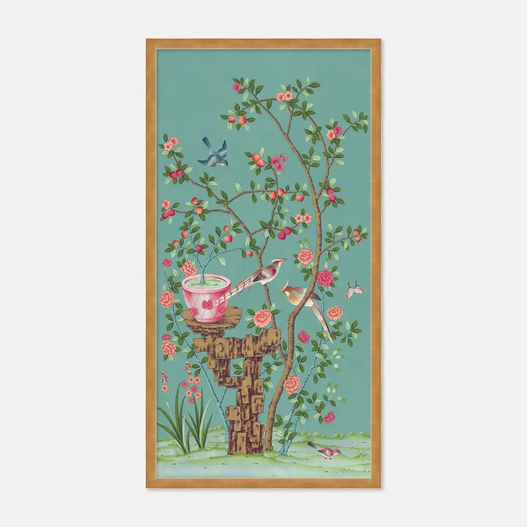 DESCRIPTION: BelAire Cerulean by Paul Montgomery in Gold Frame, Large Art Print SPECIFICATIONS: Type: Framed Paper. Framed Size (in): 20.5x40. Orientation: Vertical. Flush/Float/Matted: Flush. Frame Color: Gold. Hanging Hardware: Picture Perfect. FRAMING: Each art work arrives framed and ready to hang. We use handmade frames with a plexiglass glazing front, because it offers less glare than standard glass. At this time, we only offer framed prints. ARTIST BIO: Paul Montgomery has been an artist his entire life, and has proven to be versatile and engaging in a broad range of mediums, styles and genres. Early paintings were copies of beloved old masters and the European schools. Still life studies and landscape painting were his favorite themes, and helped found his abilities at detail and realism. Chinoiserie was an inspiration after a visit to the Freer Gallery in Washington in his late teen years. This sparked a life-long love of the unique perspective of the sensitive interpretation of nature as seen in Asian paintings and screens.