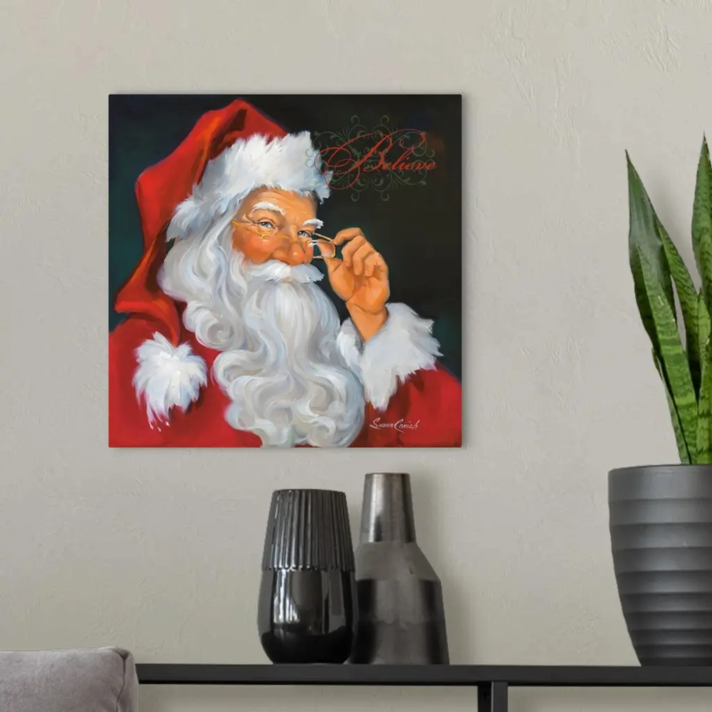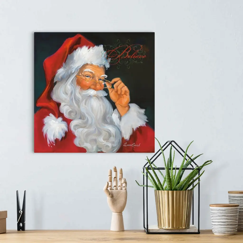 Fine art painting of Santa Claus in a red suit with the word "Believe" above his head.