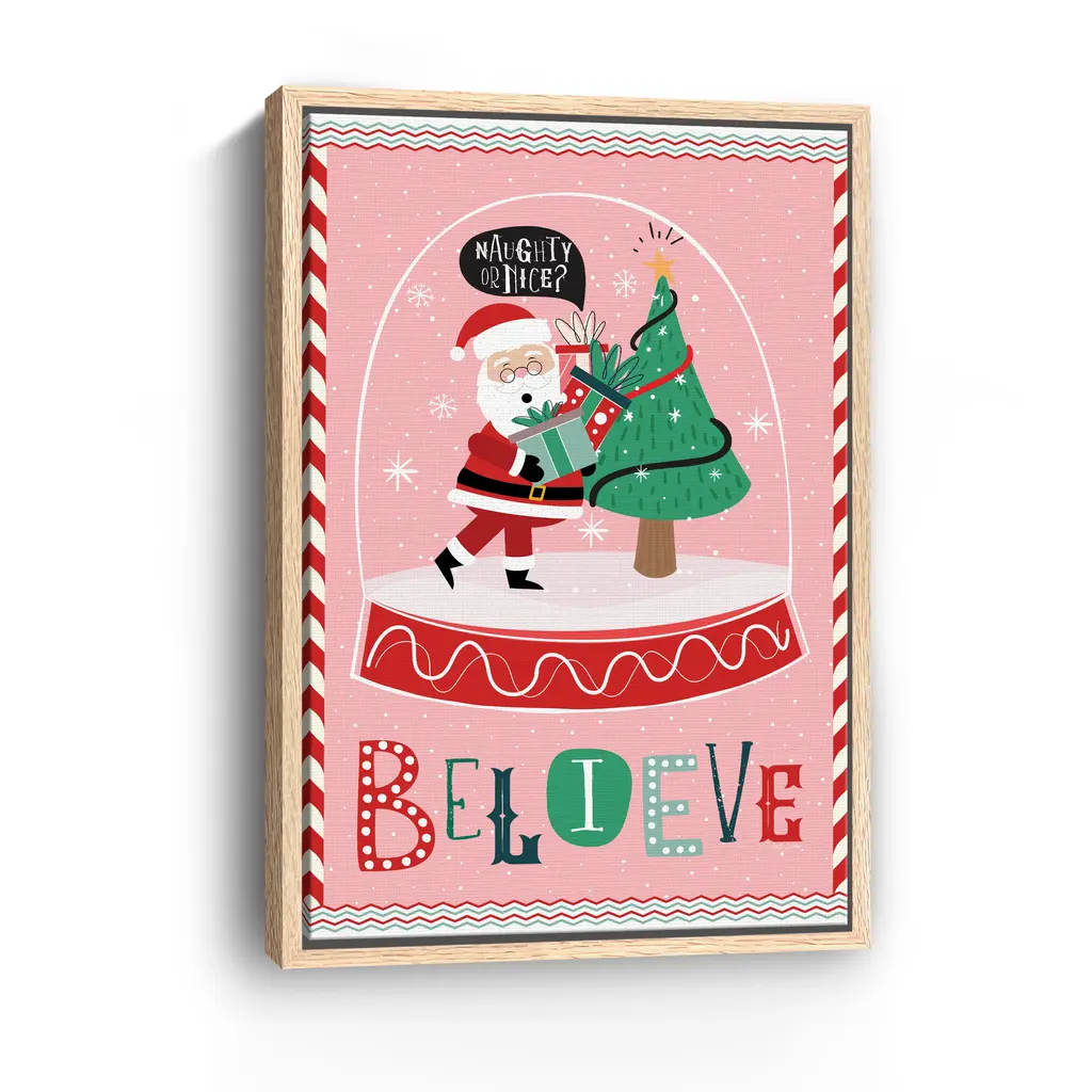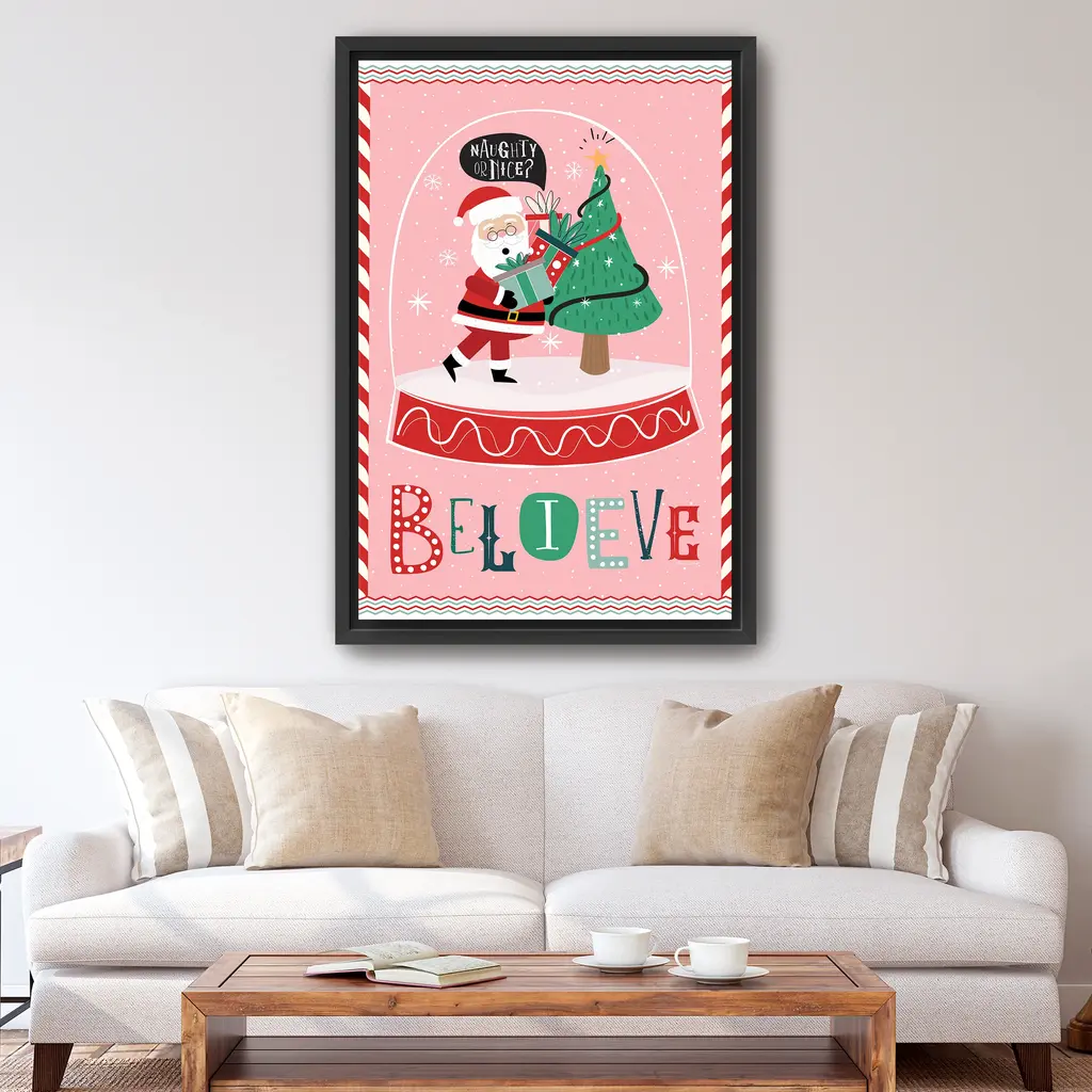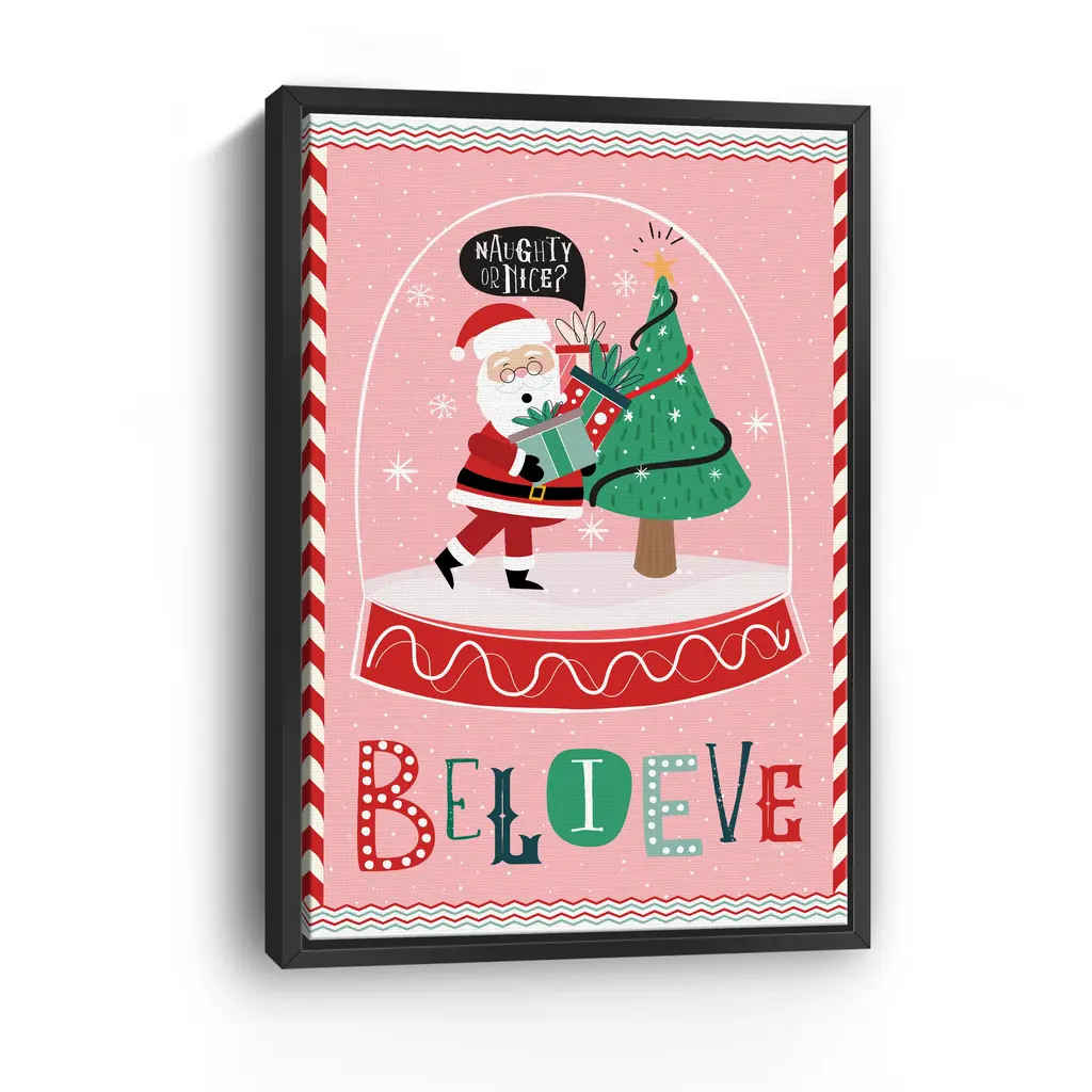 Celebrate the magic of the season with this whimsical canvas print featuring Santa Claus inside a festive snow globe. With vibrant colors, candy cane accents, and joyful typography, it brings playful charm to your holiday decor. Our Gallery Wrap Canvas Prints are proudly assembled with high quality materials in California, USA. Each piece is printed on a thick, archival grade canvas using Giclee technology. It is then hand-stretched by our experienced artisans over solid wood bars, which will not warp over time. The final product is a piece personally crafted for you to confidently display on your wall. Care and Assembly: Ensure that the location of your piece has little to no exposure to heat, sunlight, and moisture. Wipe clean, only if needed. Each piece includes hanging hardware to hang on your wall vertically.