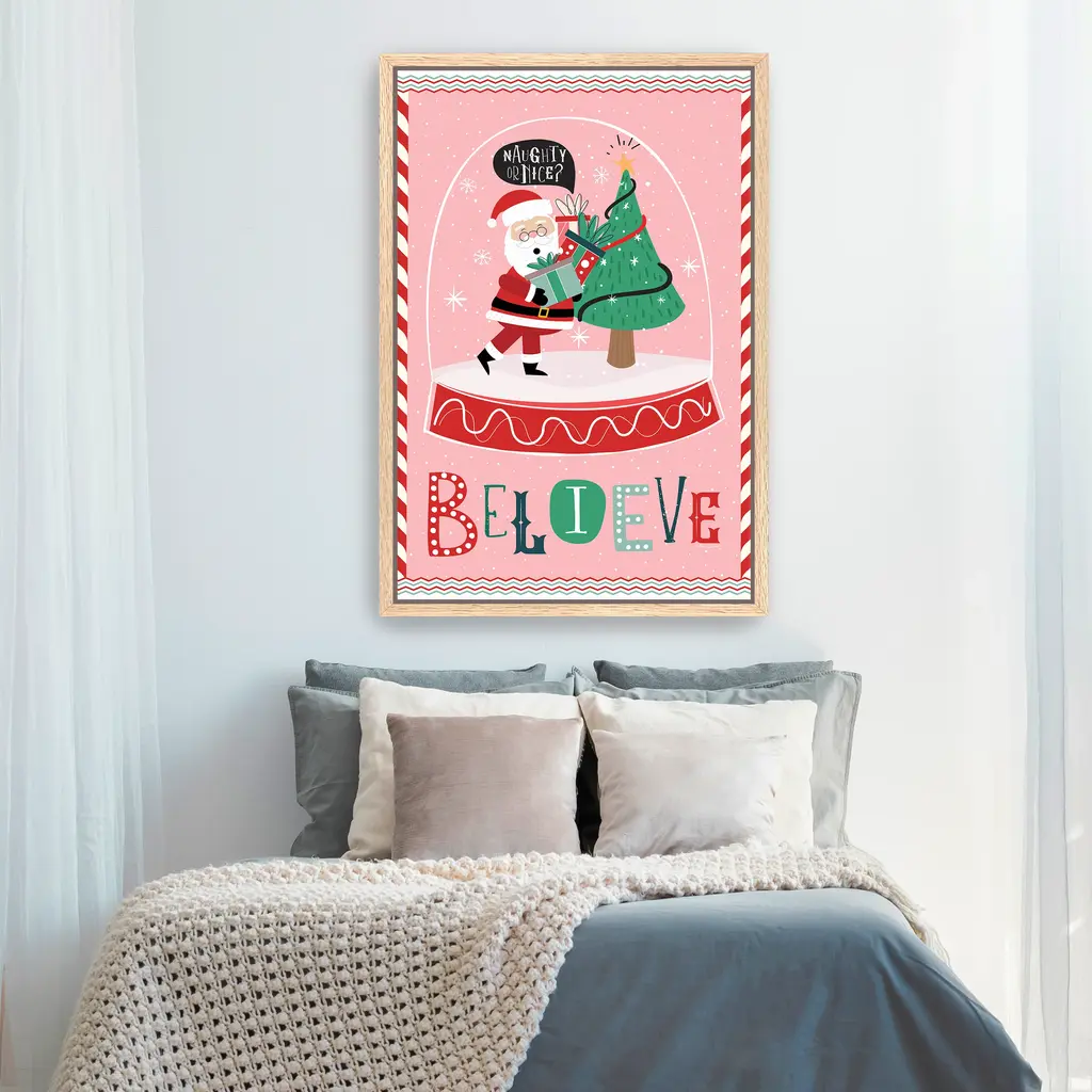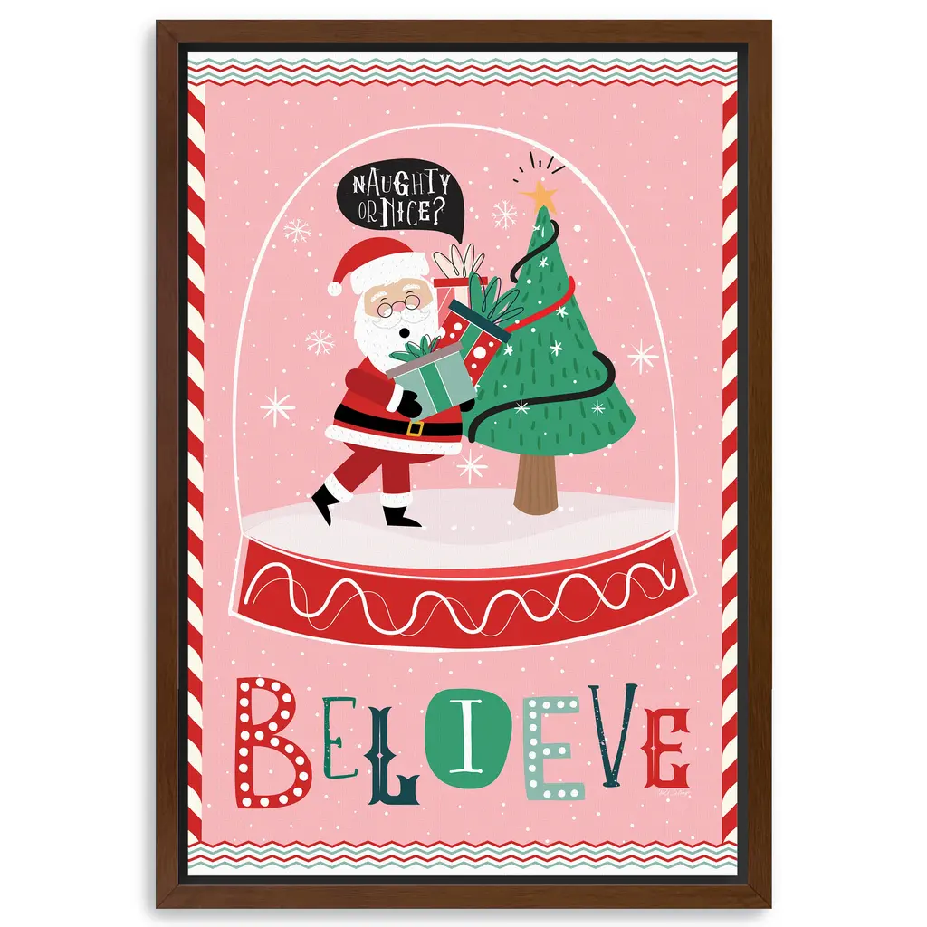 Celebrate the magic of the season with this whimsical canvas print featuring Santa Claus inside a festive snow globe. With vibrant colors, candy cane accents, and joyful typography, it brings playful charm to your holiday decor. Our Gallery Wrap Canvas Prints are proudly assembled with high quality materials in California, USA. Each piece is printed on a thick, archival grade canvas using Giclee technology. It is then hand-stretched by our experienced artisans over solid wood bars, which will not warp over time. The final product is a piece personally crafted for you to confidently display on your wall. Care and Assembly: Ensure that the location of your piece has little to no exposure to heat, sunlight, and moisture. Wipe clean, only if needed. Each piece includes hanging hardware to hang on your wall vertically.