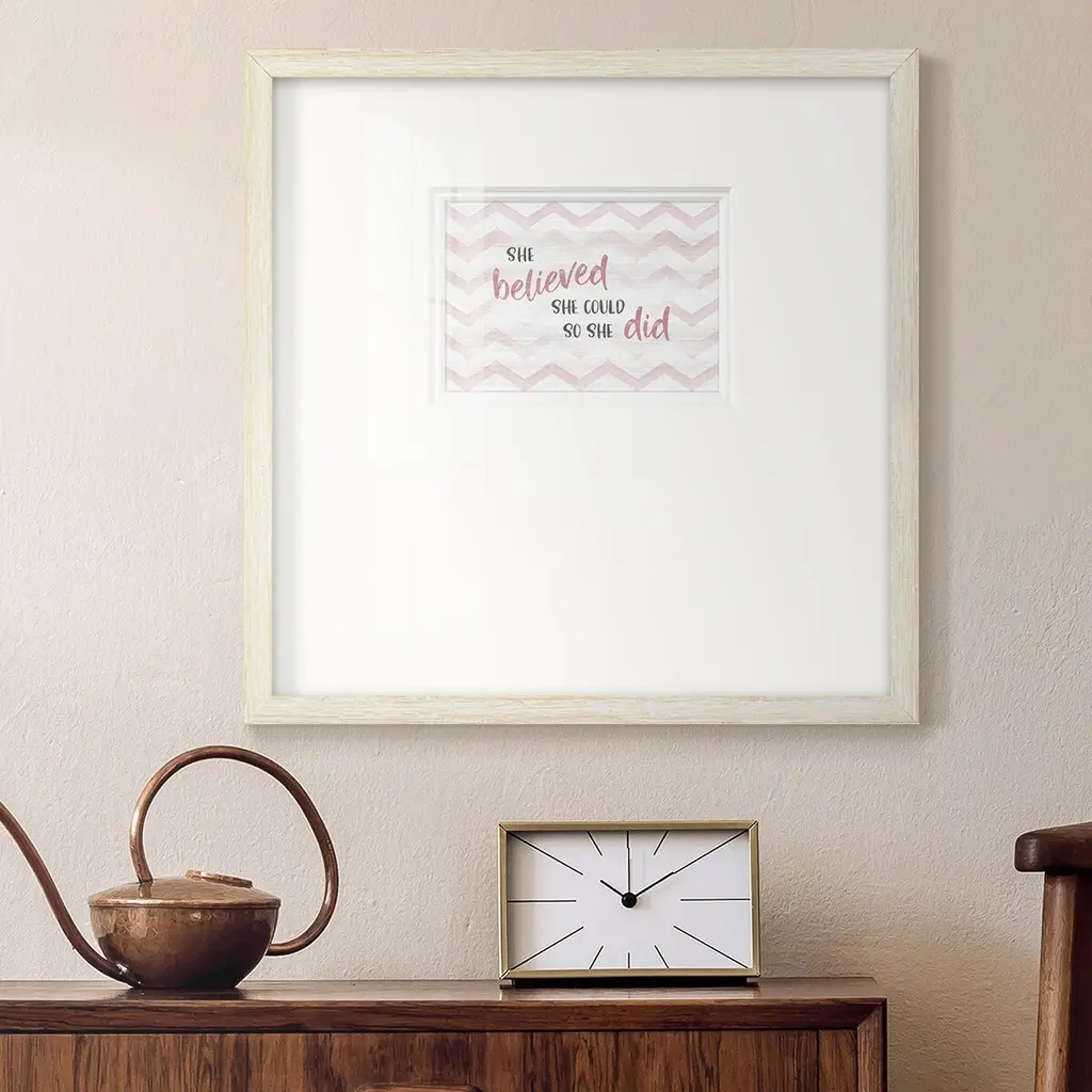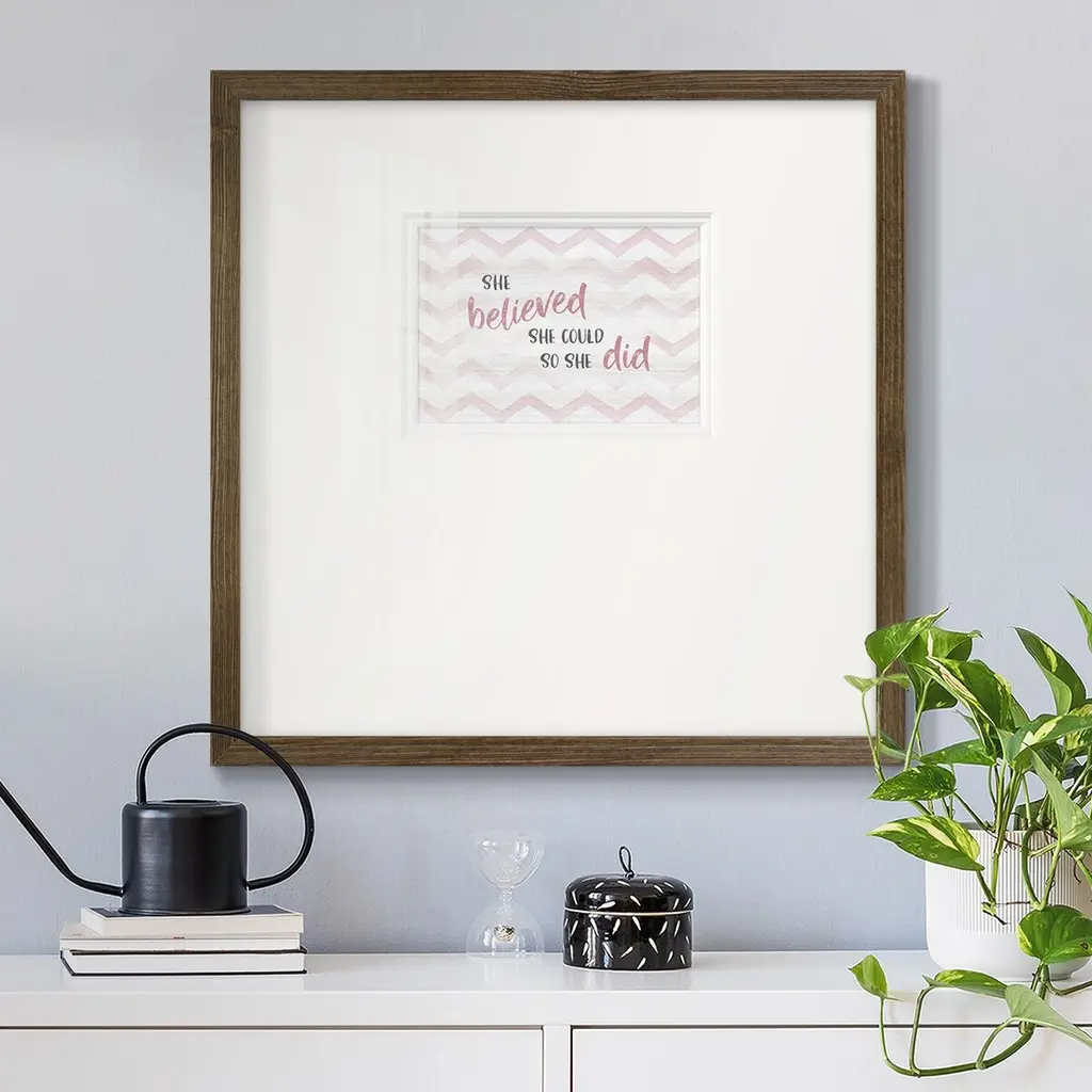 Believed She CouldPremium Framed Print A framed cold pressed paper print featuring superior double matting and quality frame. 2 SIZES AVAILABLE 16''X16''' - Overall Size 20''X20''' - Overall Size Each piece is made to order. Each piece comes with hanging hardware. Made in the USA Ready to Hang Giclee Paper Print Plexiglass Beveled Matt Board Double Matte Board