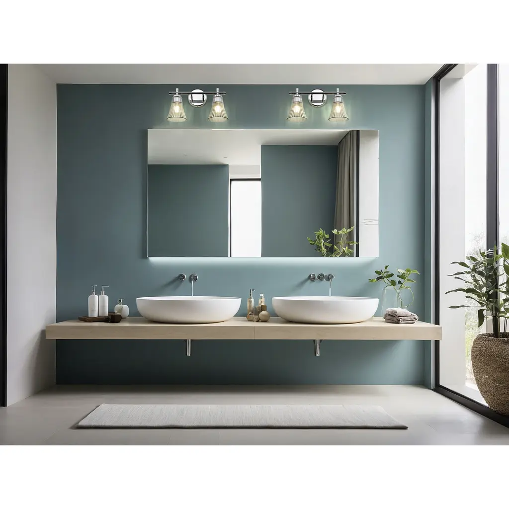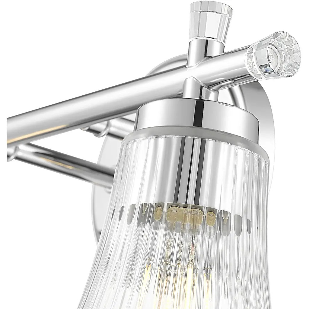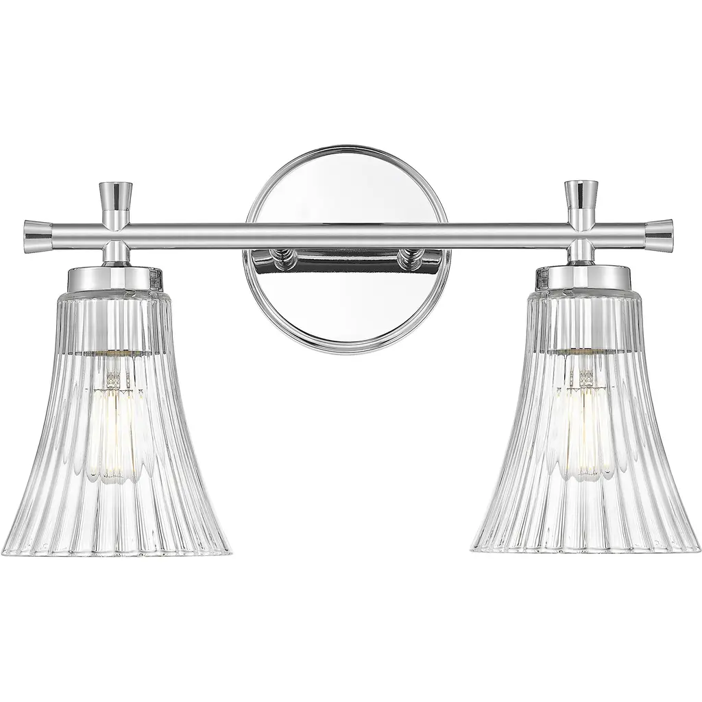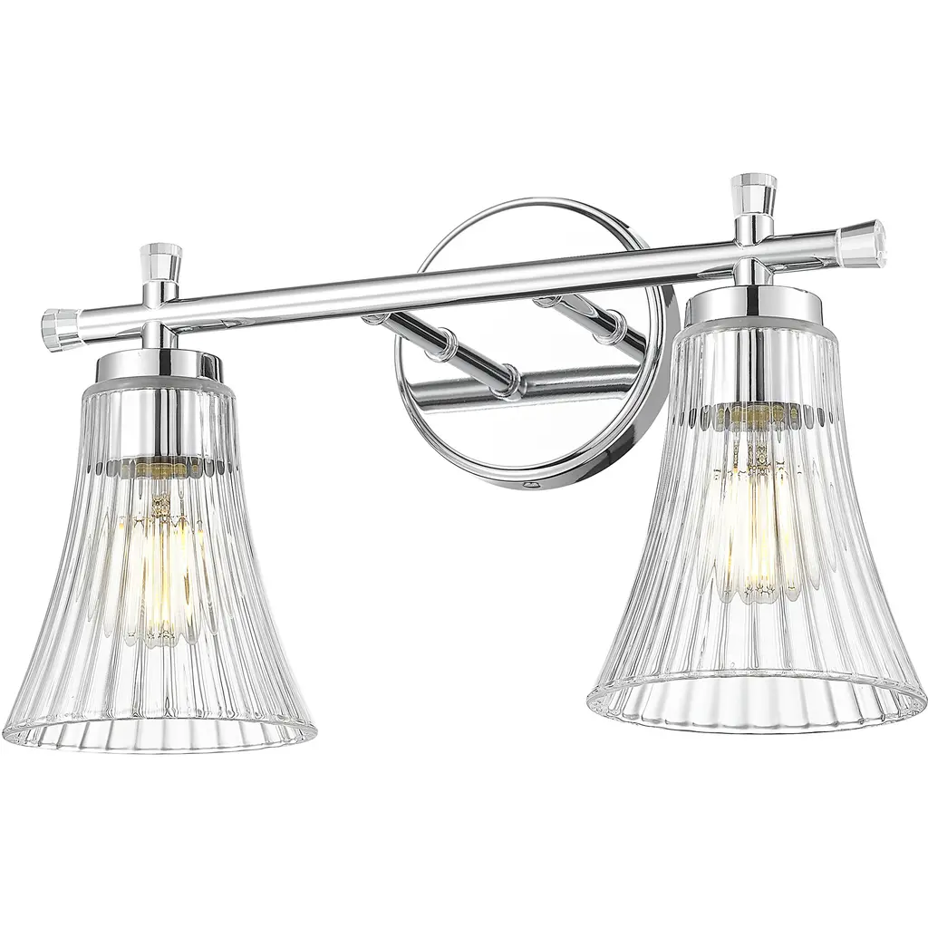 With its mirror-like chrome finish and sparkling fluted silhouette, this two-light vanity fixture is pure charm. Clear glass shades catch and reflect the light with graceful curves that feel both vintage and fresh. Its a beautiful choice for creating a bright, boutique-style bath.