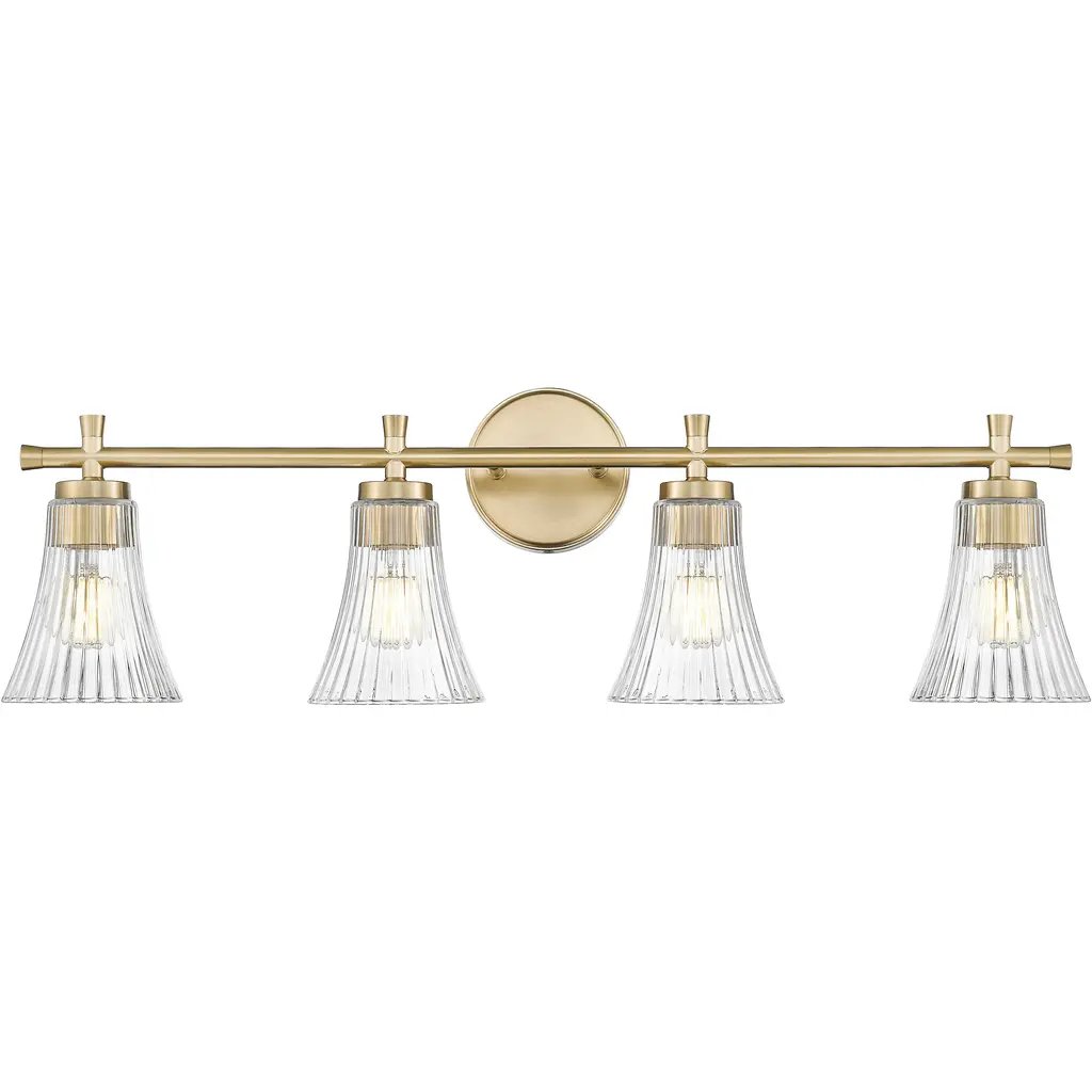 Glamor gets a graceful twist in this four-light vanity fixture with a modern gold finish. Fluted clear glass shades add delicate sparkle, reminiscent of vintage crystal details with a fresh, contemporary edge. Its a radiant blend of warmth and elegance that softens every space it touches.