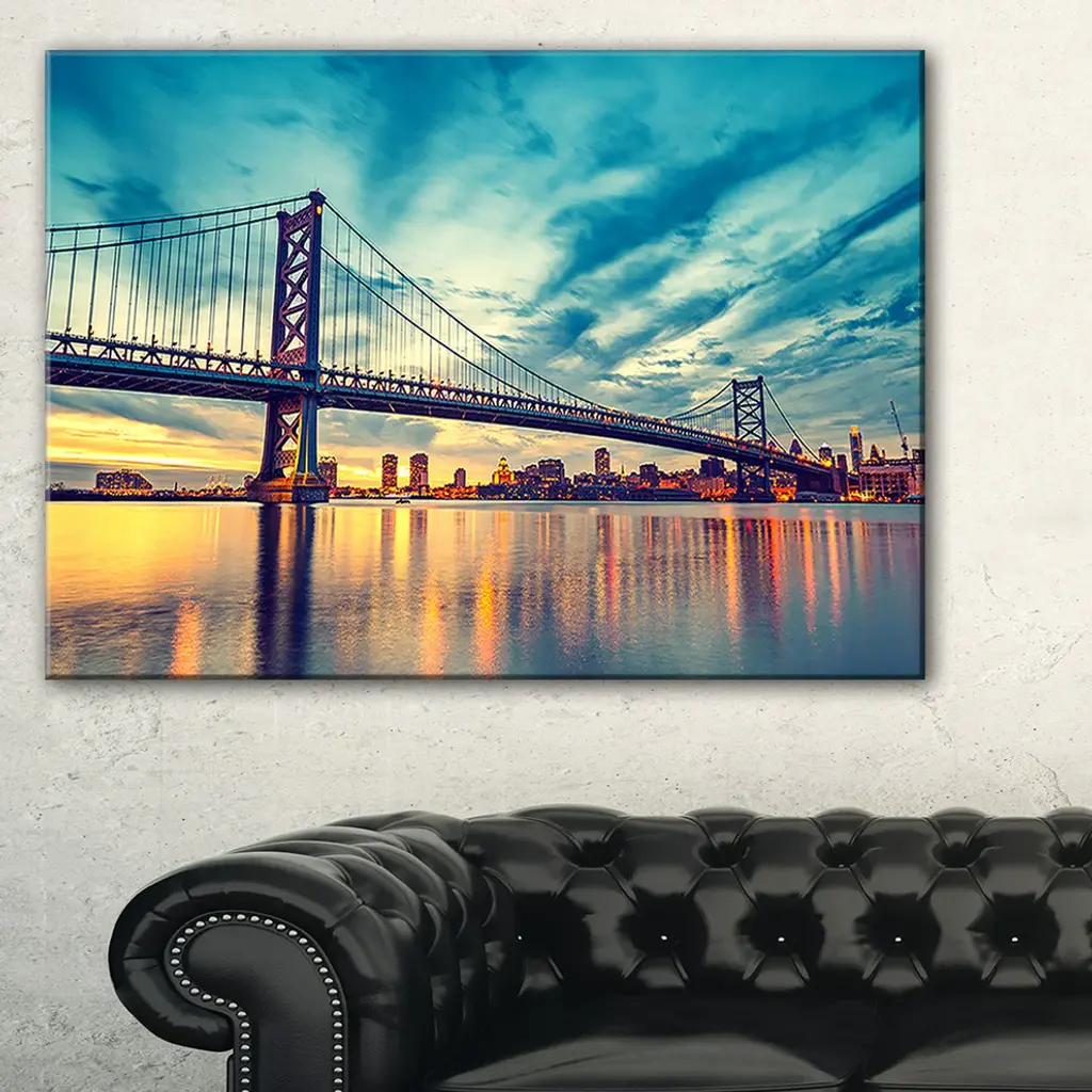 The Ben Franklin Bridge in Philadelphia canvas art print is sure to make an impression on anyone who sees it. This artwork is gallery wrapped around a 1-inch solid wood frame and arrives carefully packaged and entirely ready to hang on the wall. Design Art only uses the highest resolution and pigments to ensure a crisp colorful print that is never faded or pixelated. This artwork is sure to be a conversation starter in any home or office.