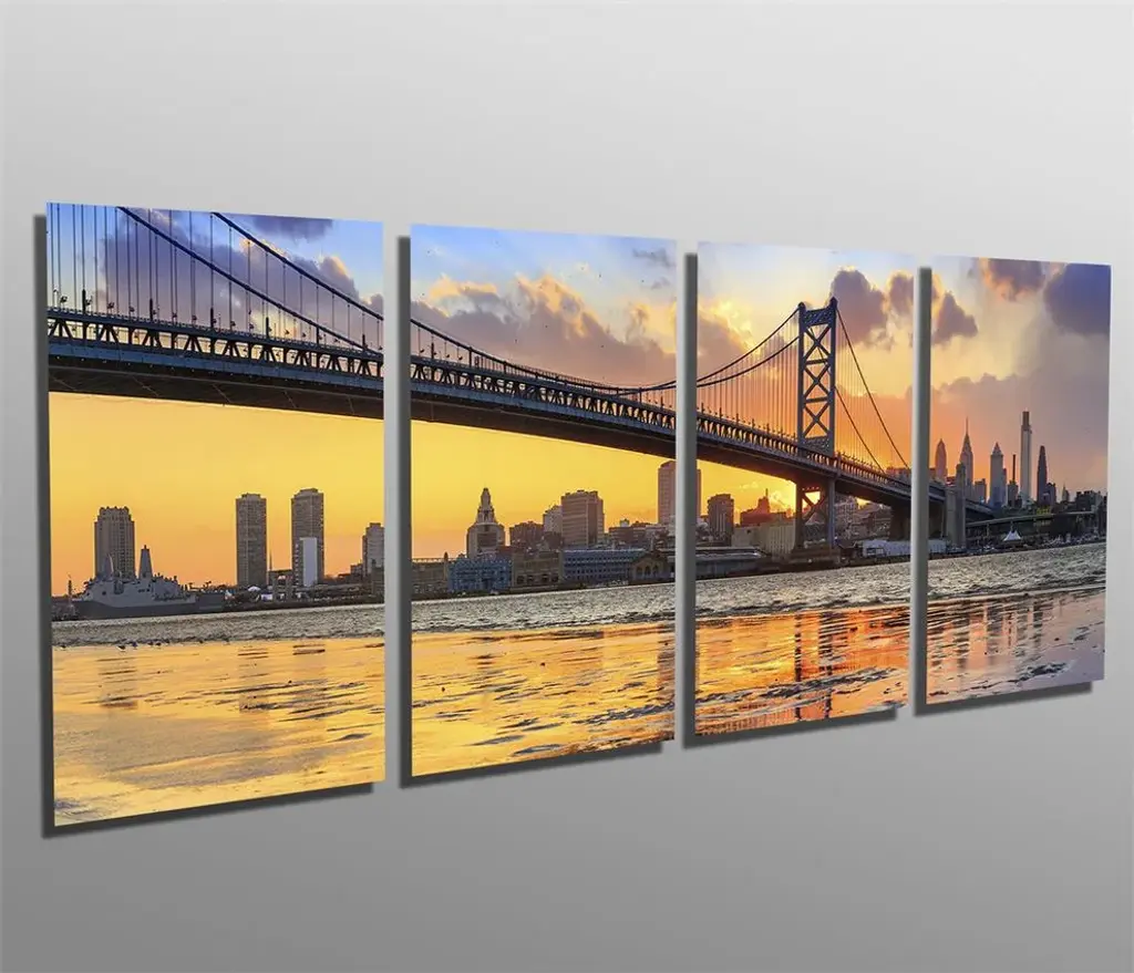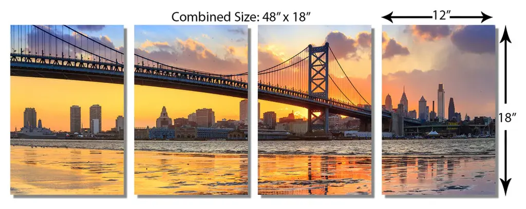 48"œ x 18"œ total size. Ready To Hang! (4 pieces - 12"œ x 18"œ each). 4 Panel Split Metal Print of Philadelphia skyline, Ben Franklin Bridge in the evening. Modern metal wall art for home or office wall decor & interior design. Printed on Luxurious, HD aluminum glossy metal panels. Multi panel art.. HD aluminum panels. Metal print wall art. Includes Shadow Wall Mount on the back.• Aluminum Metal Wall Art• Made in USA• Ready to hang - No assembly required• Shadow mount hardware on the back• 0.045"œ thick HD Aluminum Panels• Scratch resistant, glossy finish• Superb color clarity, luxurious prints• Epson printing process• For indoor or moisture rich environment use• Easy to clean. Gently wipe with microfiber cloth.