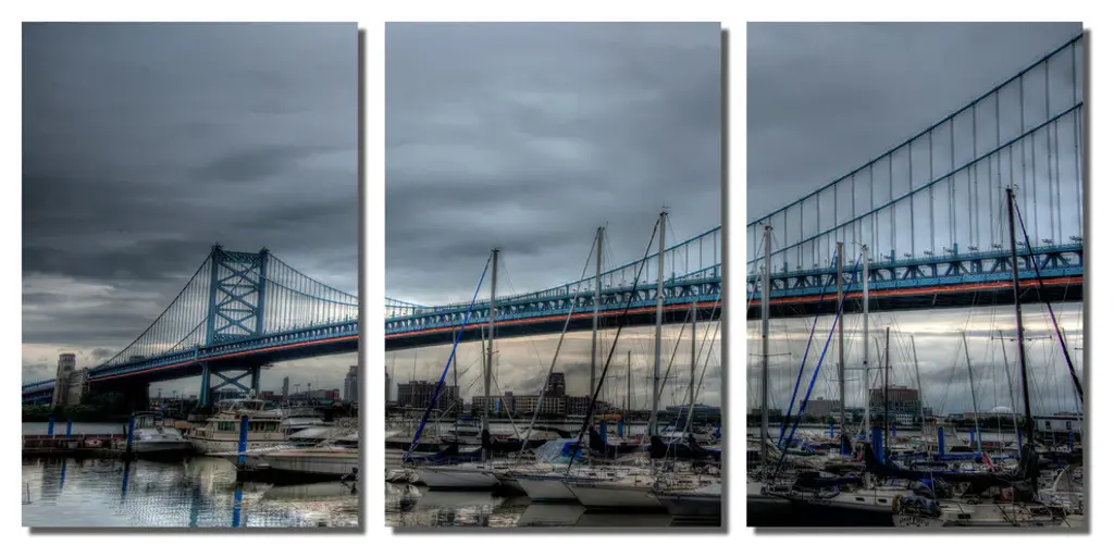 36"œ x 18"œ total size. Ready To Hang! (3 pieces - 12"œ x 18"œ each). 3 Panel Split (Triptych) Metal Print of Ben Franklin Bridge in Philadelphia during a cloudy day. Modern metal wall art for home or office wall decor & interior design. Printed on Luxurious, HD aluminum glossy metal panels. Multi panel art.. HD aluminum panels. Metal print wall art. Includes Shadow Wall Mount on the back.• Aluminum Metal Wall Art• Made in USA• Ready to hang - No assembly required• Shadow mount hardware on the back• 0.045"œ thick HD Aluminum Panels• Scratch resistant, glossy finish• Superb color clarity, luxurious prints• Epson printing process• For indoor or moisture rich environment use• Easy to clean. Gently wipe with microfiber cloth.