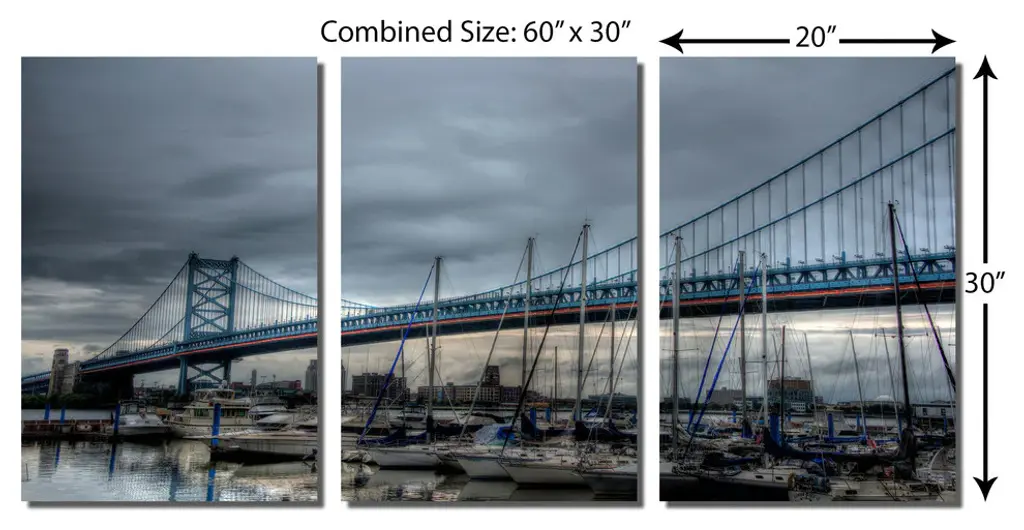 60"œ x 30"œ total size. Ready To Hang! (3 pieces - 20"œ x 30"œ each). 3 Panel Split (Triptych) Metal Print of Ben Franklin Bridge in Philadelphia during a cloudy day. Modern metal wall art for home or office wall decor & interior design. Printed on Luxurious, HD aluminum glossy metal panels. Multi panel art.. HD aluminum panels. Metal print wall art. Includes Shadow Wall Mount on the back.• Aluminum Metal Wall Art• Made in USA• Ready to hang - No assembly required• Shadow mount hardware on the back• 0.045"œ thick HD Aluminum Panels• Scratch resistant, glossy finish• Superb color clarity, luxurious prints• Epson printing process• For indoor or moisture rich environment use• Easy to clean. Gently wipe with microfiber cloth.