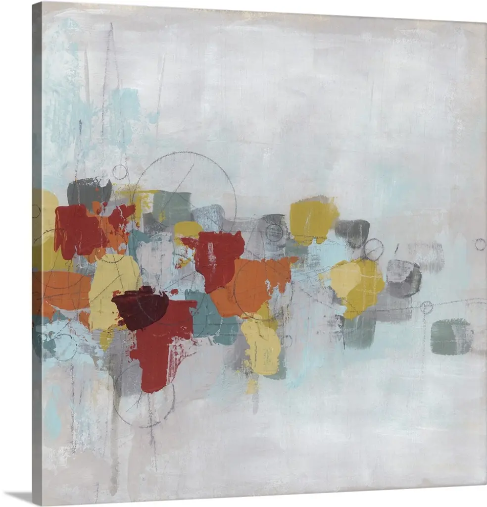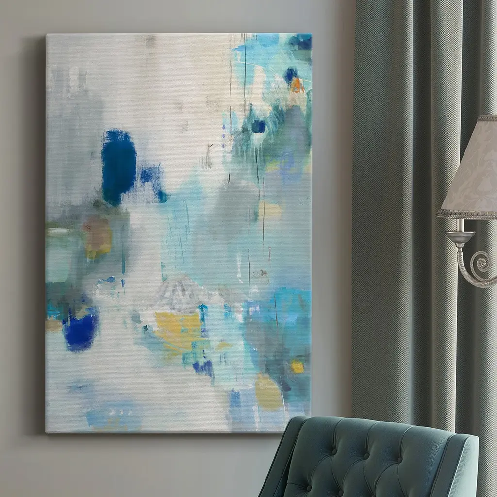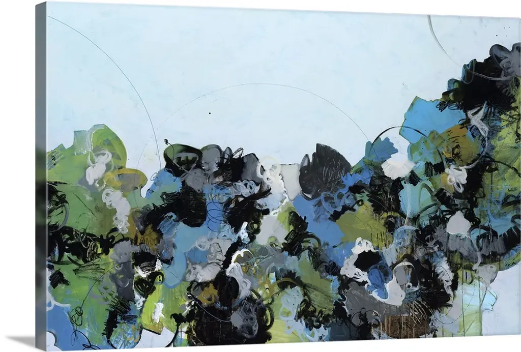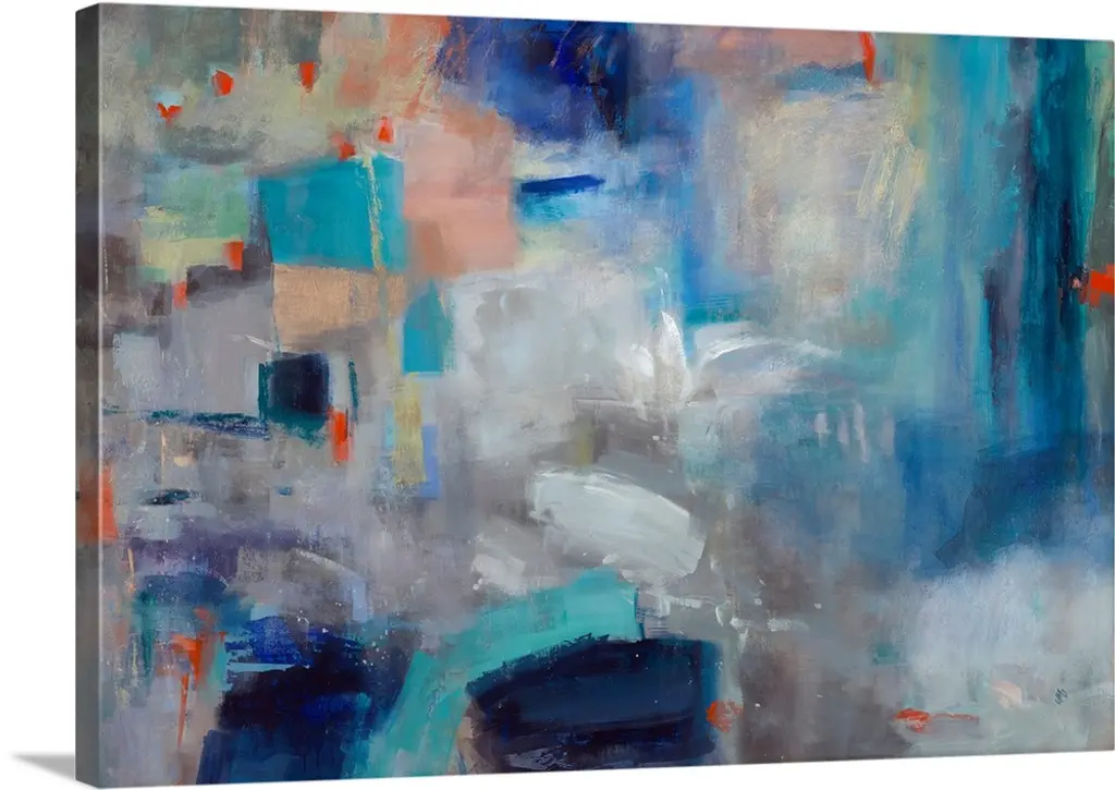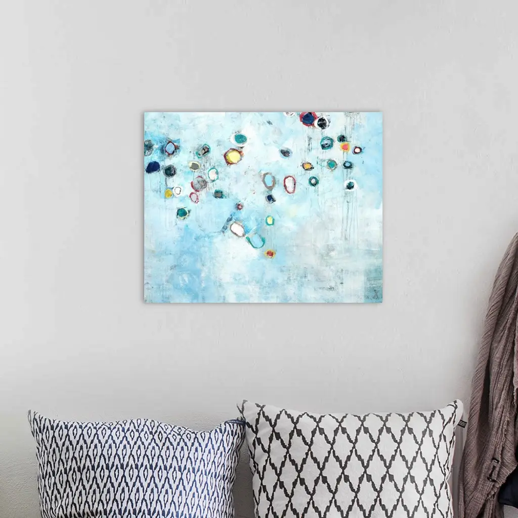 Contemporary abstract painting using pale distressed blue and small colorful organic shapes.