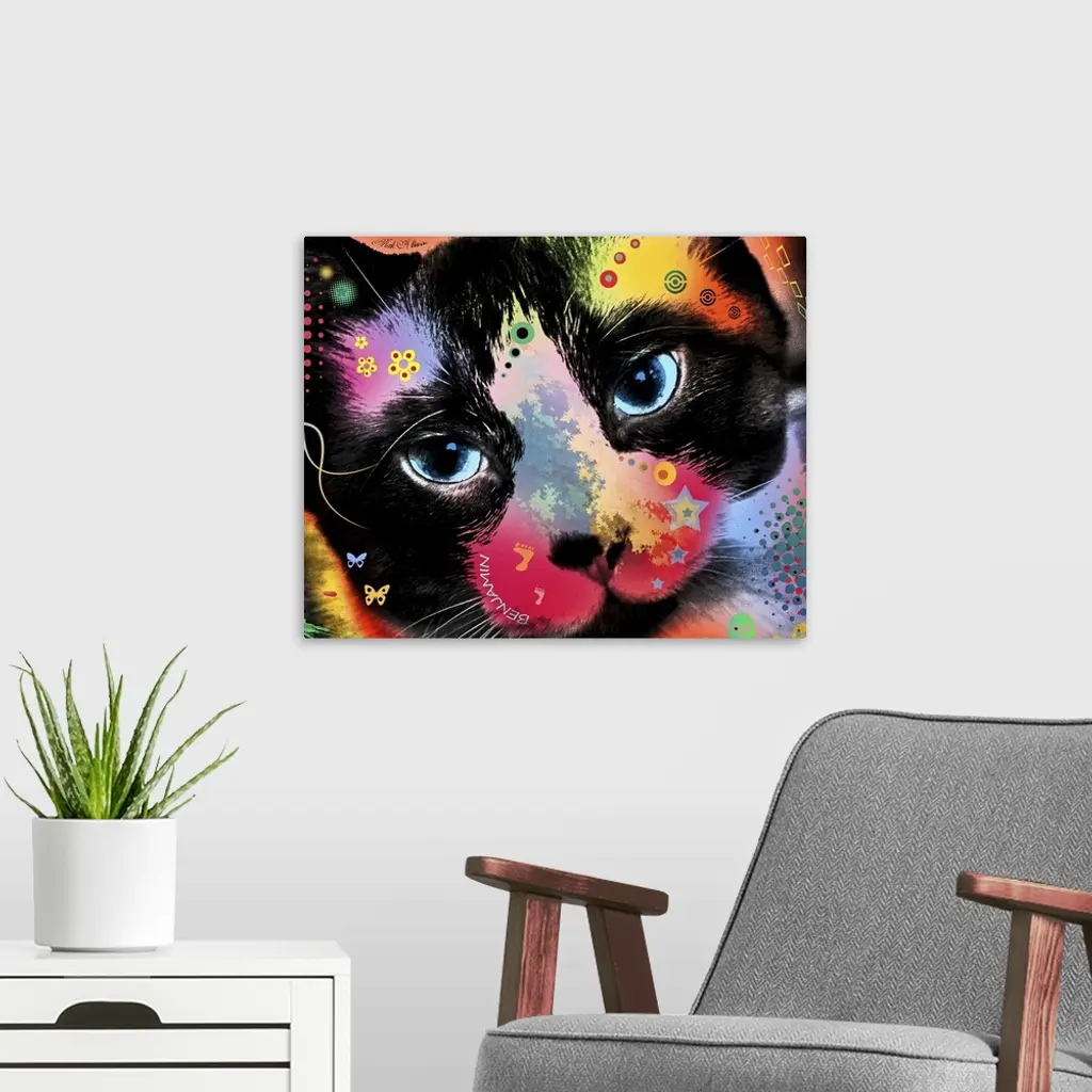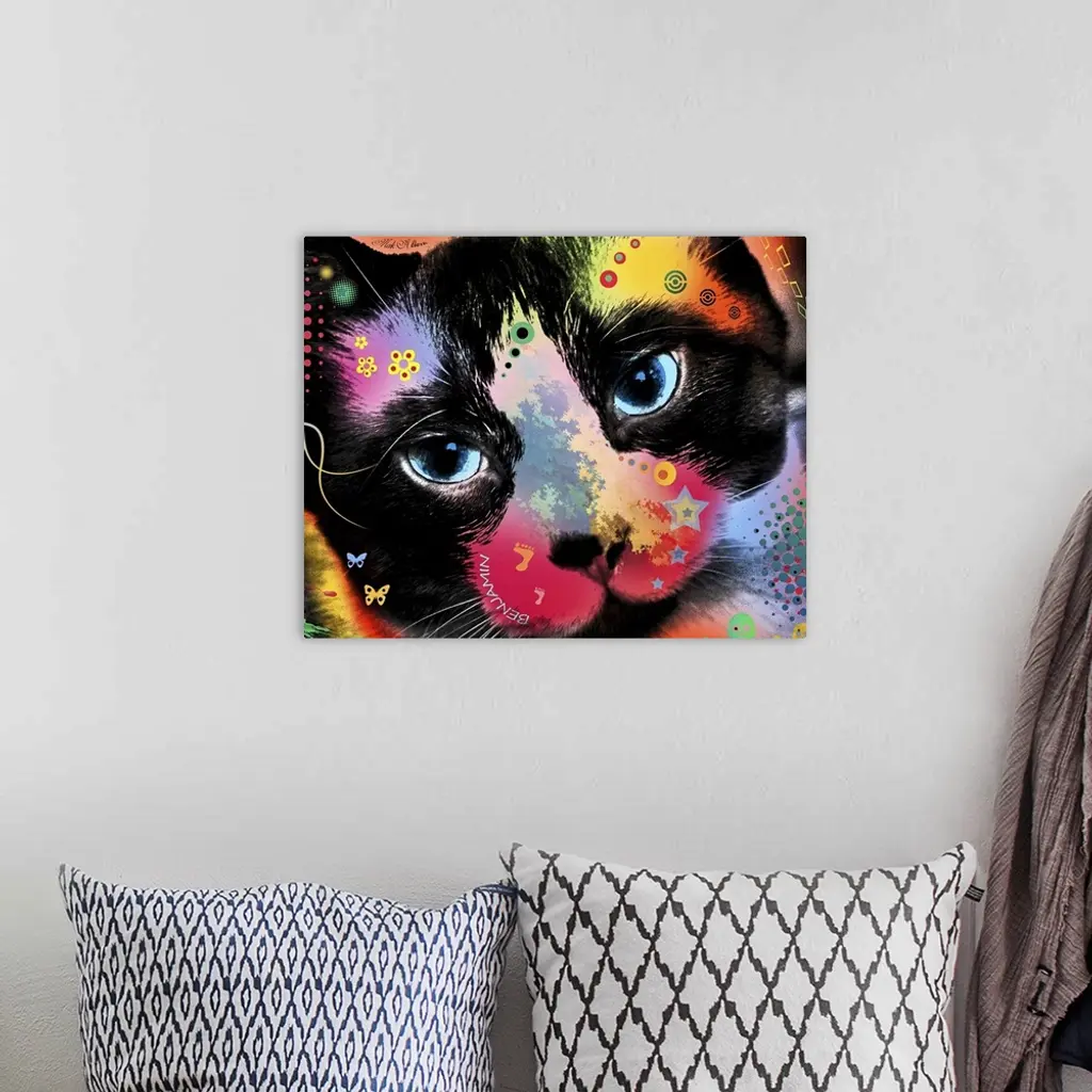 Contemporary artwork of a cat colored in an array of bright and vibrant colors.