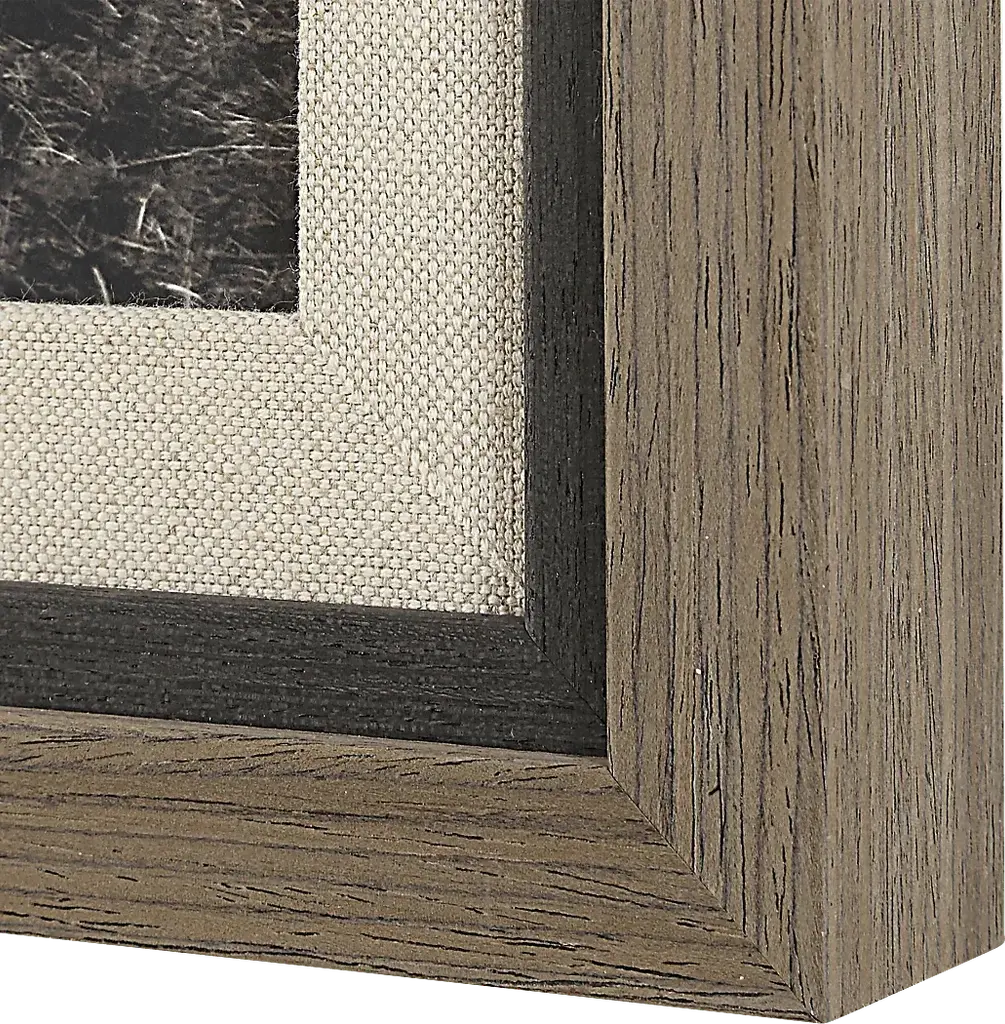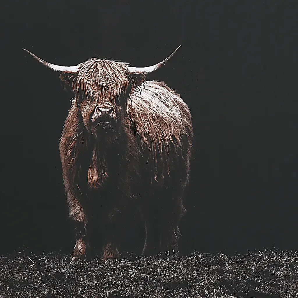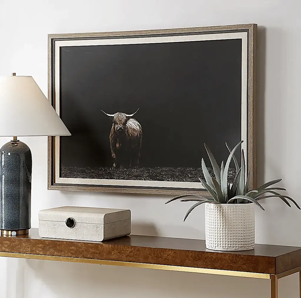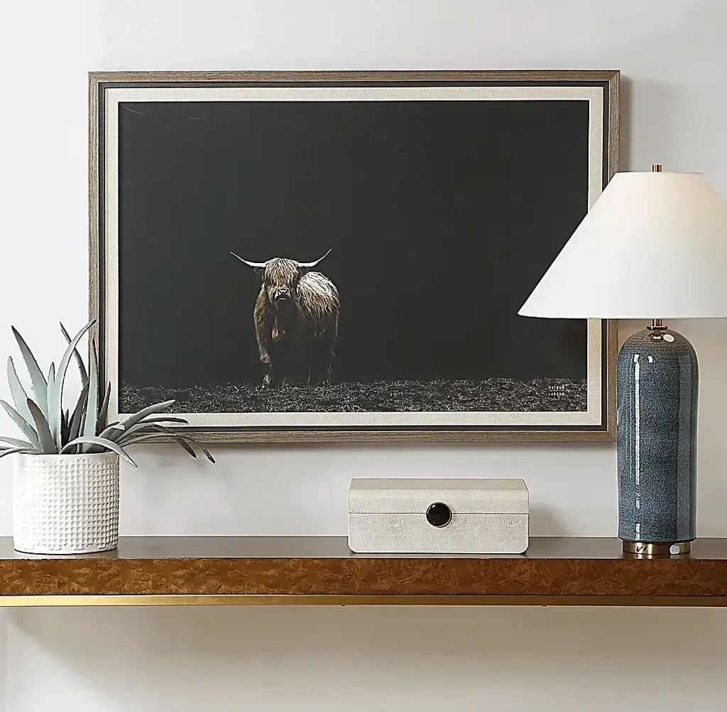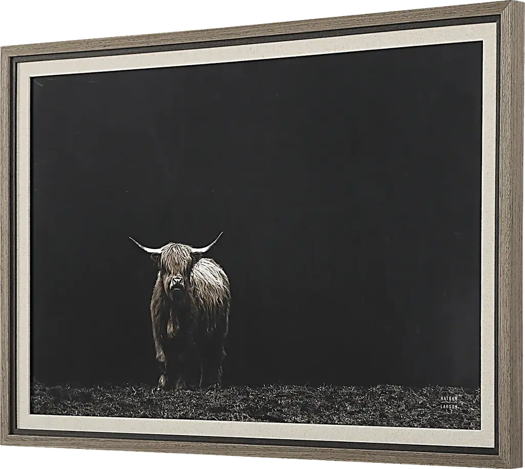 The Benta framed print features a captivating photograph of a lone highland cow set against a bold black background and complimented by a rustic wood tone frame and distressed black liner. Its striking composition and dramatic contrast make it a standout piece, perfect for adding a touch of rustic elegance to any space.