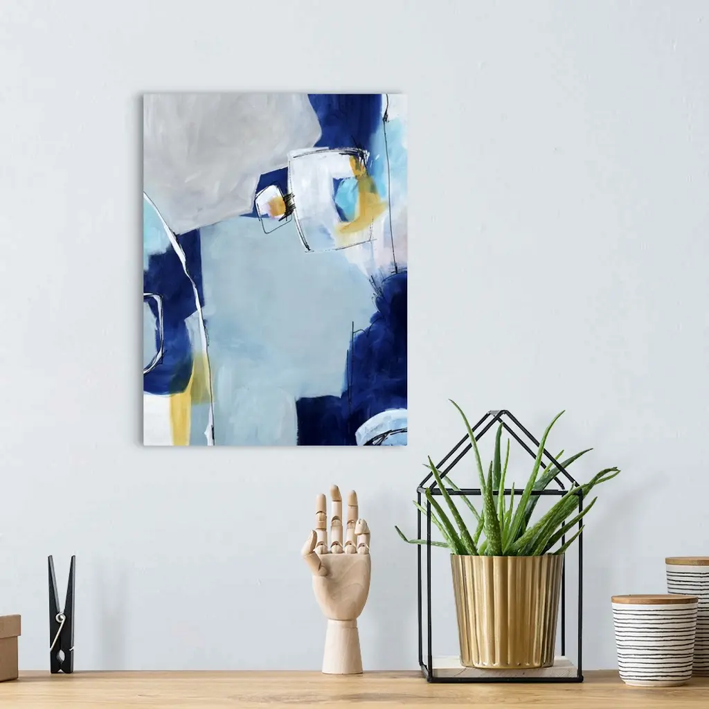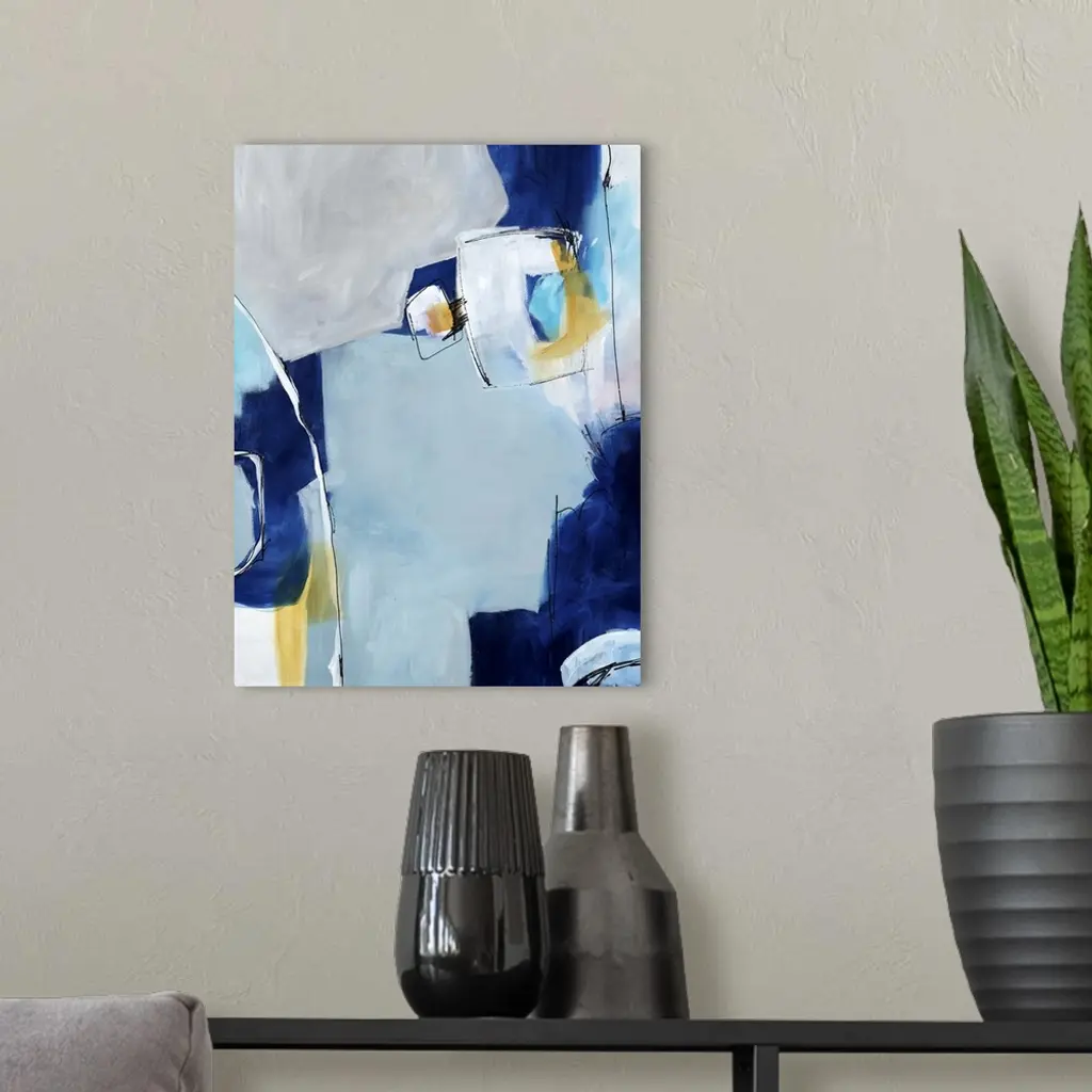 Contemporary abstract painting using blue tones and thin white lines sectioning off shapes.