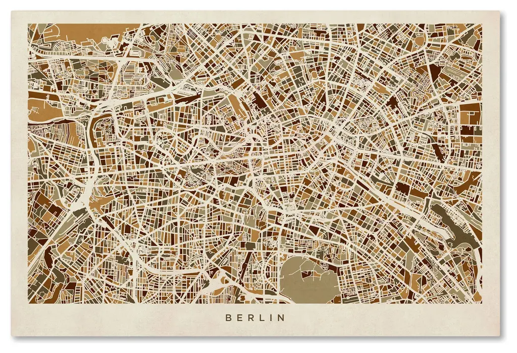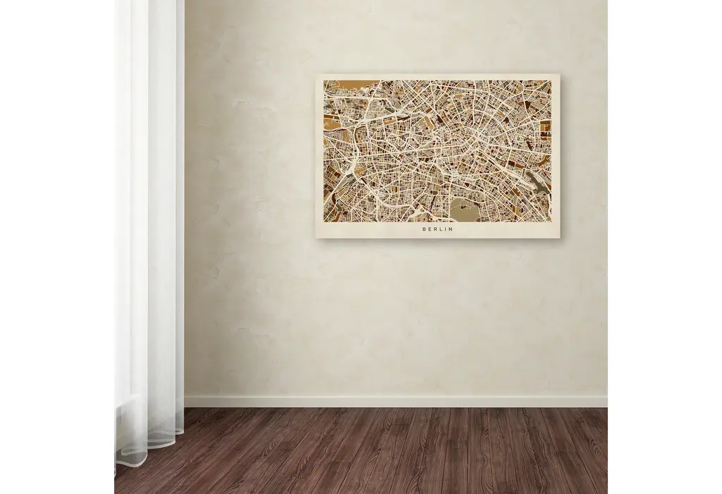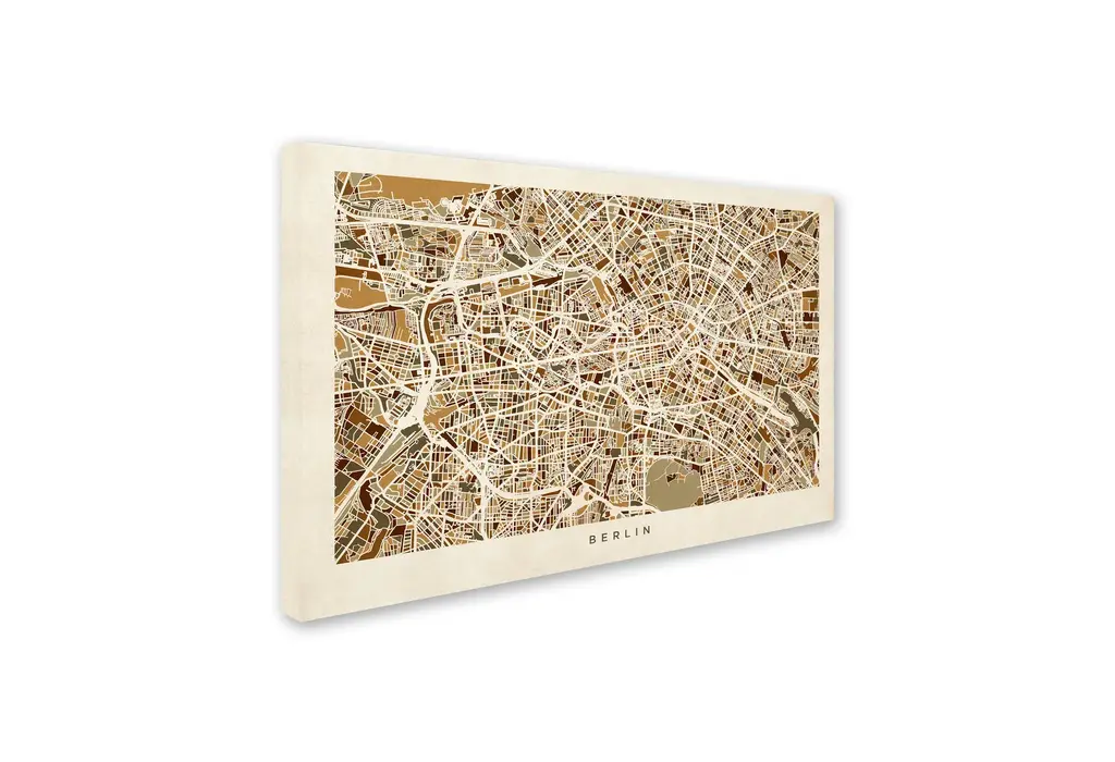 Title: Berlin, Germany Street MapArtist: Michael TompsettProduct Type: Canvas ArtSize: 16" x 24"Made in the USA.Art and design were always Michael's favorite subjects at school. He was fortunate to land a job as a graphic designer at one of London's most prestigious publishing companies after leaving University. After 12 highly enjoyable years Michael Tompsett made the decision to pursue a full-time career creating his own work. The freedom and time to be able to focus solely on his own projects has been a wonderful experience. Although Michael likes to experiment with different styles and subjects, his main focus is on map art. He enjoys looking for unique and interesting ways to depict something which is very familiar. Maps are visual representations of the world we live in, a world which is incredibly diverse. Apart from maps, Michael Tompsett creates urban landmark and cityscape designs.This 16" x 24" canvas art is ready to hang. Giclee (jee-clay) is an advanced printmaking process for creating high quality fine art reproductions. The attainable excellence that Giclee printmaking affords makes the reproduction virtually indistinguishable from the original piece. The result is wide acceptance of Giclee by galleries