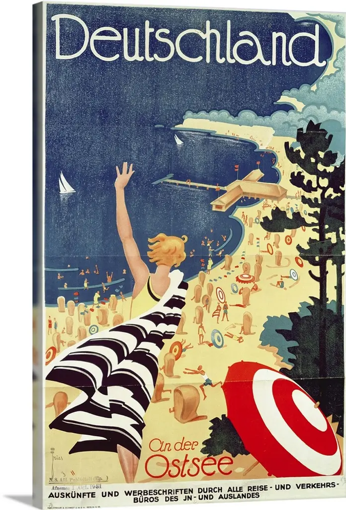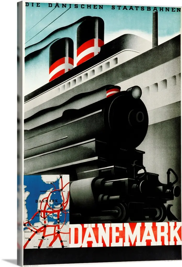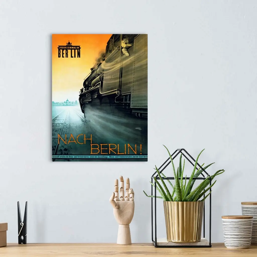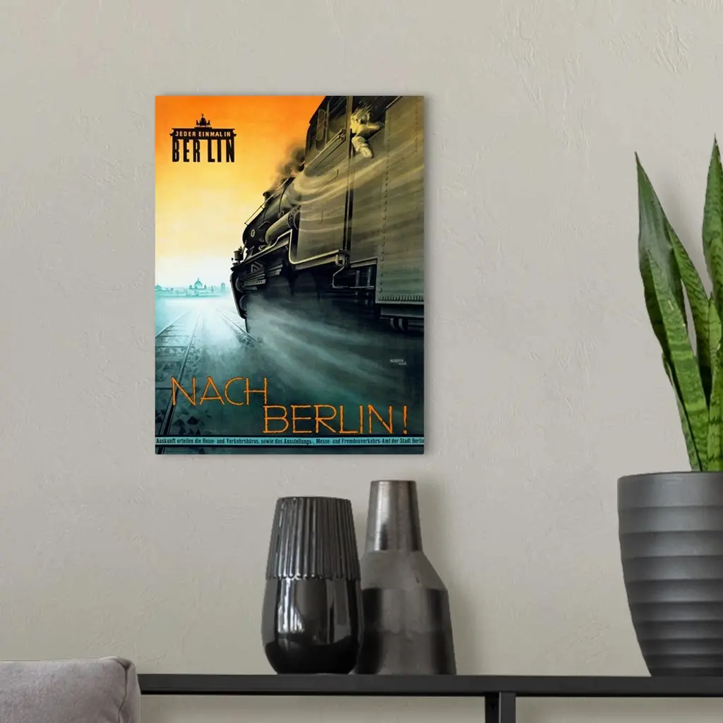 Vintage Nach Berlin poster with a speeding passenger train passing by towards the city.