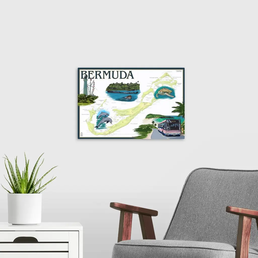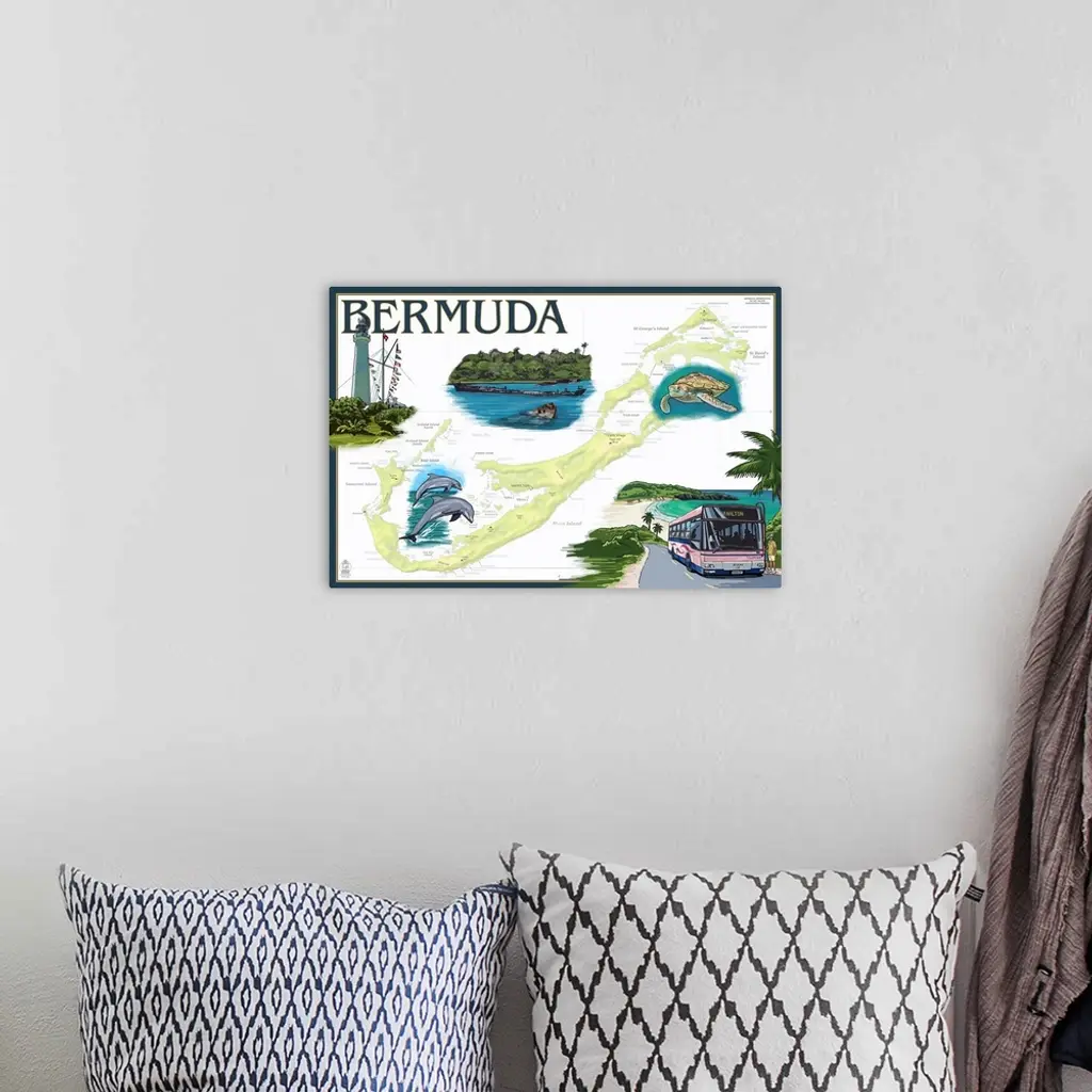 Retro stylized art poster of a map with dolphins and other sights of the location.