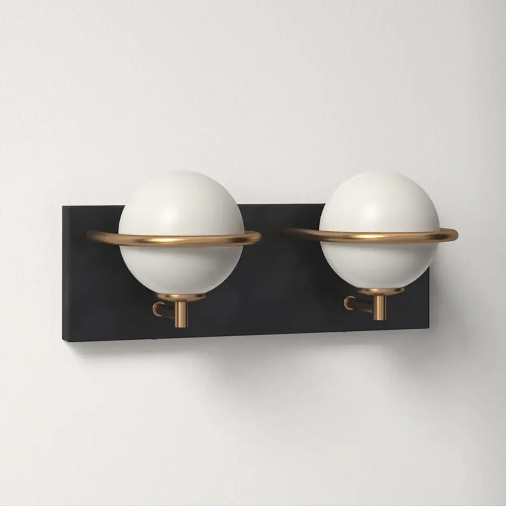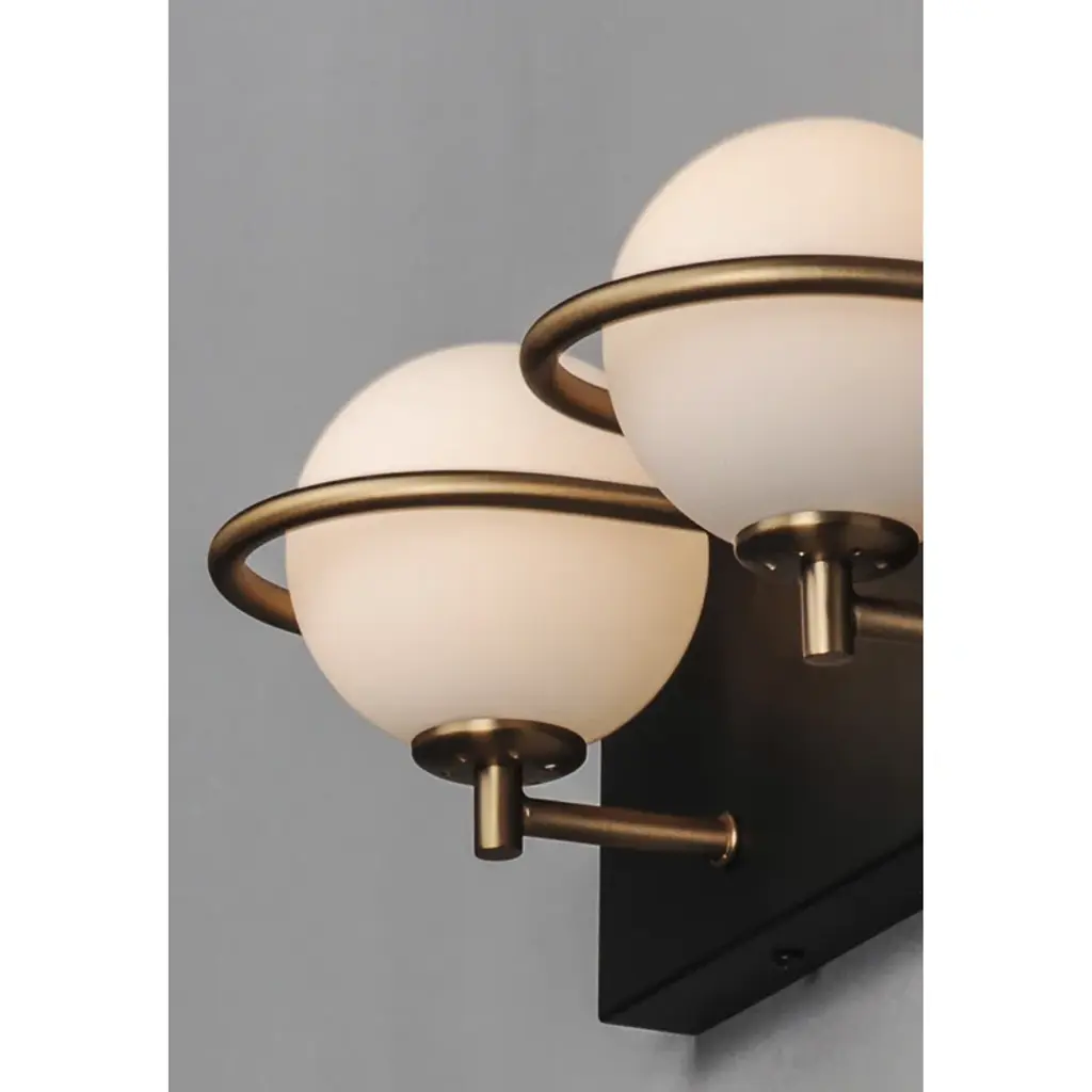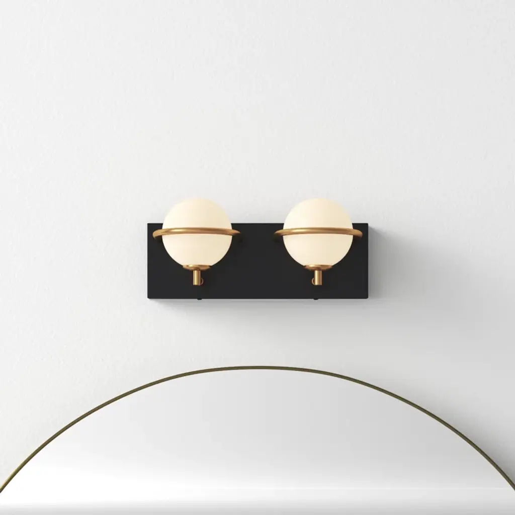 Simple lines + bold contrast. This vanity light’s two frosted glass globe shades nest behind gold-tone arches, which pop dramatically against the rectangular silhouette + black finish of the steel backplate. It mounts facing up or down, and includes long-lasting – and replaceable – LED bulbs.
