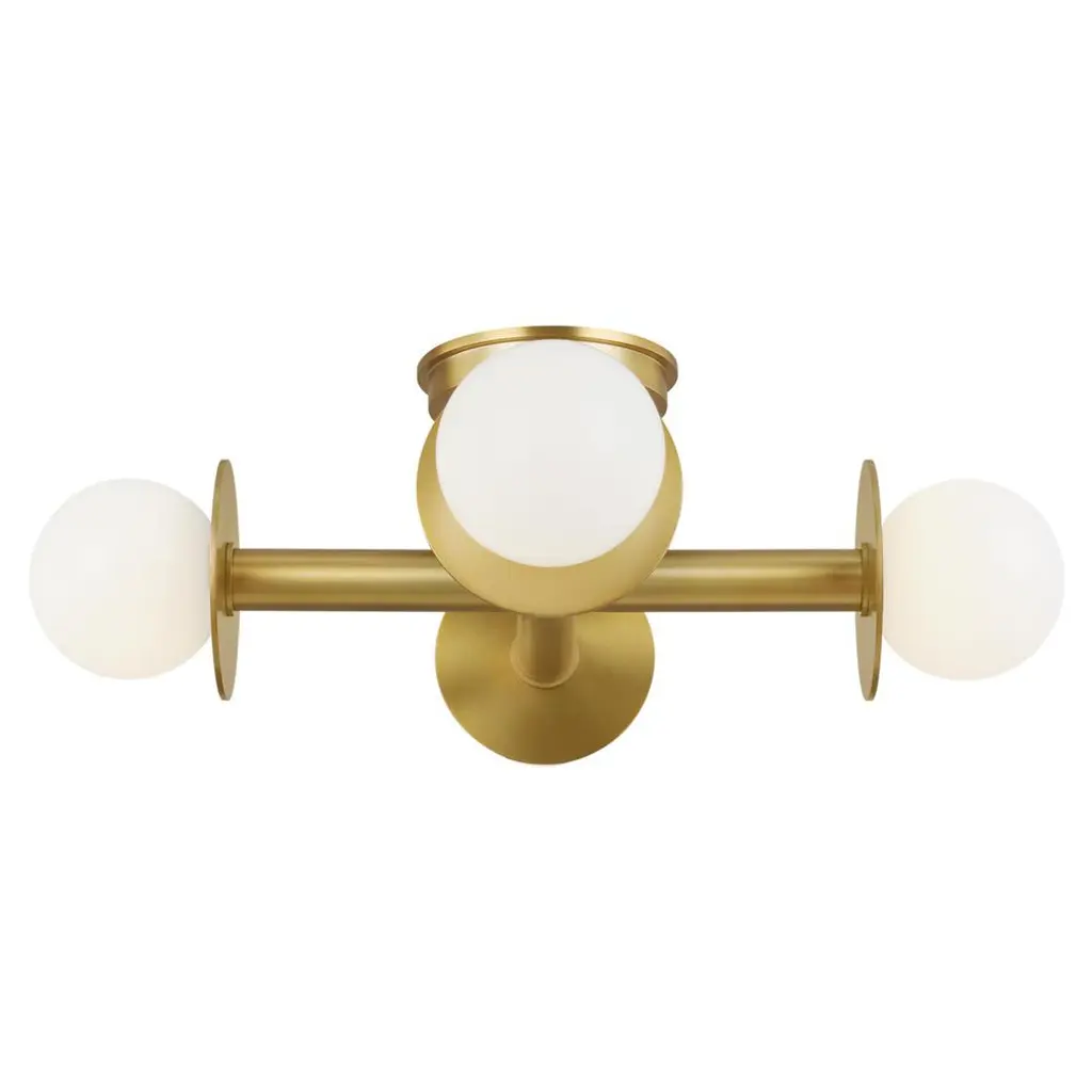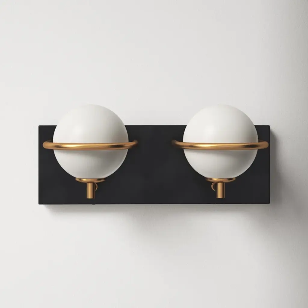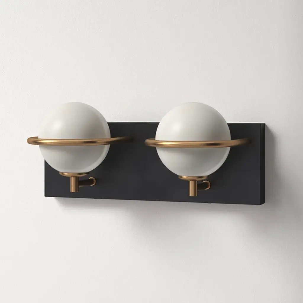 Simple lines + bold contrast. This vanity light’s two frosted glass globe shades nest behind gold-tone arches, which pop dramatically against the rectangular silhouette + black finish of the steel backplate. It mounts facing up or down, and includes long-lasting – and replaceable – LED bulbs.