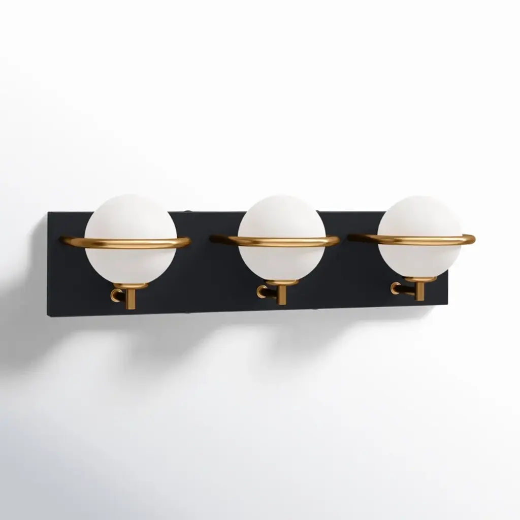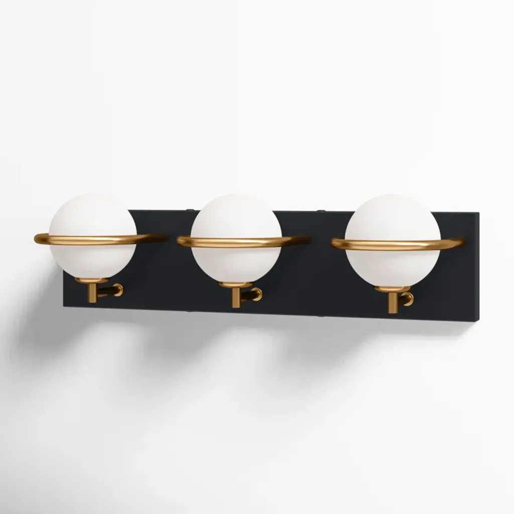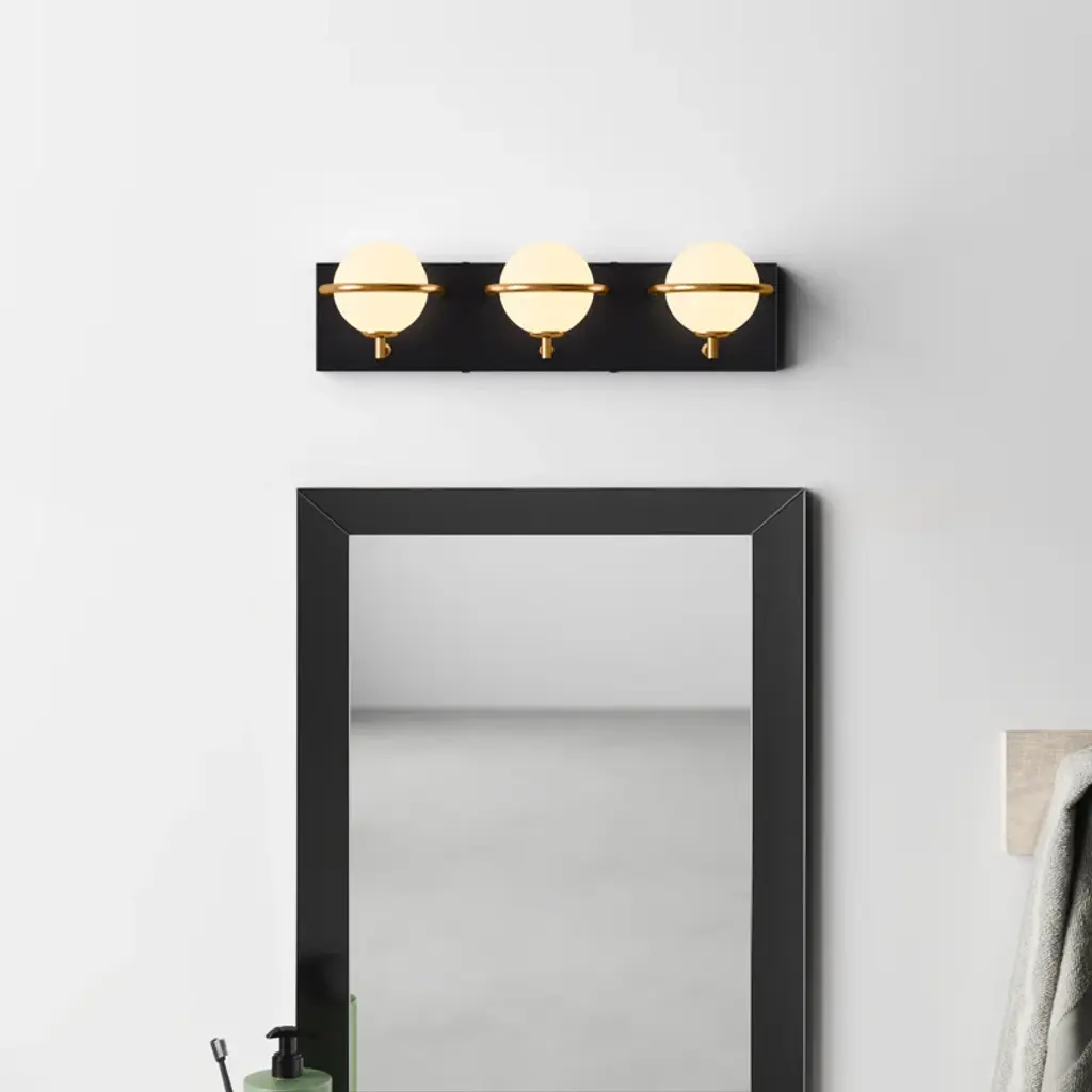 Simple lines + bold contrast. This vanity light’s three frosted glass globe shades nest behind gold-tone arches, which pop dramatically against the rectangular silhouette + black finish of the steel backplate. It mounts facing up or down, and includes long-lasting – and replaceable – LED bulbs.