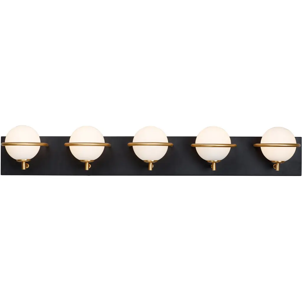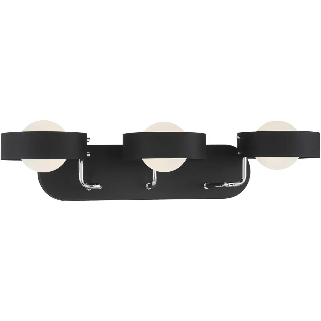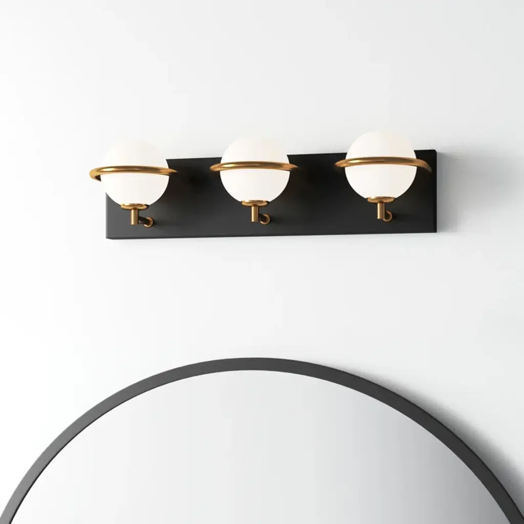 Simple lines + bold contrast. This vanity light’s three frosted glass globe shades nest behind gold-tone arches, which pop dramatically against the rectangular silhouette + black finish of the steel backplate. It mounts facing up or down, and includes long-lasting – and replaceable – LED bulbs.